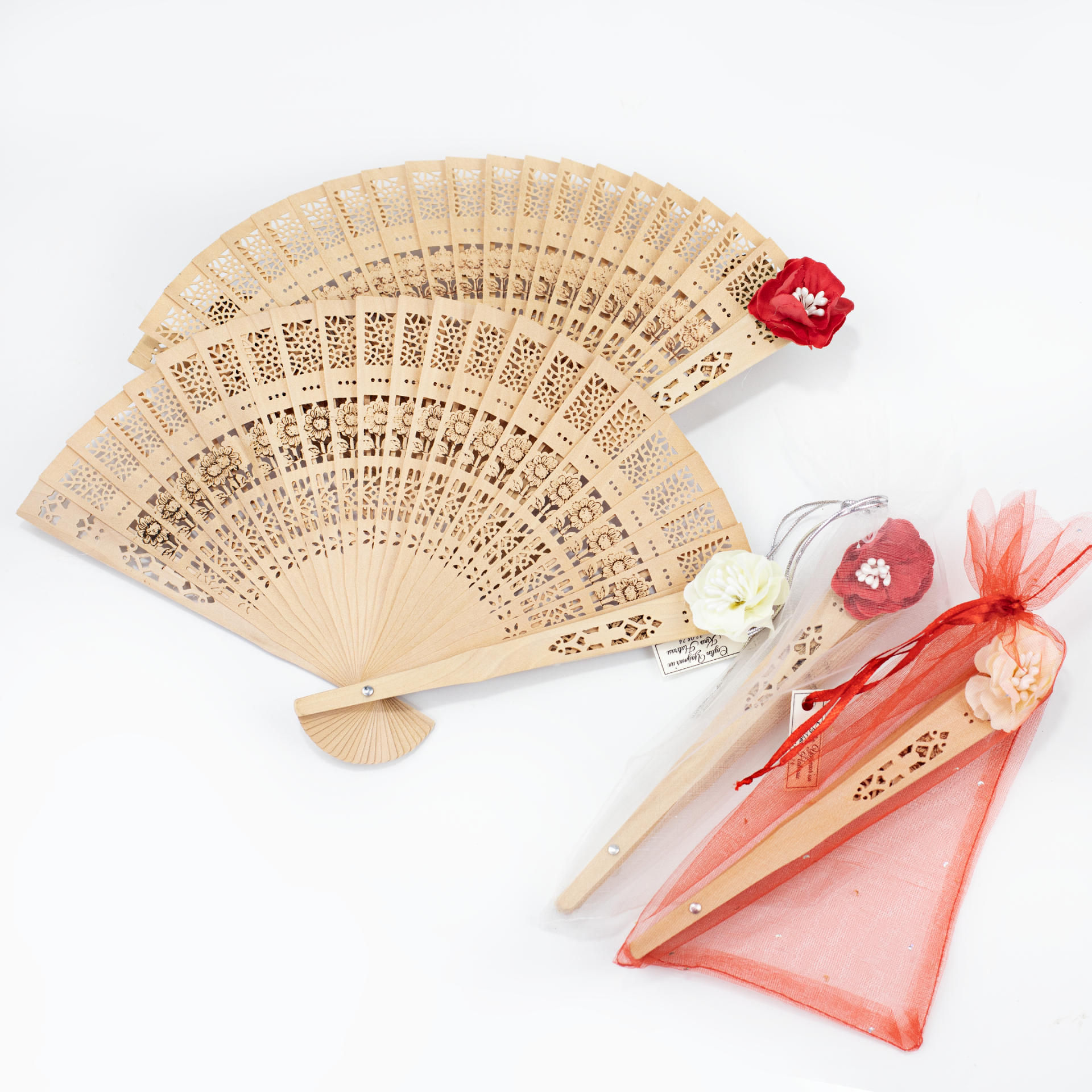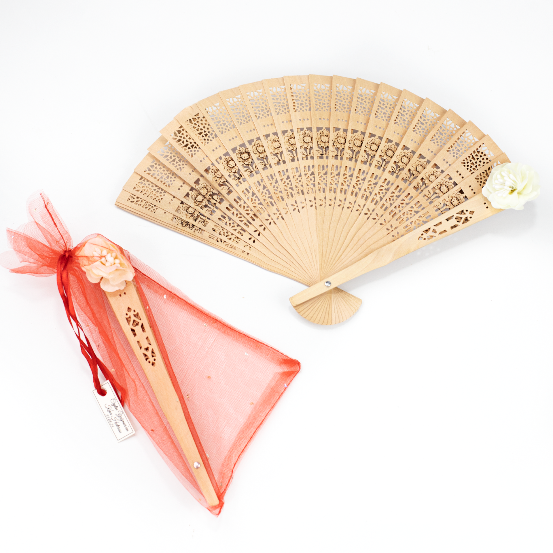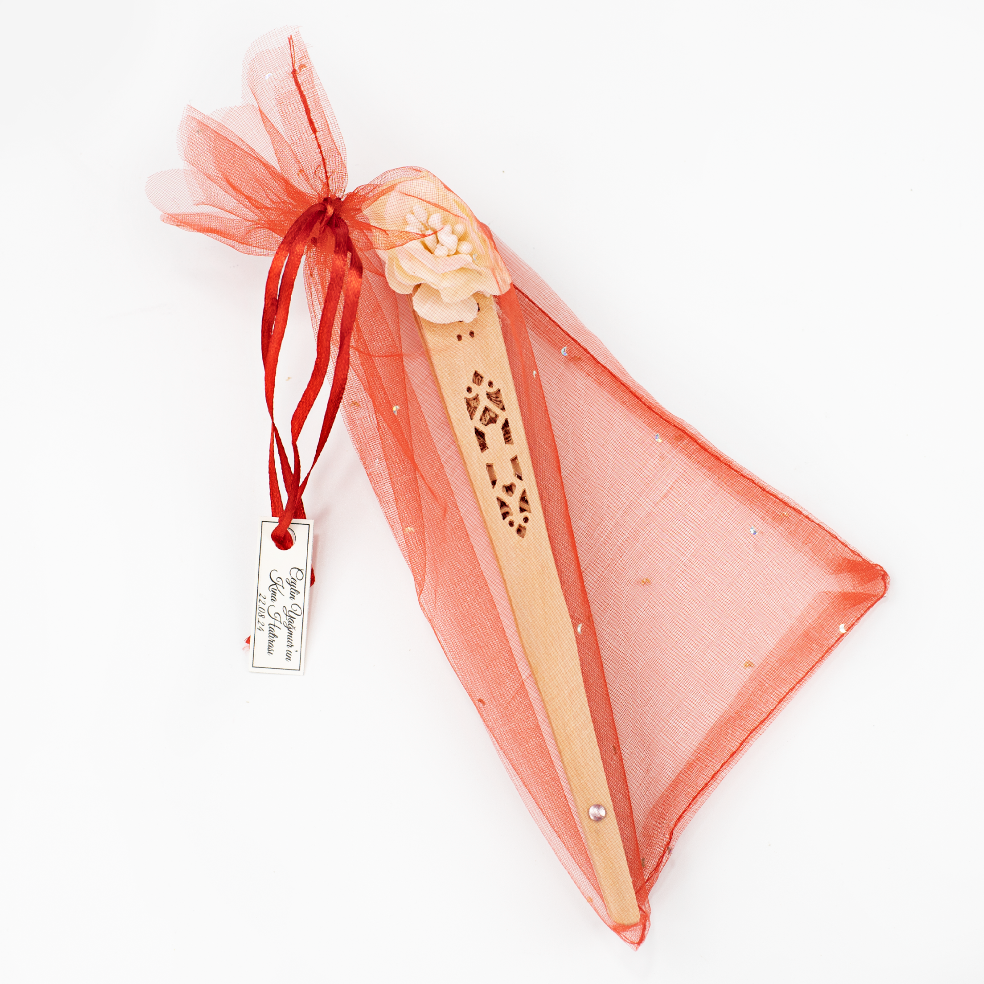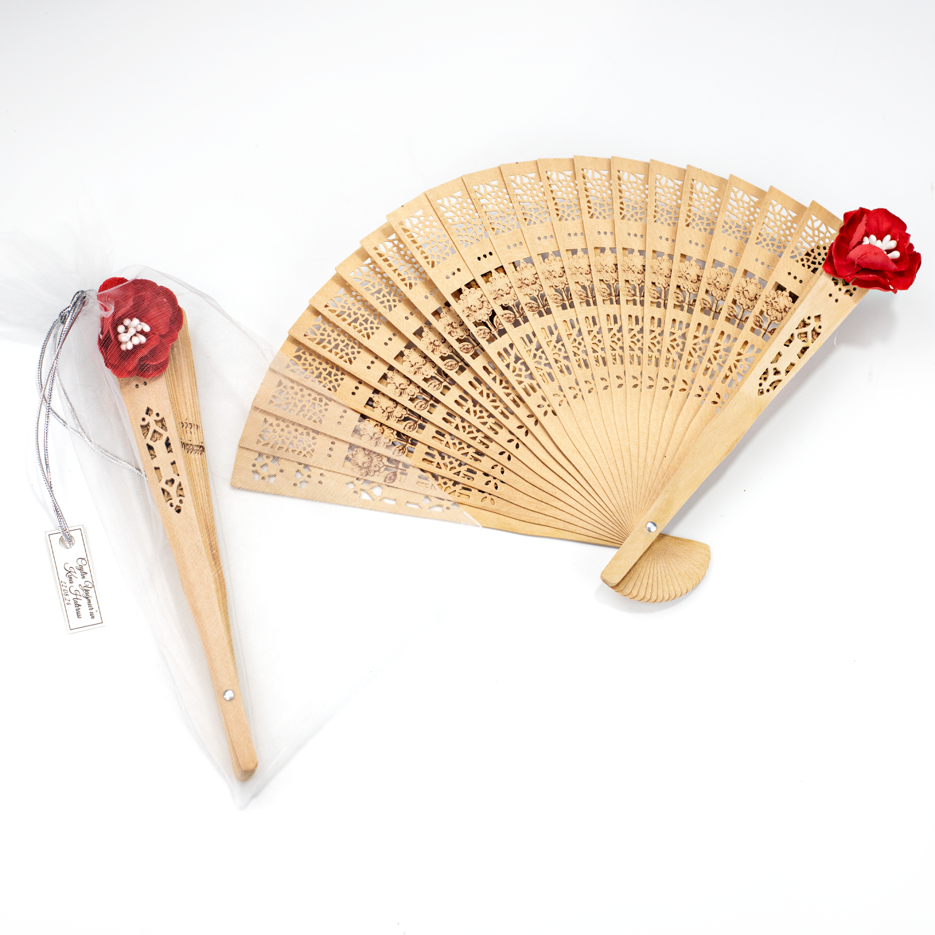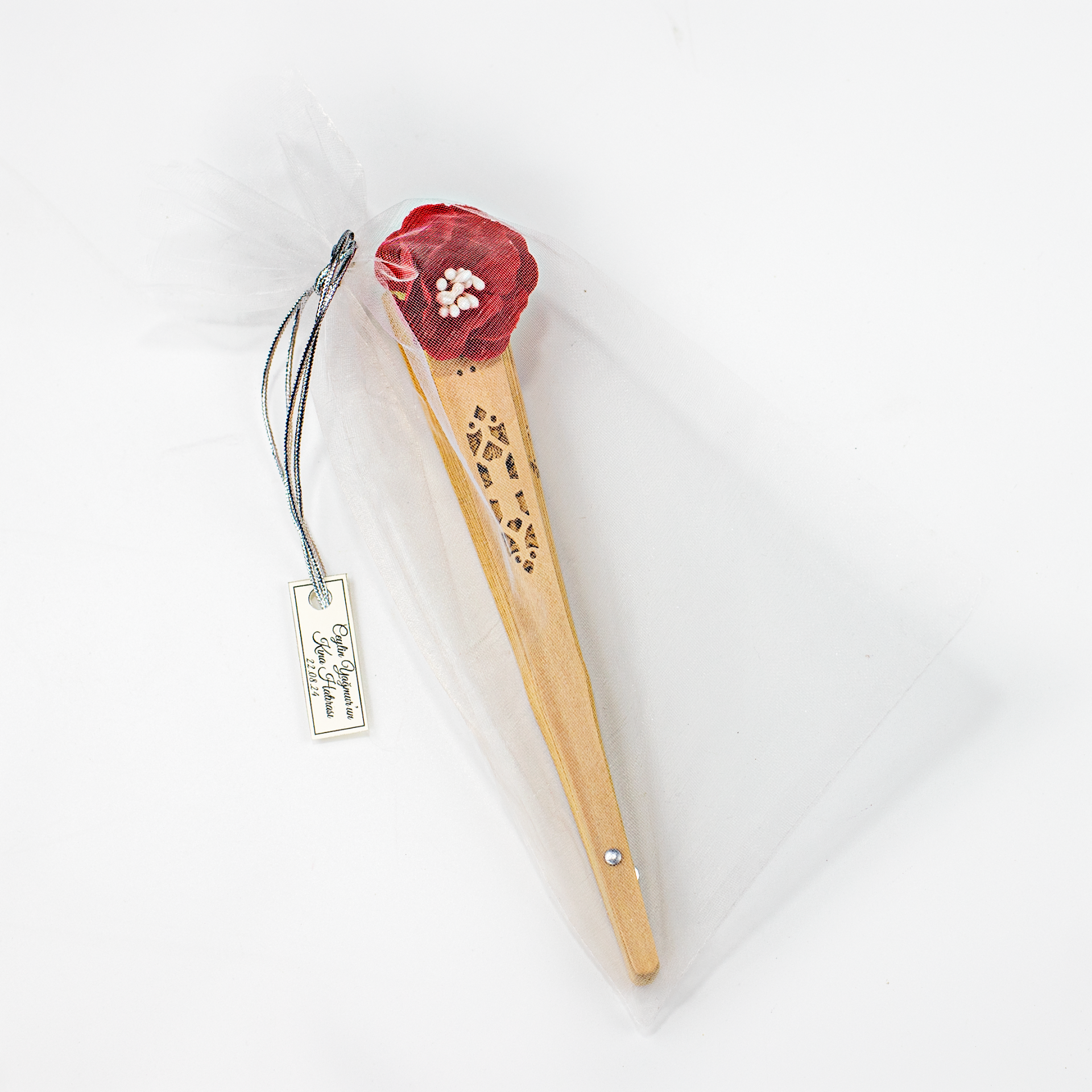 Tül kılıf içerisinde sunulan ahşap yelpaze, kırmızı veya beyaz çiçek süsleme seçenekleriyle kına gecesi başta olmak üzere söz, nişan, düğün, nikah, bekarlığa veda ve özel davetlerde şık bir aksesuar veya hediyelik olarak tercih edilebilir. Zarif tasarımı sayesinde organizasyon konseptine uyum sağlarken hatıra veya hediye olarak da değerlendirilebilir.