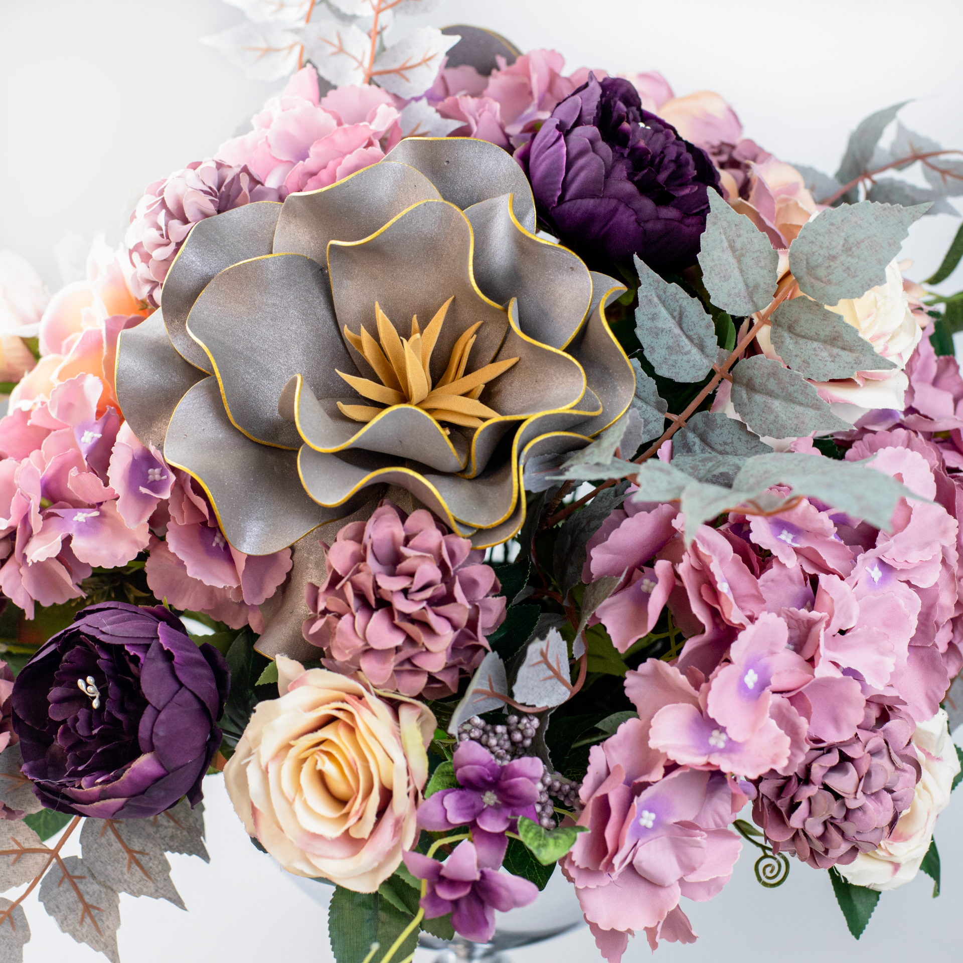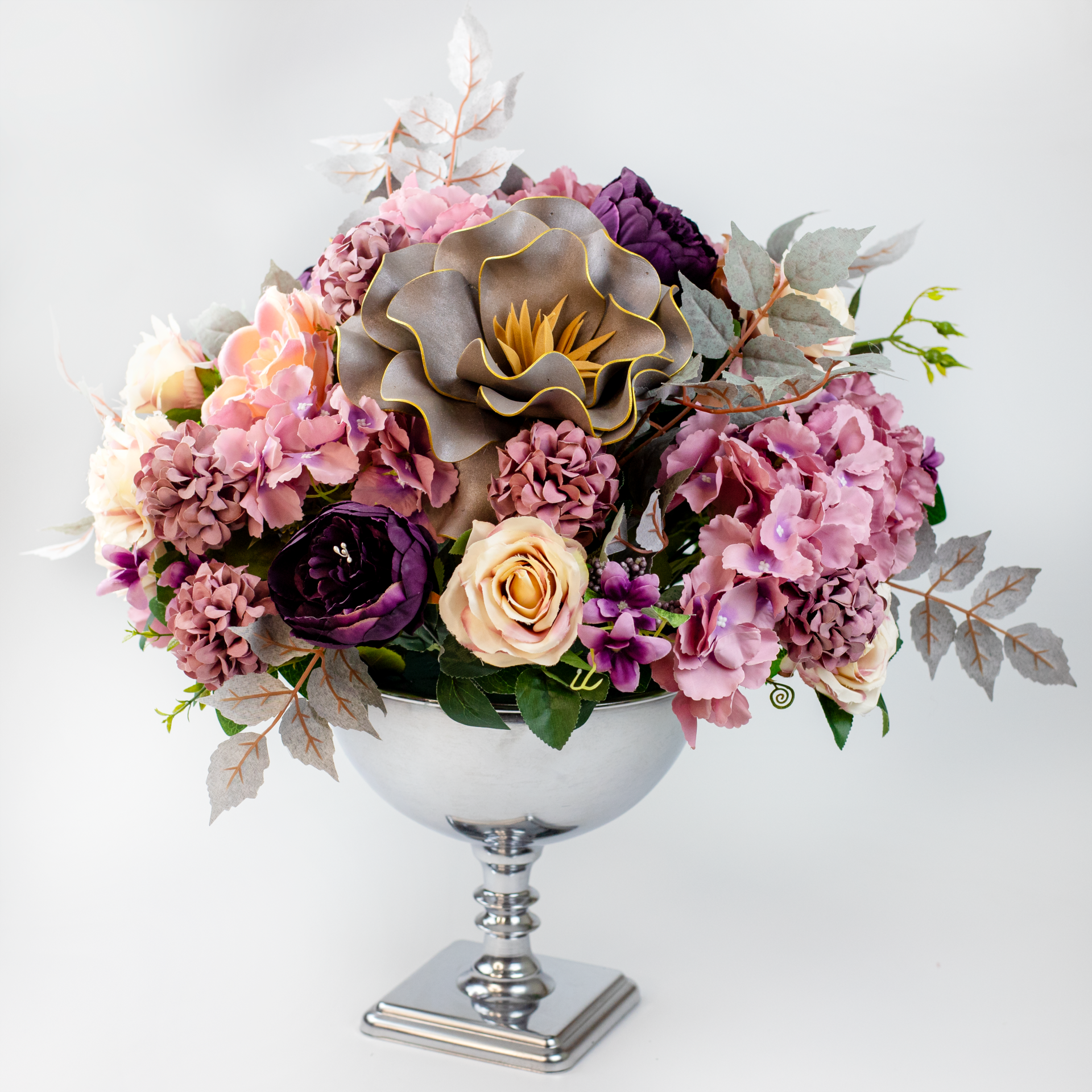 Gümüş ayaklı vazo tasarımı ve renkli çiçek aranjmanı sayesinde hem klasik hem modern organizasyon konseptlerine uyum sağlar. Masa üstü dekoru, arka fon süslemesi ve salon dekorasyonu için estetik bir görünüm sunar.