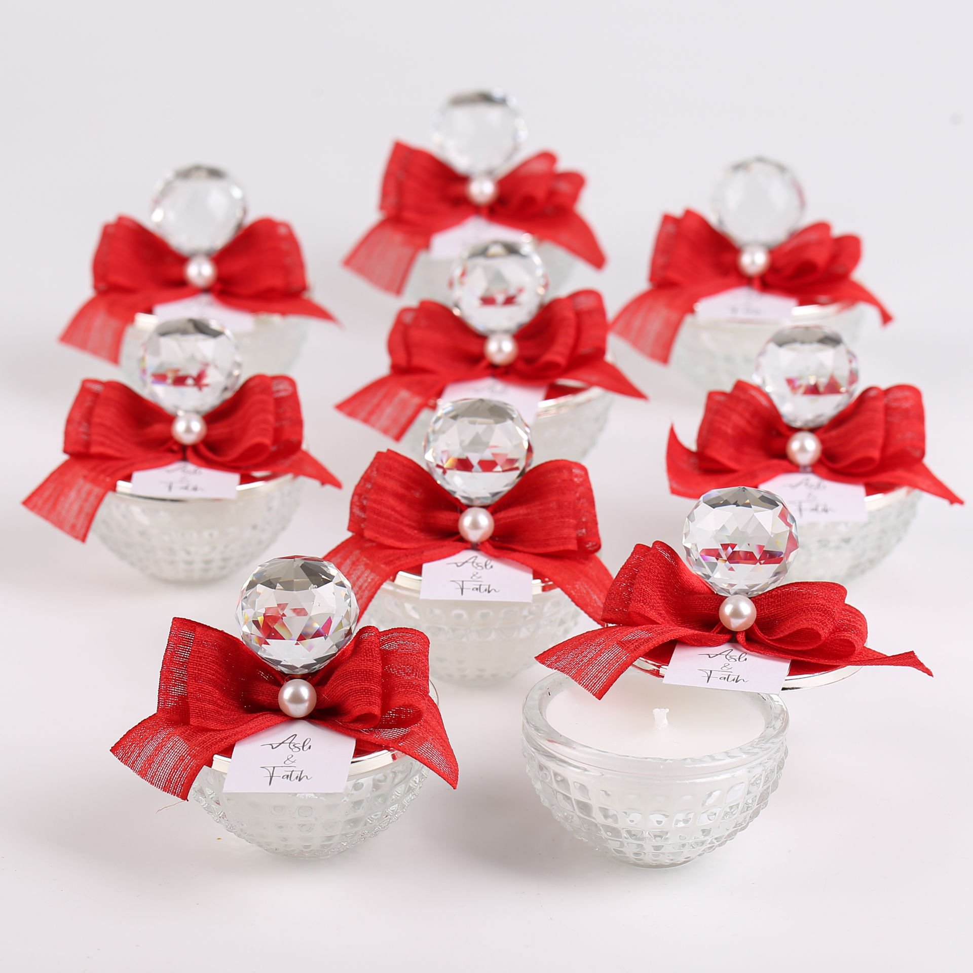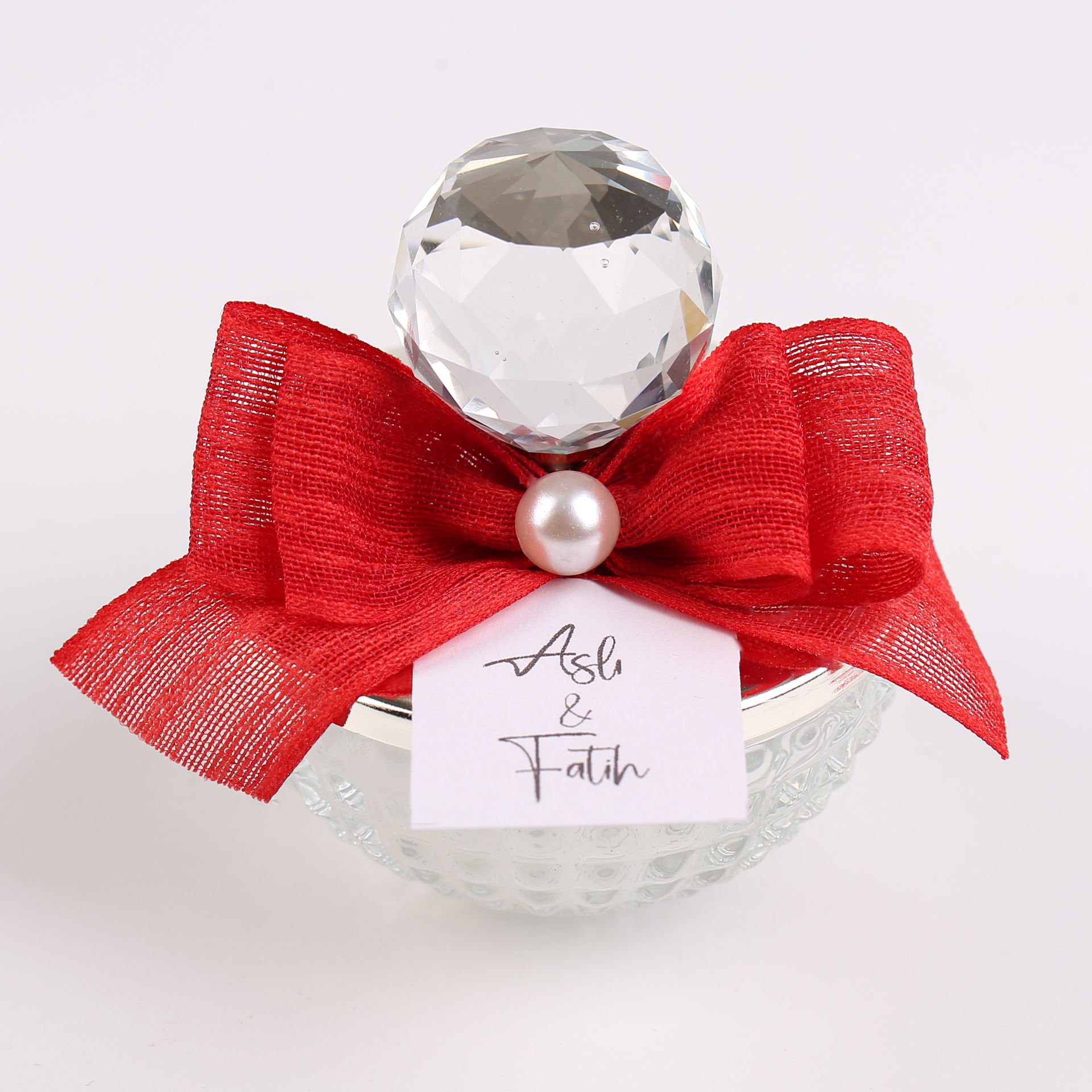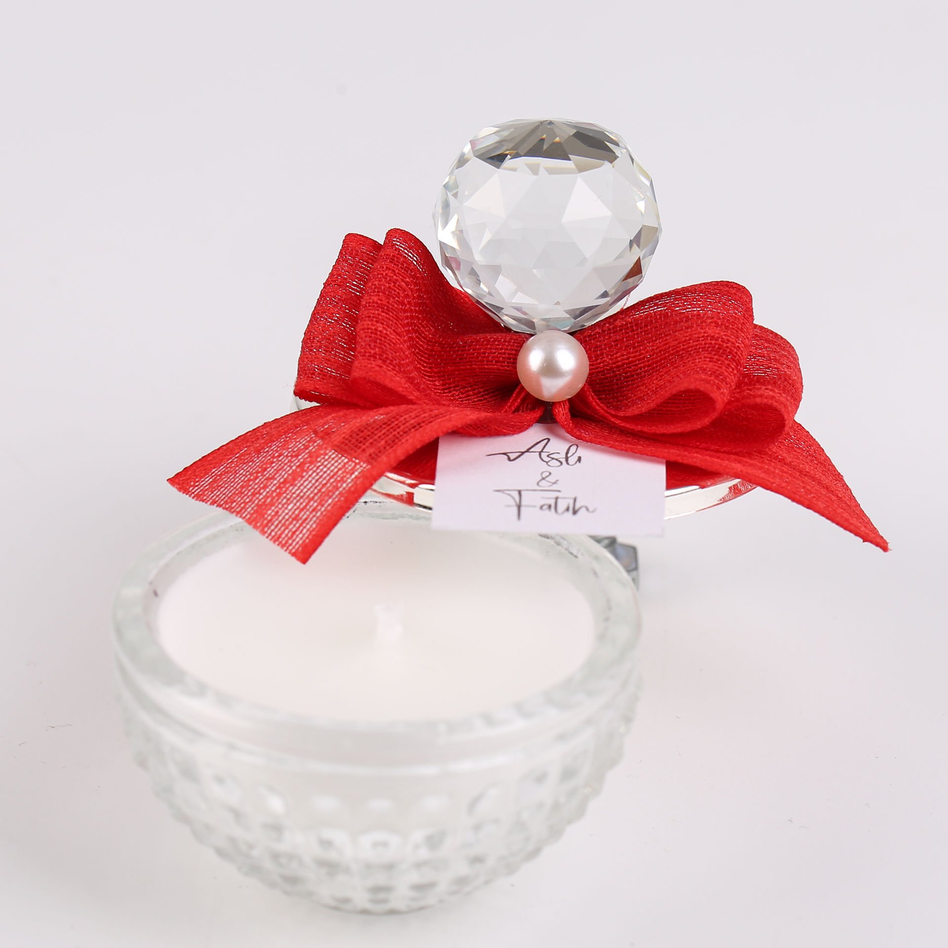 Baklava desenli yuvarlak cam şekerlik formunda hazırlanan mum; keten kurdele ve inci süsleme detaylarıyla doğal ve zarif bir hediyelik alternatifi sunar. Söz, nişan, nikah, düğün, kına, mevlit ve özel davetlerde dağıtılabilir, dekoratif amaçla da kullanılabilir. Şık tasarımı sayesinde uzun süre hatıra olarak saklanabilir.
