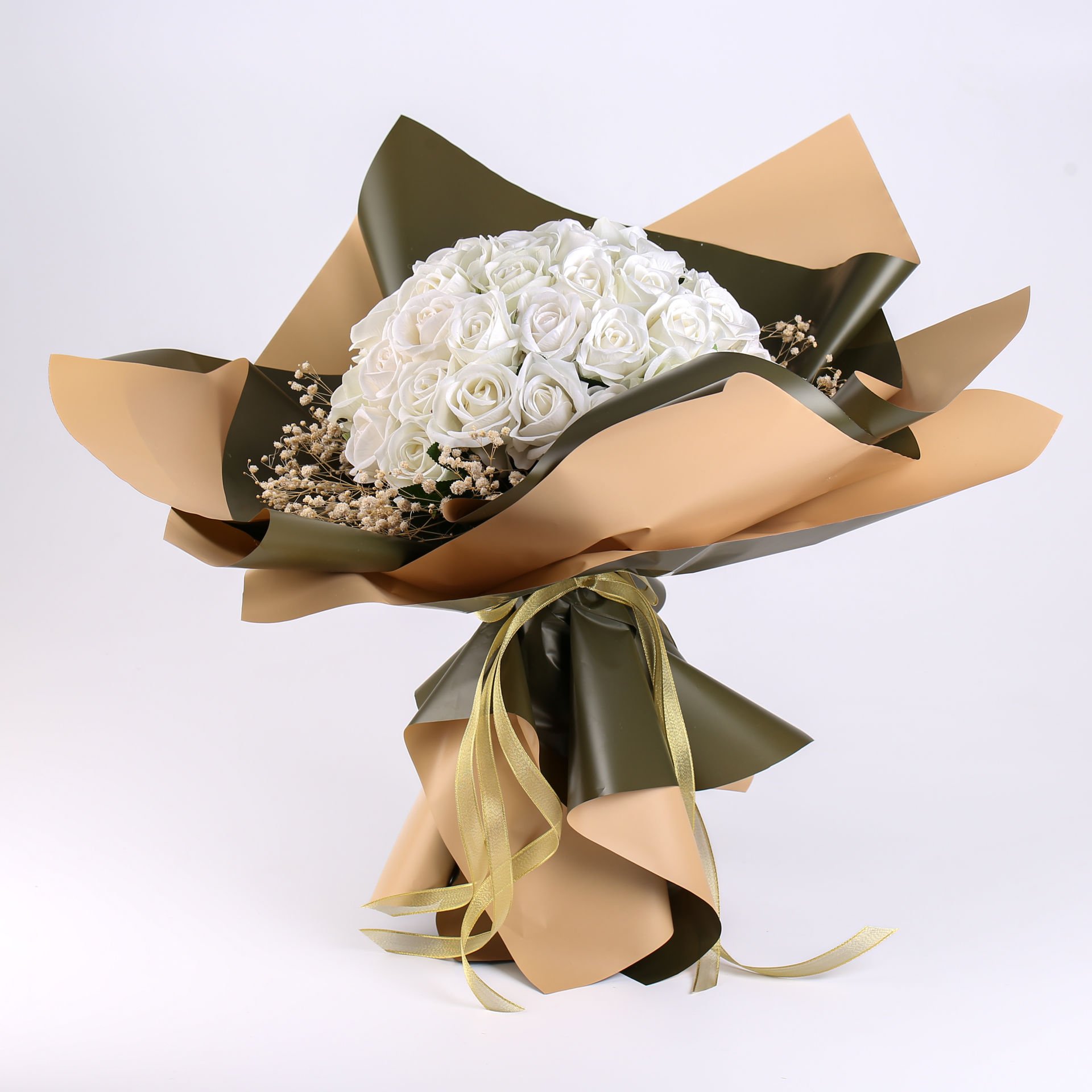 Beyaz Kadife Güllü Çiçek Buketi, 41 adet beyaz kadife gül içeriğiyle söz çiçeği, nişan buketi, isteme çiçeği ve özel gün hediyesi arayanlar için zarif bir alternatiftir. Kadife dokulu yapay gül tasarımı sayesinde hem kalıcı hem dekoratif bir görünüm sunar. Sevgiliye romantik hediye, yıl dönümü çiçeği, doğum günü çiçeği ve ev dekorasyon çiçek aramalarına uygundur. Gold veya gümüş renk seçeneği ile konsept uyumu sağlanarak nişan organizasyonu, söz merasimi ve özel davet dekorasyonlarında şık bir tamamlayıcı olarak tercih edilir.