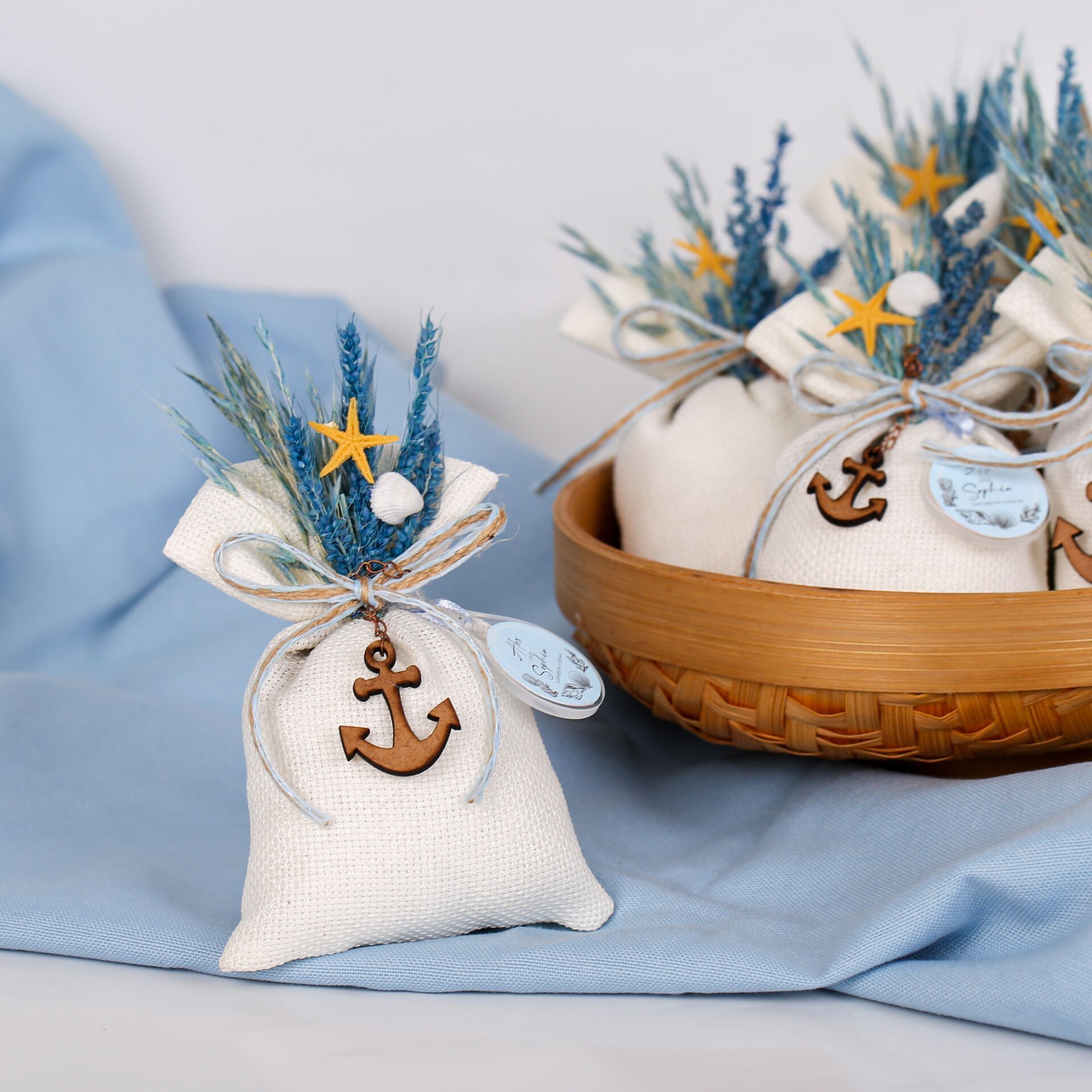 Beyaz linen kumaştan hazırlanan deniz konseptli kese; lavanta ve elyaf dolgusu ile hoş kokulu ve şık bir hediyelik alternatifi sunar. Deniz temalı süsleme detayları sayesinde söz, nişan, nikah, düğün, mevlit, baby shower ve özel davetlerde konseptinize uyum sağlar. Uzun süre saklanabilen dekoratif bir hatıra olarak da kullanılabilir.