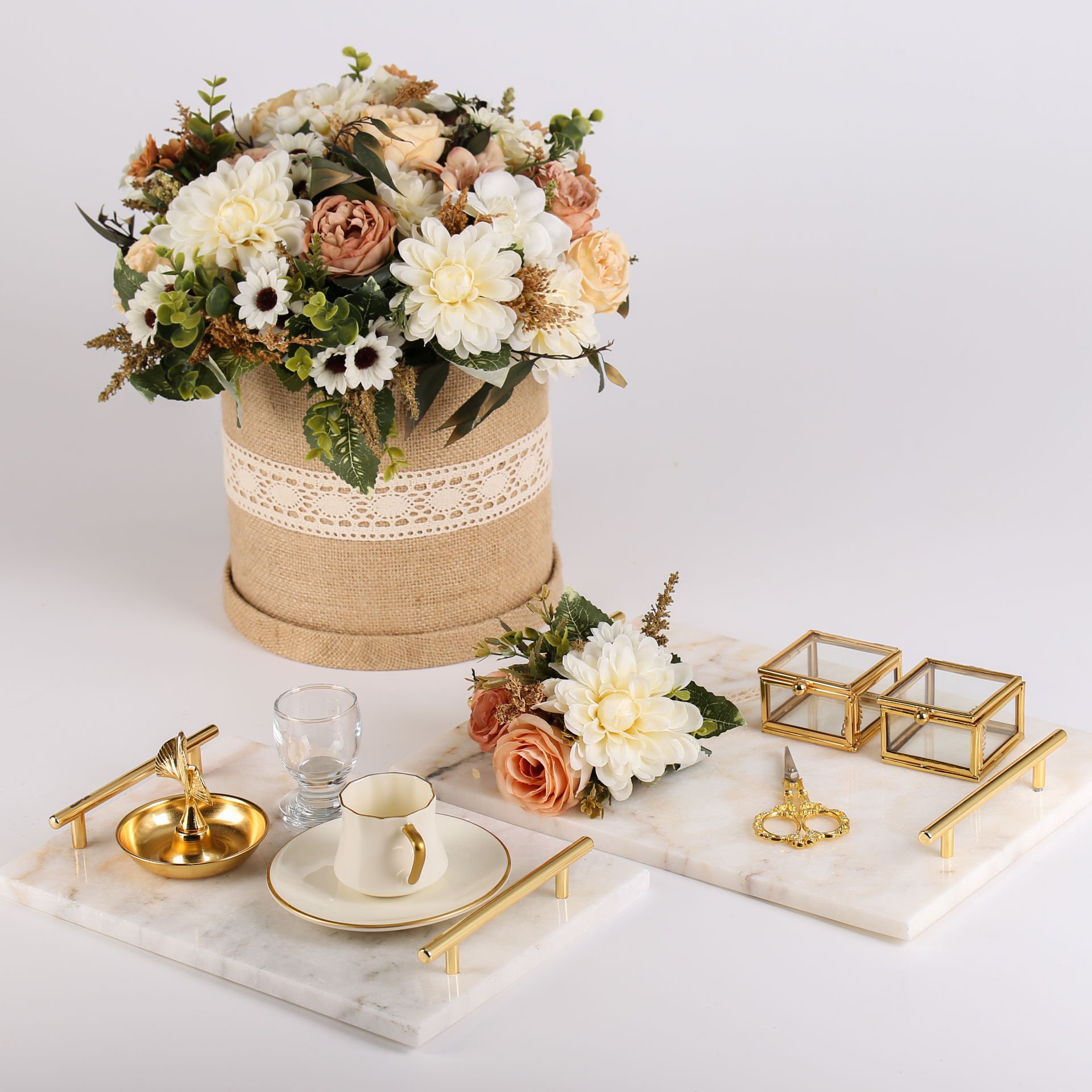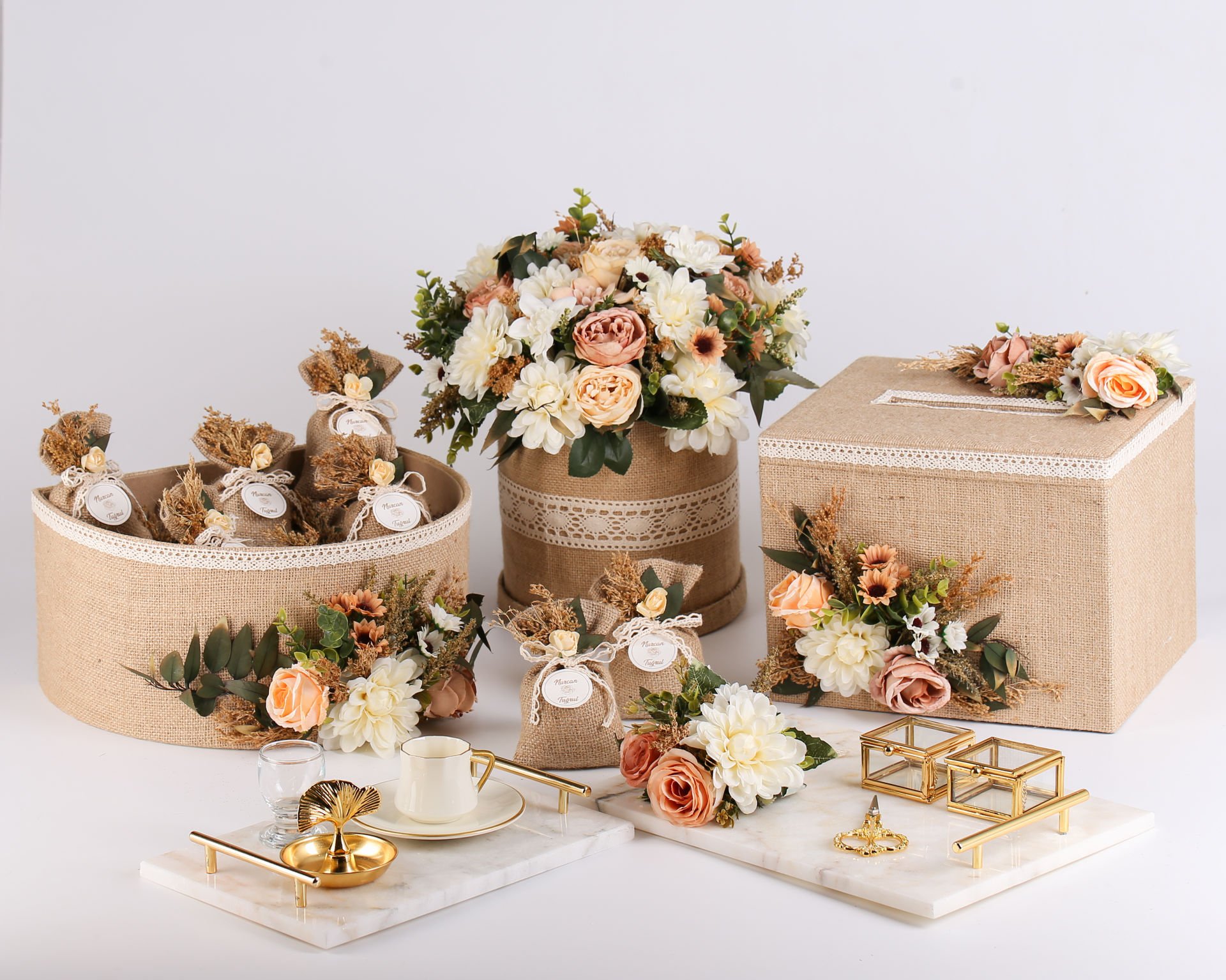 Jüt, dantel, gül ve kasımpatı çiçek detaylarıyla hazırlanan büyük söz ve nişan seti; doğal ve zarif konseptiyle söz, nişan ve isteme organizasyonlarında tüm ihtiyaçları bir arada sunan şık bir settir. Mermer & gold detaylı damat kahvesi ve söz tepsisi, uyumlu isteme çiçeği, takı kutusu ve hediyelik lavanta keseleriyle özel gününüzde bütünlük sağlar. Estetik tasarımı sayesinde hem dekoratif kullanım sunar hem de özel gününüzden kalıcı hatıralar oluşturur.