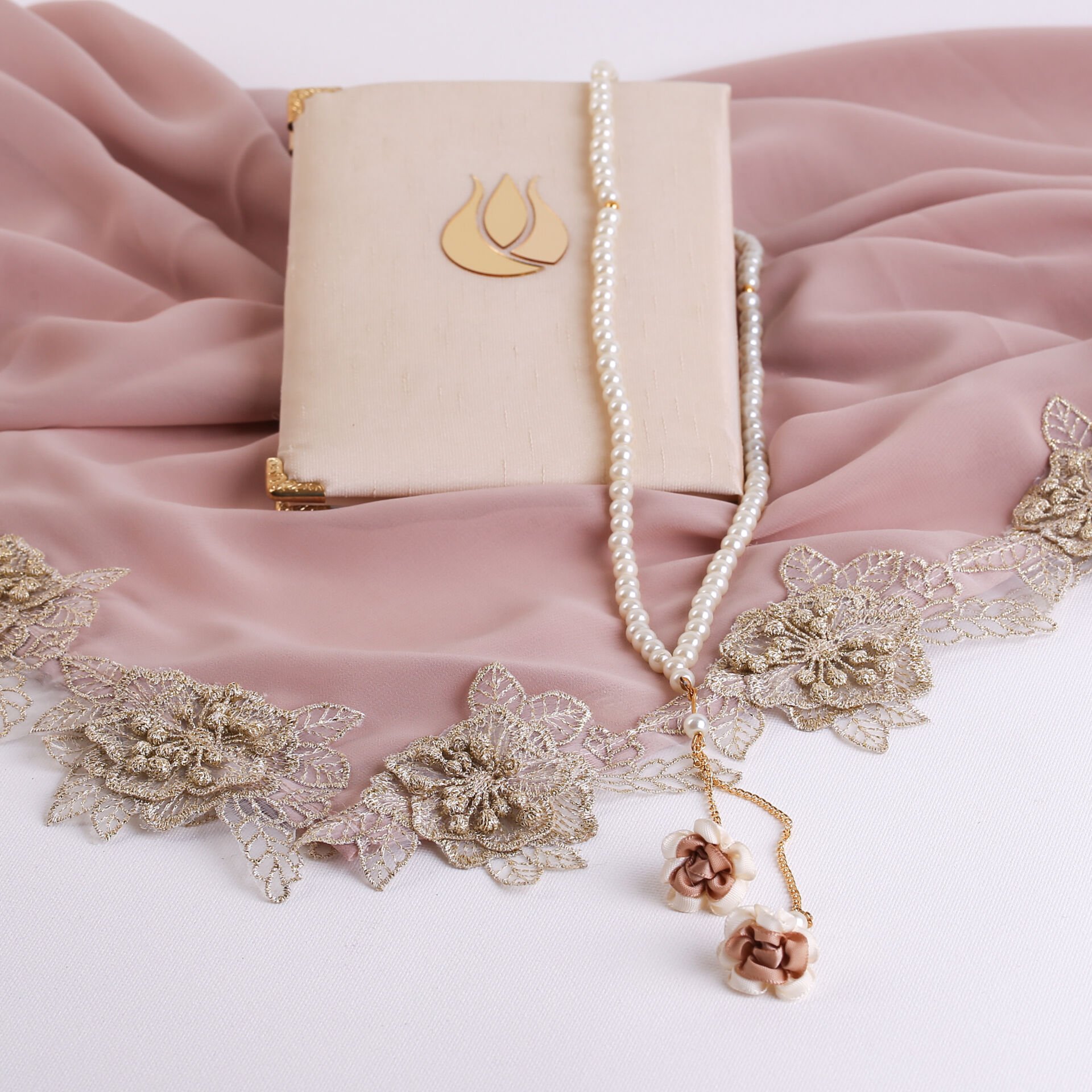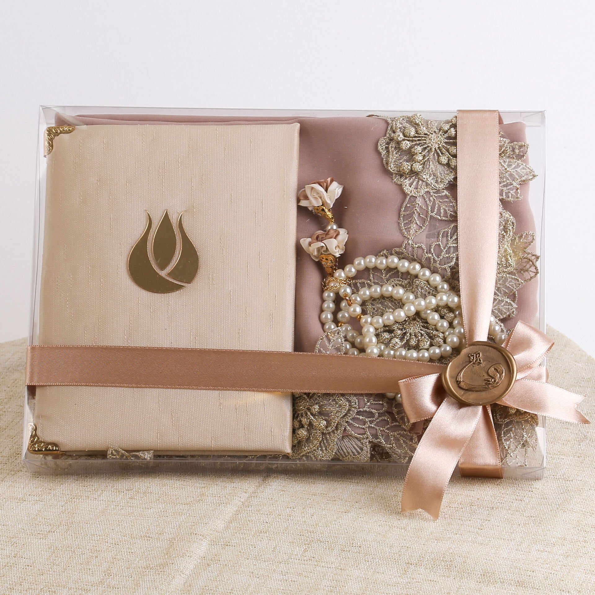 Özel gupürlü dantel kenarlı namaz başörtüsü detayı sayesinde zarif ve özenli bir görünüm sunar. Yasin kitabı ve inci tespih ile birlikte hazırlanmış set, hem dekoratif hem manevi değeri yüksek bir seçenektir. Asetat kutu, kurdele ve mühür süslemesi ile şık bir sunum sağlar.
