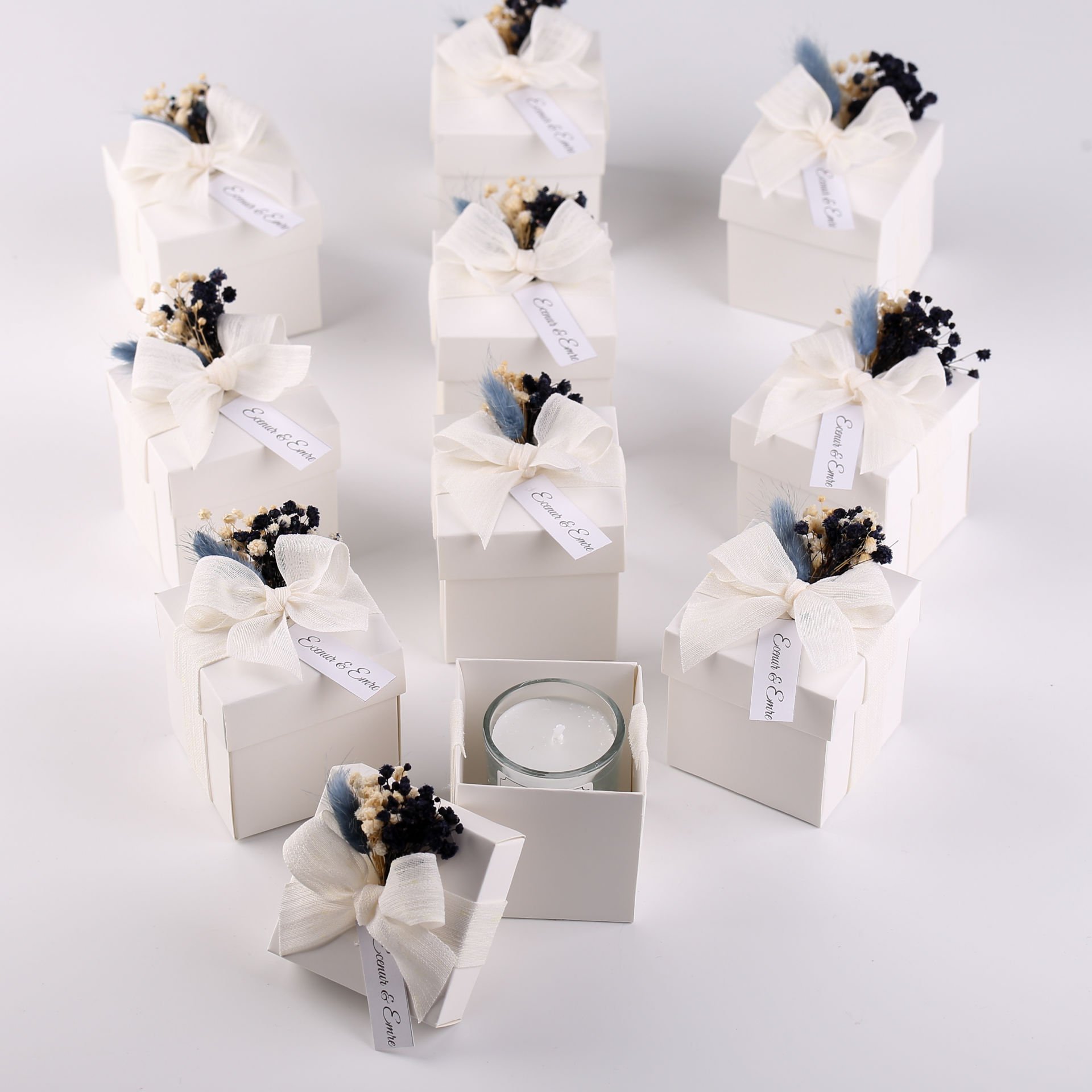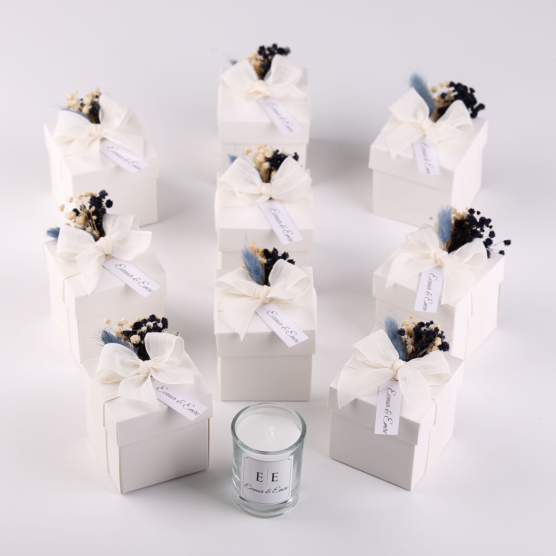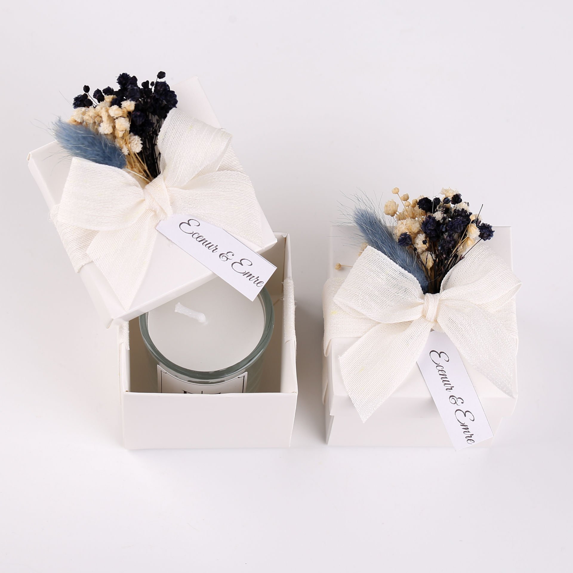 Zarif cam bardak mum, kuru çiçek süslemeleriyle şıklığını katlıyor ve beyaz kutu içerisinde sunuluyor. Küçük cam bardak mum, özel günlerde, düğün, nişan ve diğer organizasyonlarda hem dekoratif bir öğe hem de misafirlere verilebilecek şık bir hediye alternatifi sunar. Farklı kurdele renk seçenekleri ile kişiselleştirilebilir ve organizasyonunuza uyum sağlar.