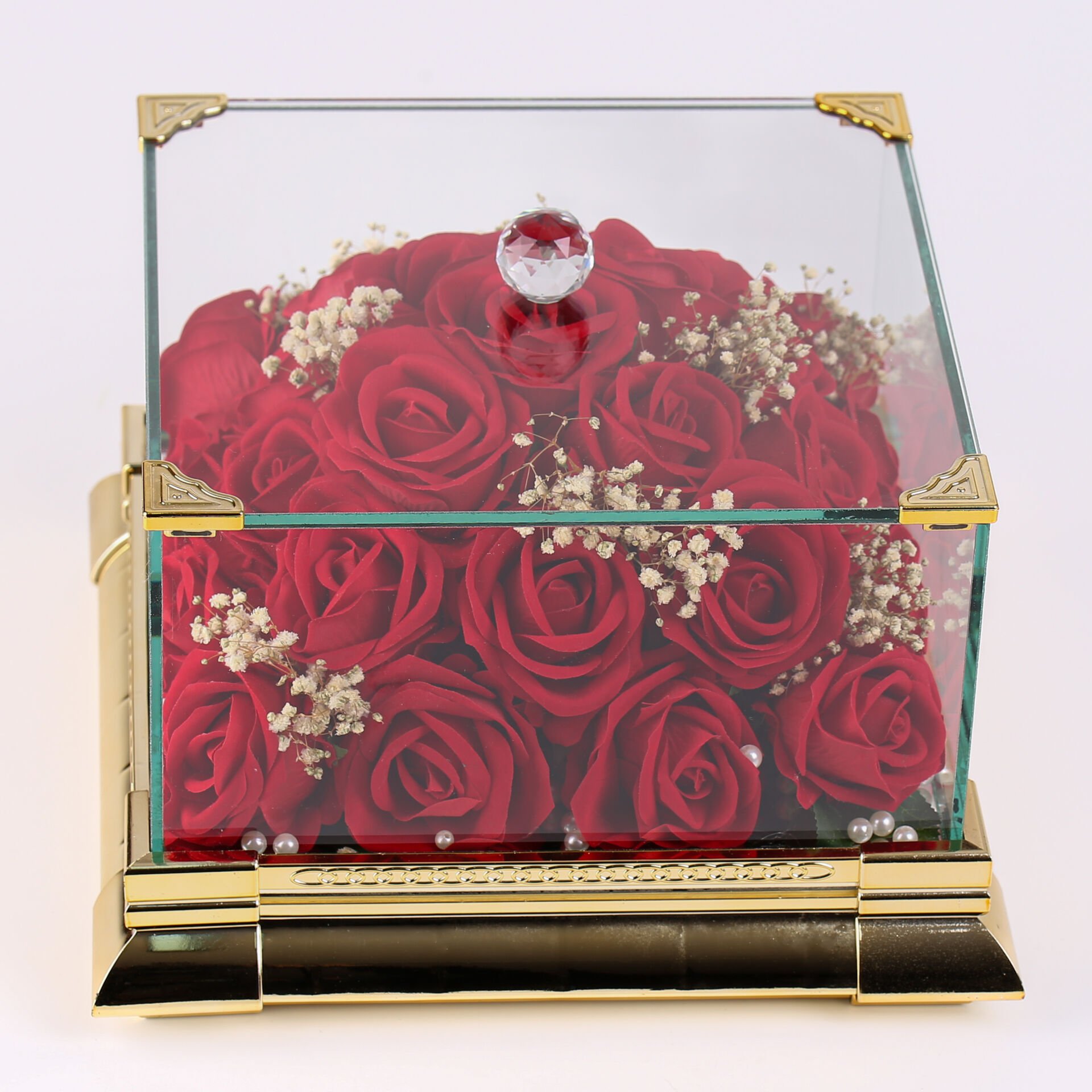 Cam sandık içerisinde hazırlanan kırmızı güller; şık ve romantik görünümüyle söz, nişan, isteme, yıldönümü, doğum günü ve özel gün organizasyonlarında anlamlı bir hediye ve dekoratif bir tamamlayıcı olarak tercih edilebilir. Zarif tasarımı sayesinde bulunduğu ortama estetik bir dokunuş katar ve uzun süre hatıra olarak saklanabilir.