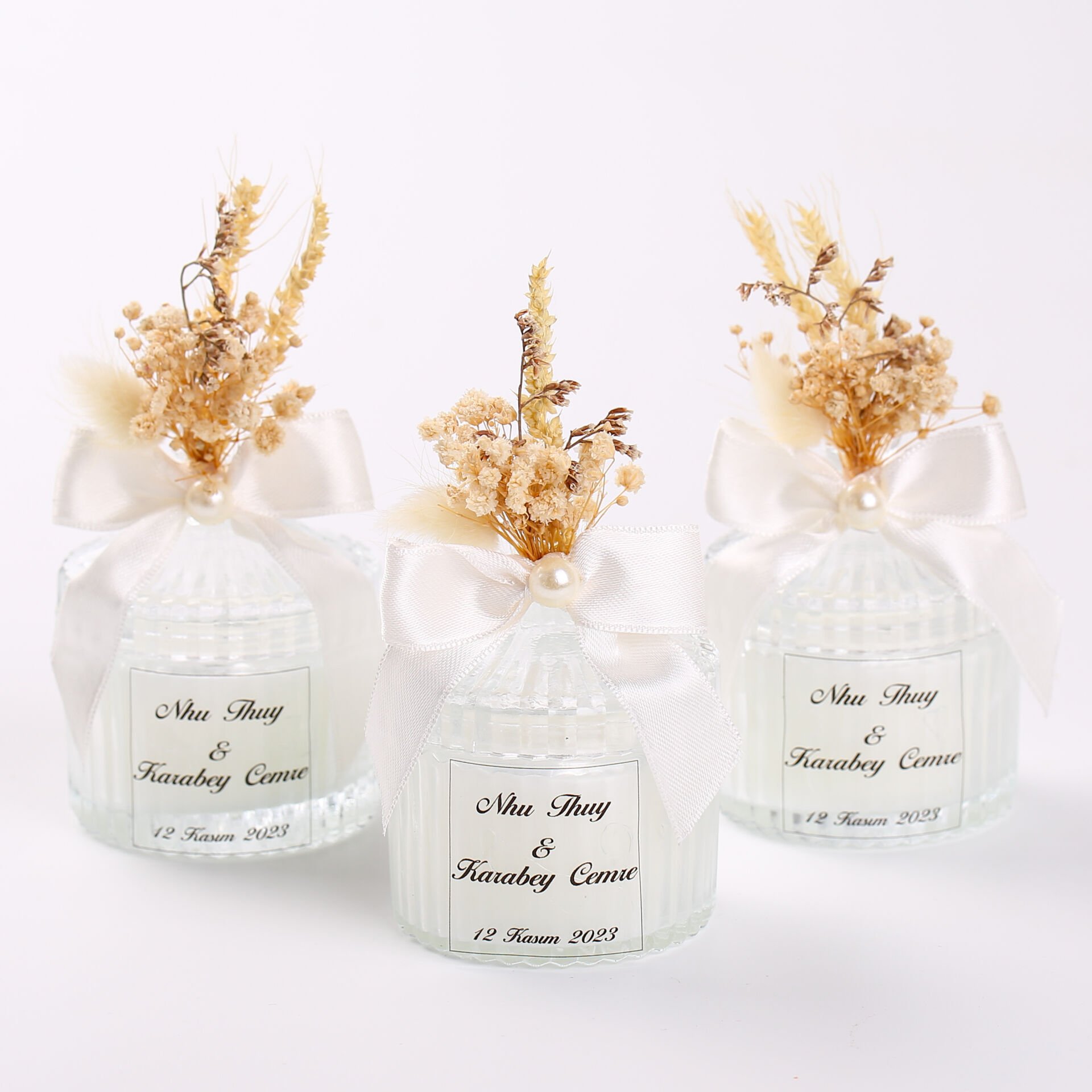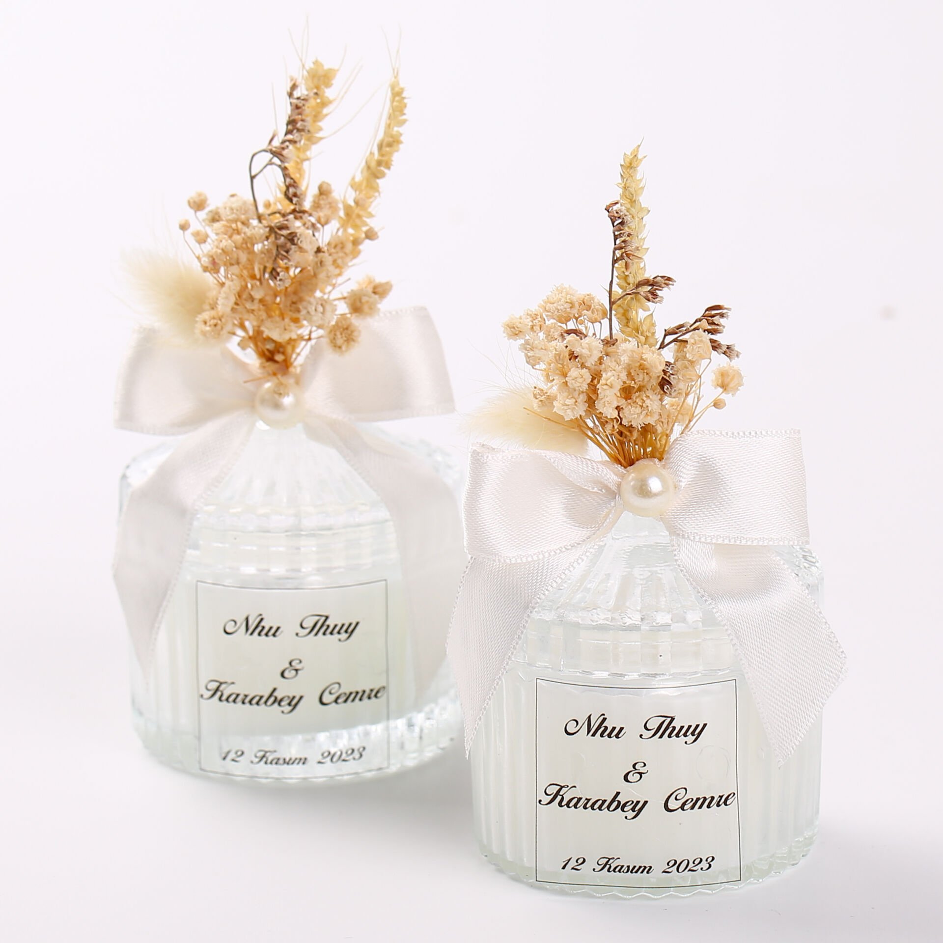 Zarif cam şekerlik formunda tasarlanmış bu mum, özel günlerinizde misafirlere şık bir ikramlık alternatifi sunar. Söz, nişan, düğün, kına gecesi ve diğer organizasyonlarda dekoratif bir detay olarak kullanılabilir. Hem hatıra olarak saklanabilir hem de bulunduğu ortama hoş bir atmosfer katar.