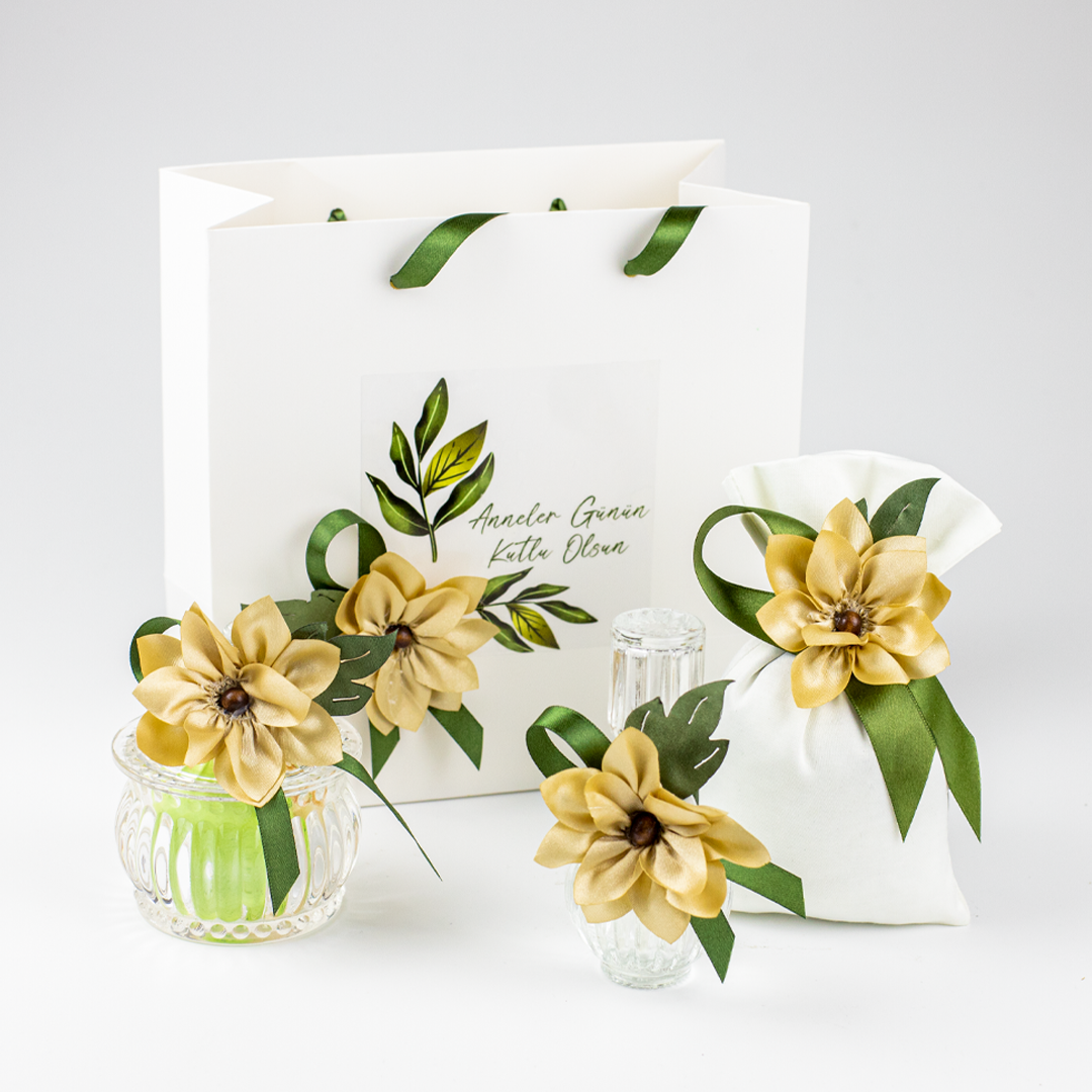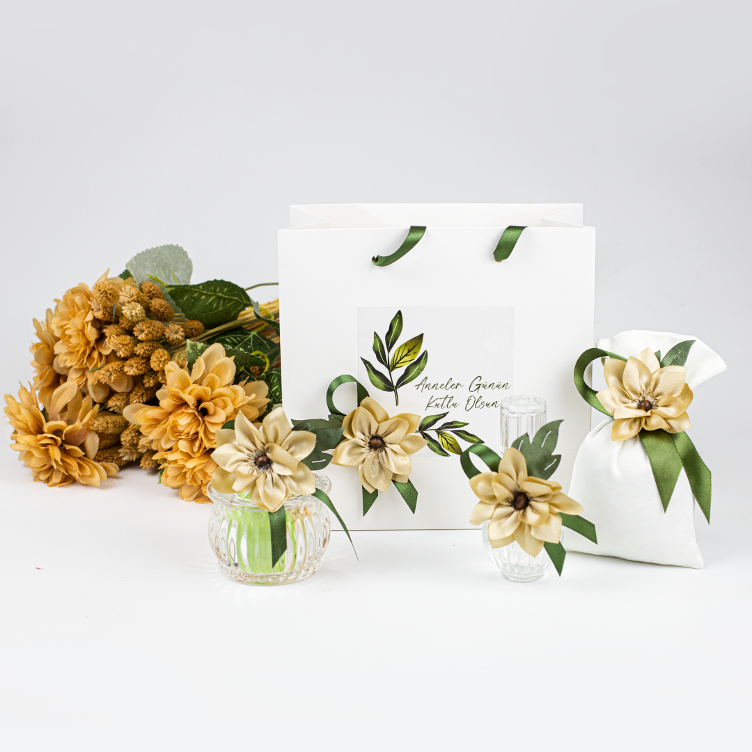 Çantalı Set – Kumaş Çiçekli (Kahve & Yeşil), Anneler Günü hediyesi olarak tercih edilebilecek zarif ve özenli bir hediye alternatifidir. Anneler Günü organizasyonları, butik kutlamalar ve kurumsal Anneler Günü etkinliklerinde şık bir sunum seti olarak değerlendirilebilir.