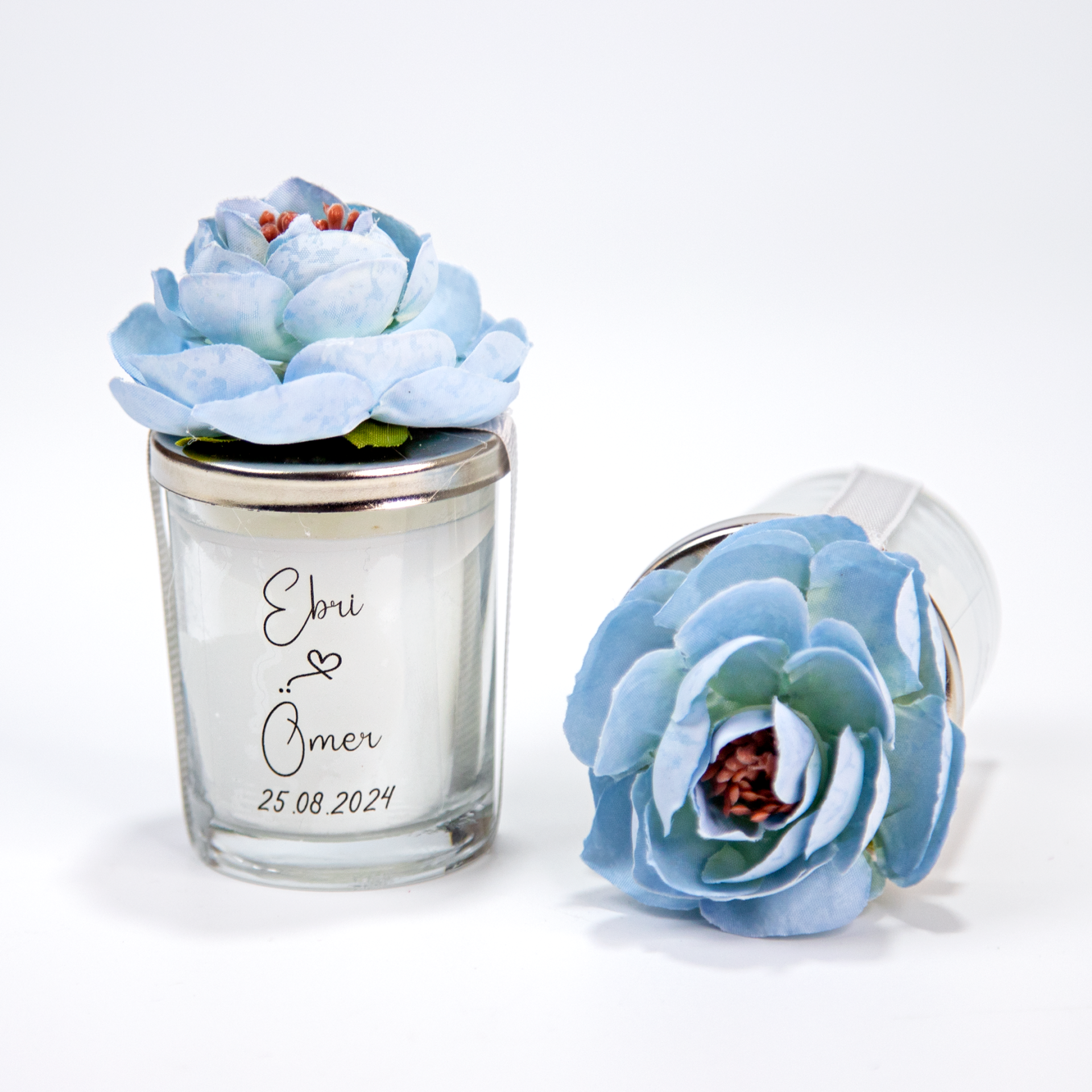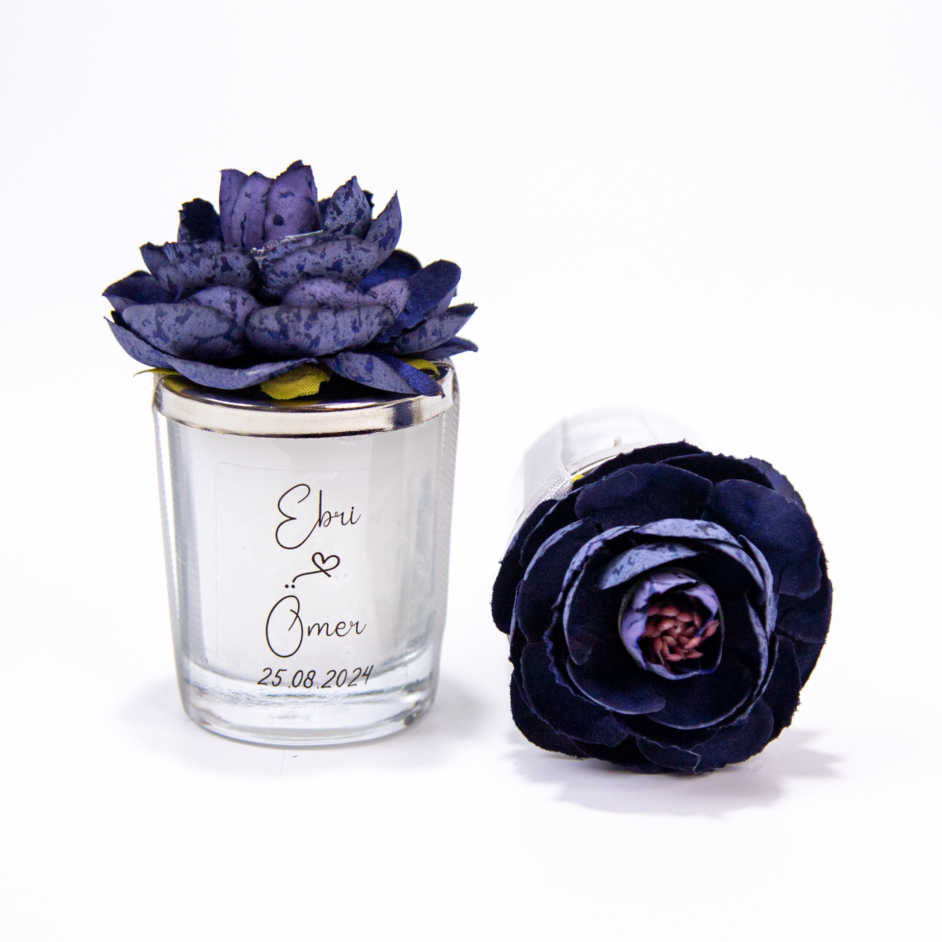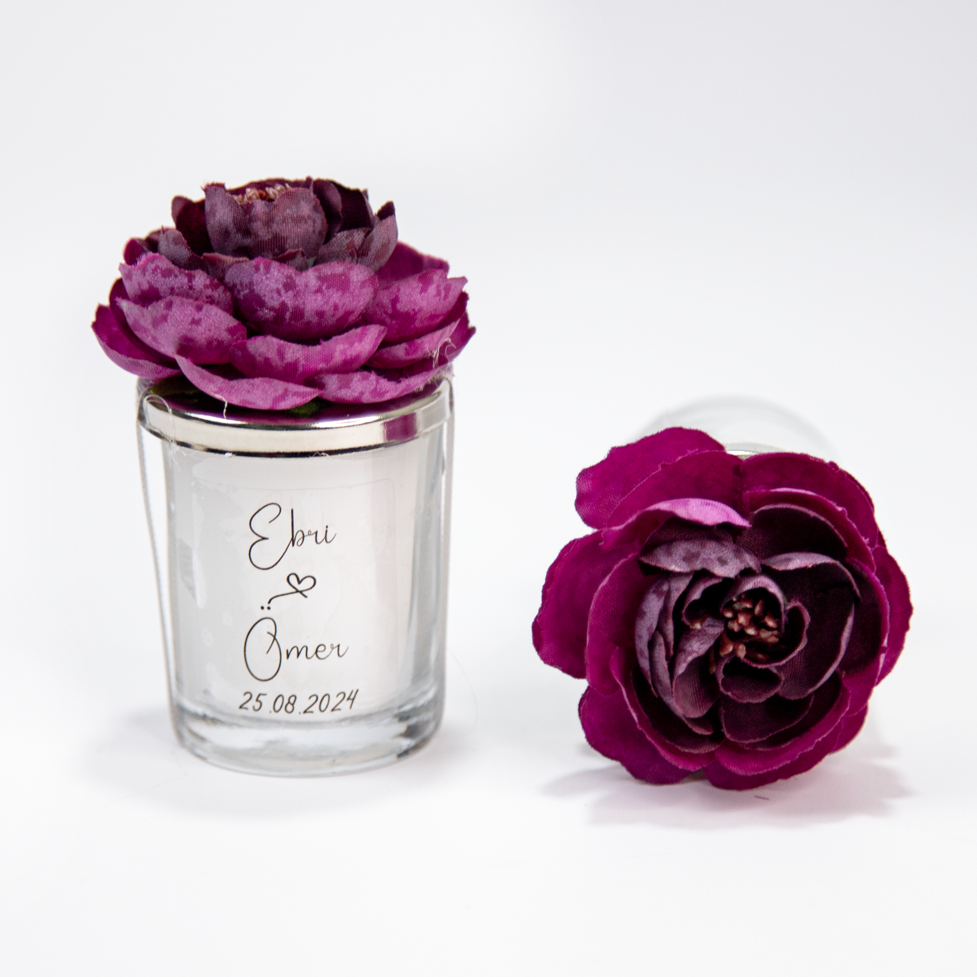 Cam bardak formu ve çiçek detayları sayesinde romantik, zarif ve konsept uyumlu bir görünüm sunar. Düğün masa dekorasyonu, nişan masası süsü ve organizasyon konsept tamamlayıcısı olarak değerlendirilebilir.