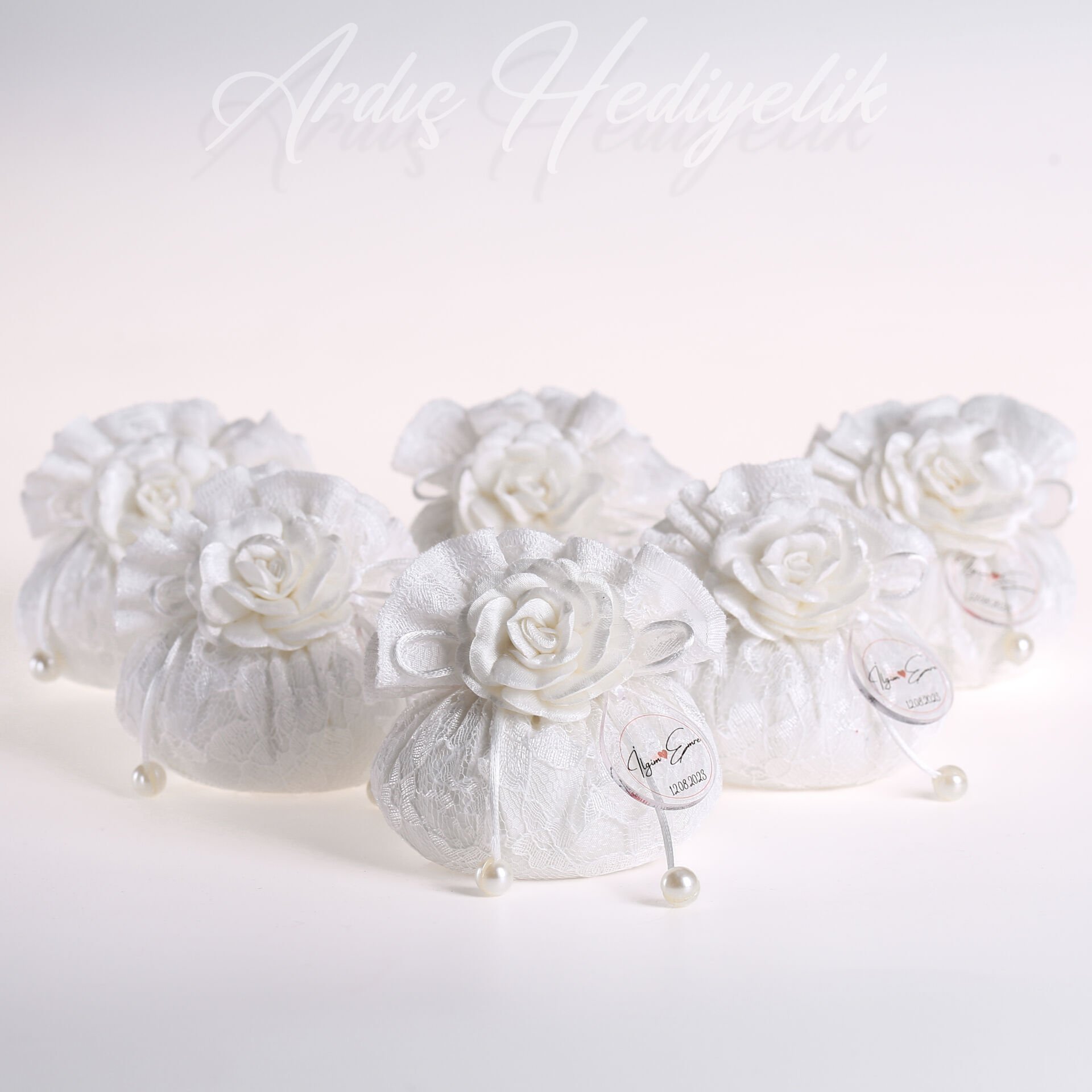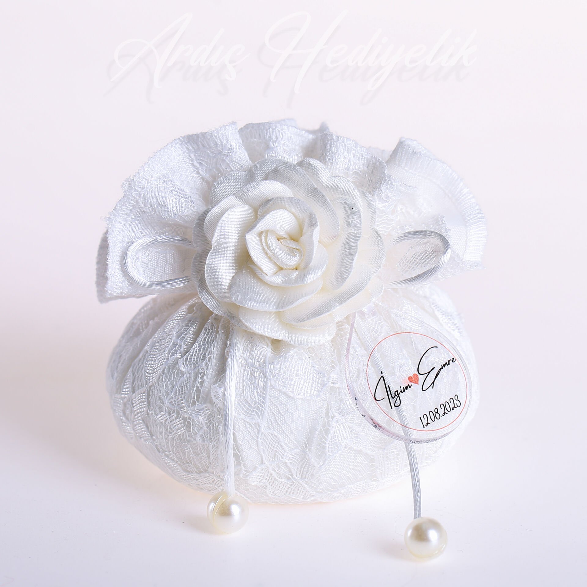 Zarif dantel kese, beyaz gül detayıyla şıklık katarken, 10 x 10 cm boyutlarında yuvarlak kına çerez kesesi ya da çok amaçlı kese olarak kullanılabilir. Boş olarak sunulan bu kese, kına gecesi, düğün ve diğer özel günlerde misafirlere sunulacak hediye ya da ikramlık olarak mükemmel bir alternatiftir. Şık tasarımı ve çok amaçlı kullanımıyla her organizasyona zarif bir dokunuş sağlar.