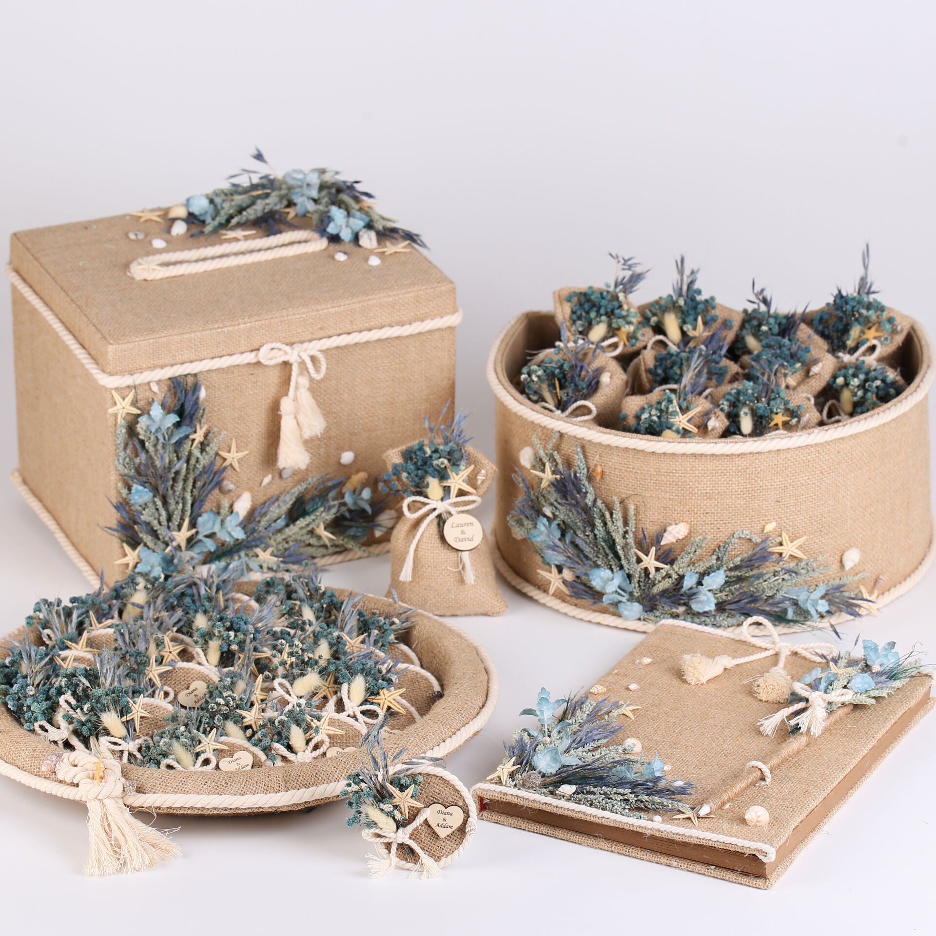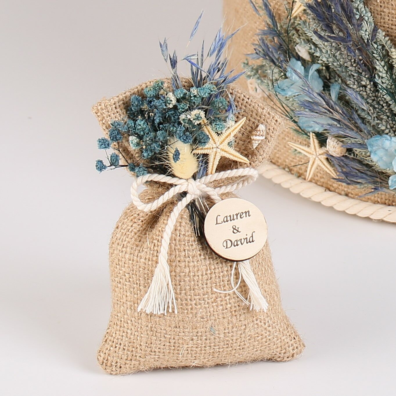 Deniz konsept detaylarıyla hazırlanan jüt kese; söz, nişan, nikah, kına ve özel organizasyonlarınızda misafirlerinize sunabileceğiniz şık ve anlamlı bir hediyelik seçeneğidir. Doğal jüt dokusu ve dekoratif süslemeleri sayesinde hem estetik hem de hoş kokulu bir hatıra sunar.