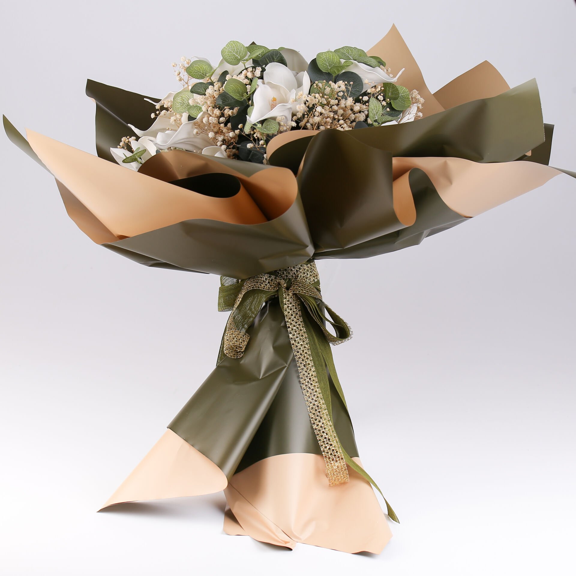 Gala, manolya ve okaliptus yapraklarıyla hazırlanan çiçek aranjmanı; zarif ve doğal görünümüyle söz, nişan, isteme, nikah, düğün, kına gecesi ve özel gün organizasyonlarında şık bir tamamlayıcıdır. Estetik tasarımı sayesinde sunumlarda dekoratif bir detay olarak kullanılabilir, fotoğraf çekimlerinde hoş bir görünüm sağlar ve özel günlerden hatıra olarak saklanabilir.