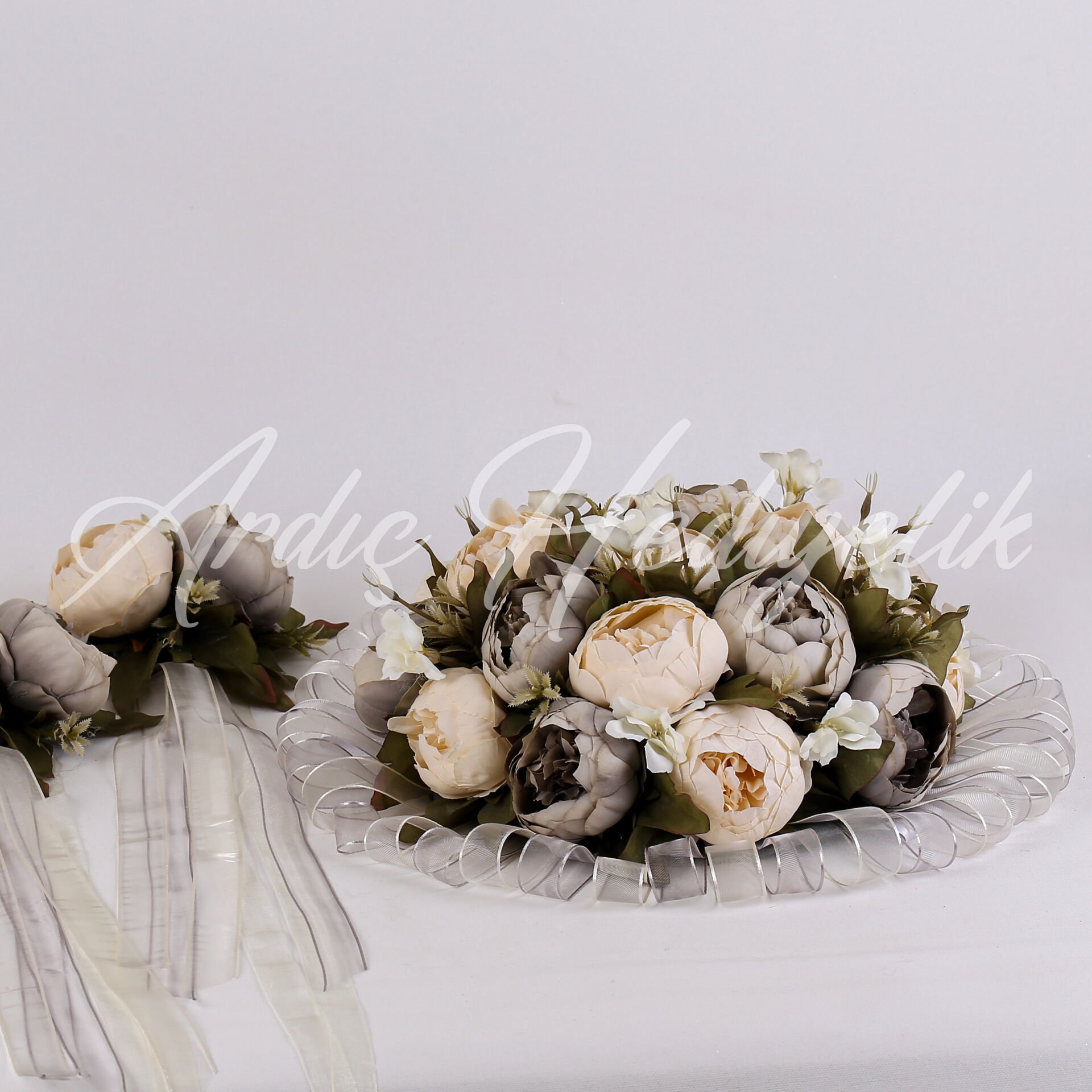 Gümüş kurdele detaylarıyla hazırlanan gelin arabası süsleme 3’lü set; düğün ve nikah organizasyonlarında aracınıza zarif ve şık bir görünüm kazandırır. Uyumlu tasarımı sayesinde konvoy araçlarıyla bütünlük sağlar, özel gününüzde dikkat çekici bir dekor oluşturur. Arka cam için lazer kesim çiçek süslemeli isim baş harfleri sete dahildir.