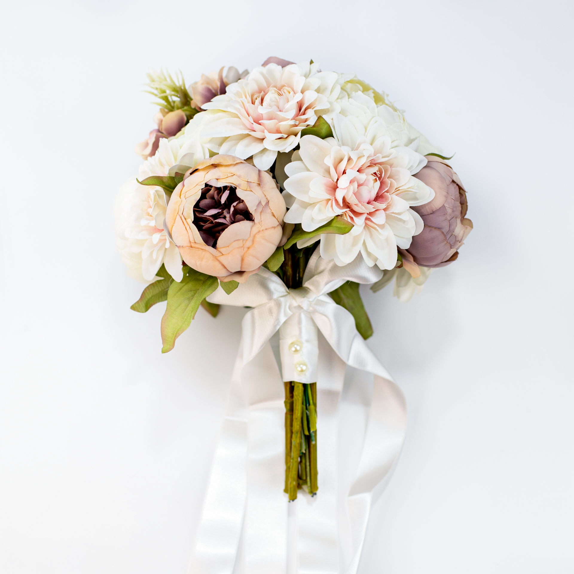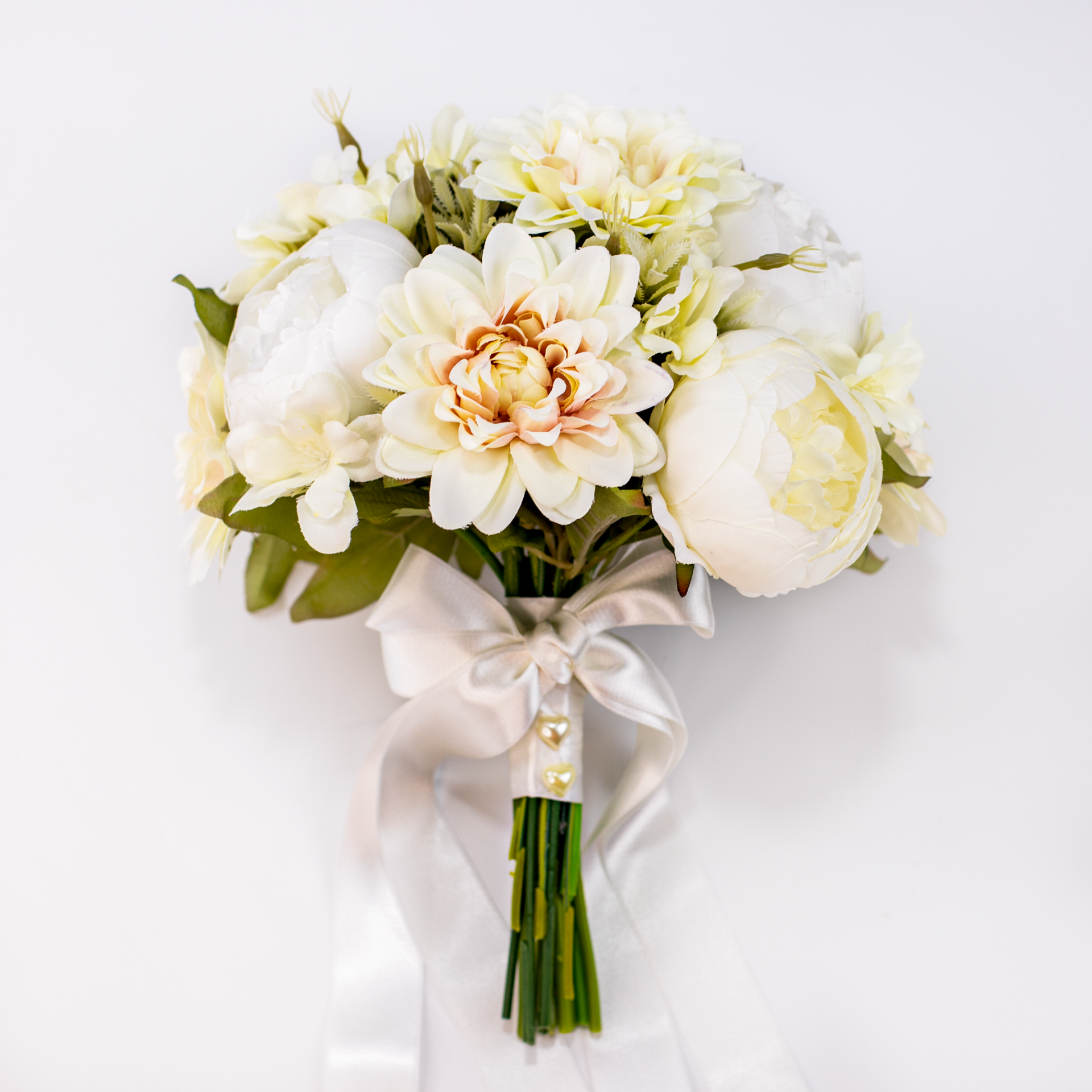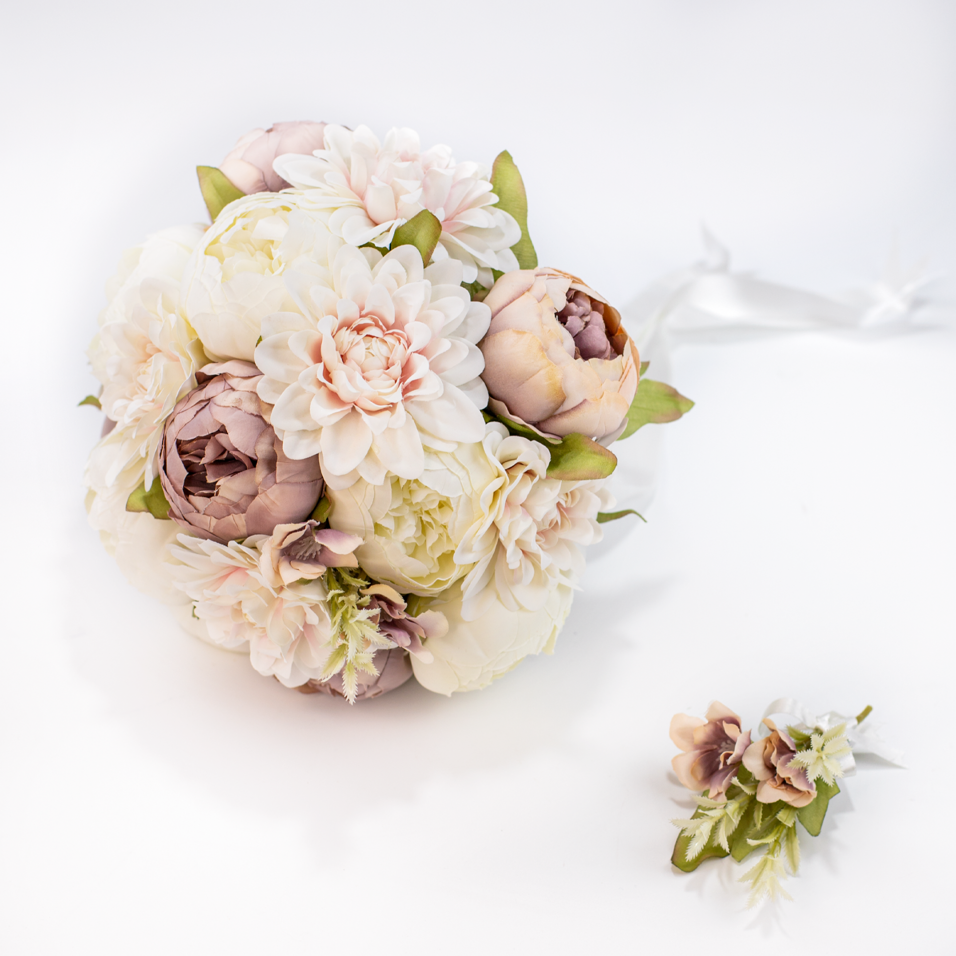 Krizantem ve şakayık detaylarıyla hazırlanan gelin buketi ve damat yaka iğnesi seti, söz, nişan, nikah, düğün ve kına organizasyonlarında şık bir tamamlayıcıdır. Uyumlu tasarımı sayesinde fotoğraf çekimlerinde estetik bir görünüm sunar, dekoratif yapısıyla hatıra olarak da uzun süre saklanabilir.