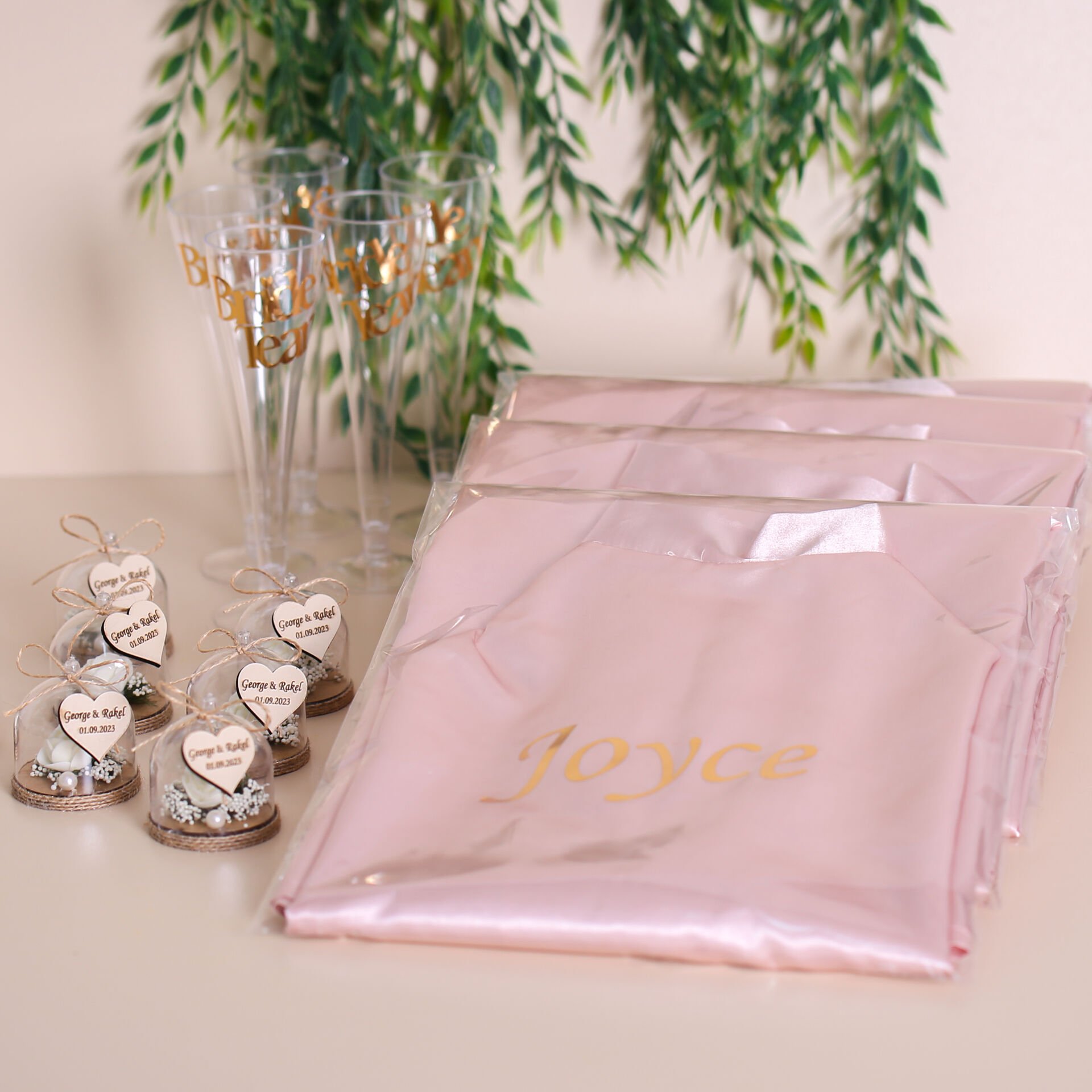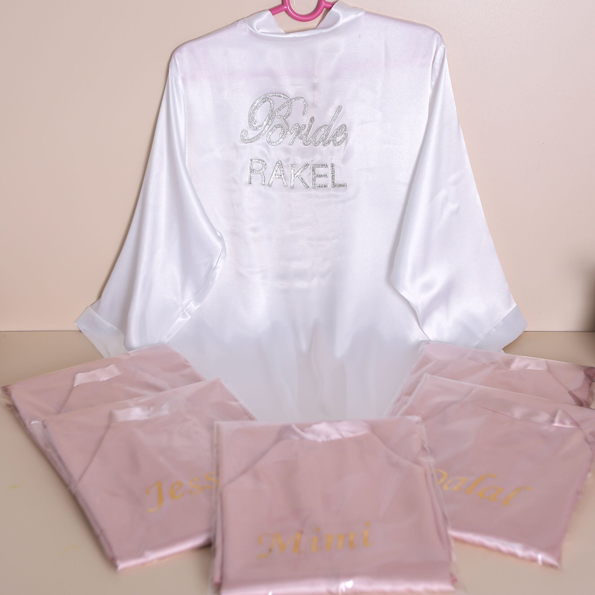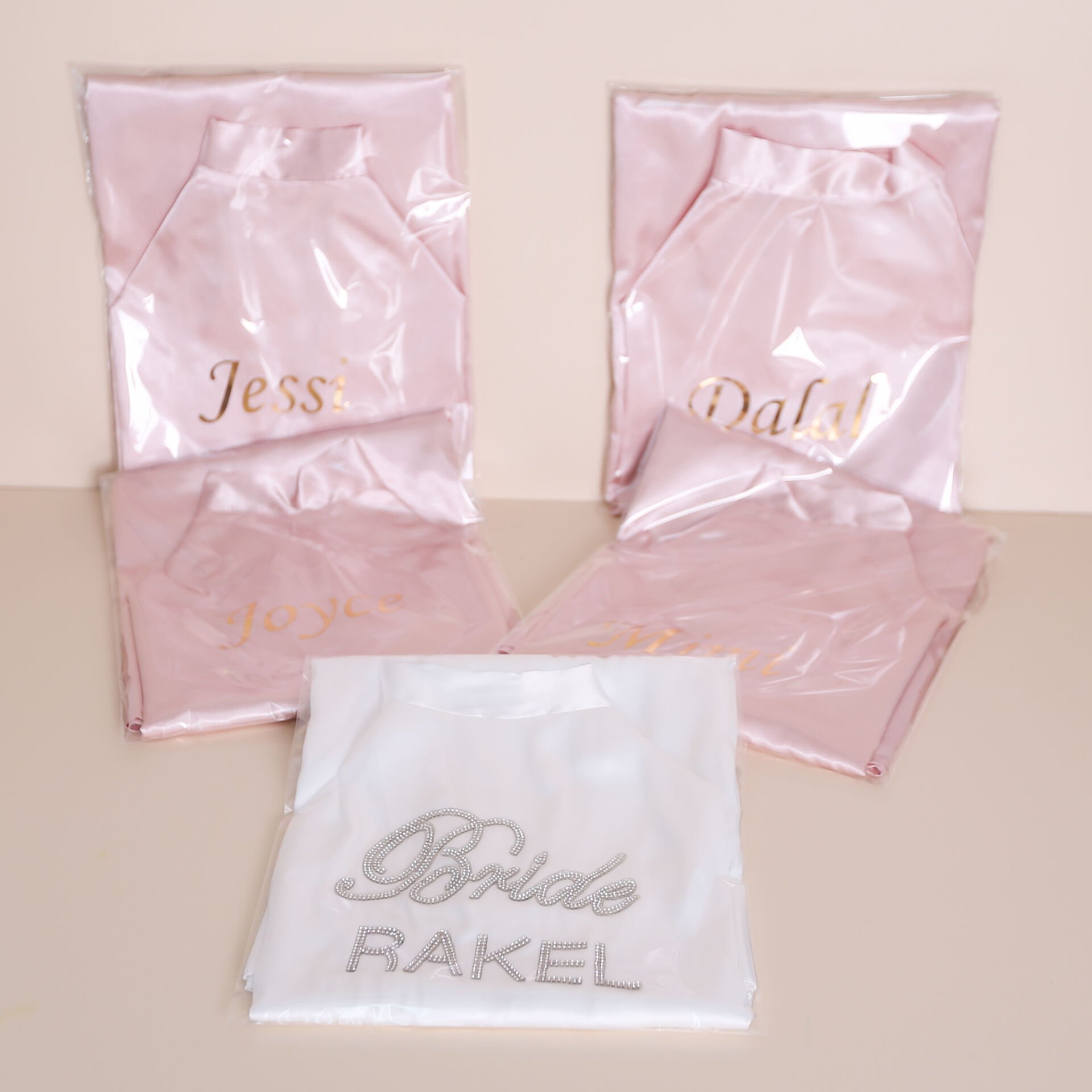 Gelin için beyaz, nedimeler için pembe renklerde hazırlanan sabahlıklar; parıltılı taş ve parlak yazı detaylarıyla bekarlığa veda, kına gecesi, düğün hazırlığı ve özel gün organizasyonlarında şık ve eğlenceli bir konsept oluşturur. İsim eklenerek kişiye özel hale getirilebilir, fotoğraf çekimlerinde estetik bir görünüm sağlar ve özel günlerden hatıra olarak saklanabilir.
