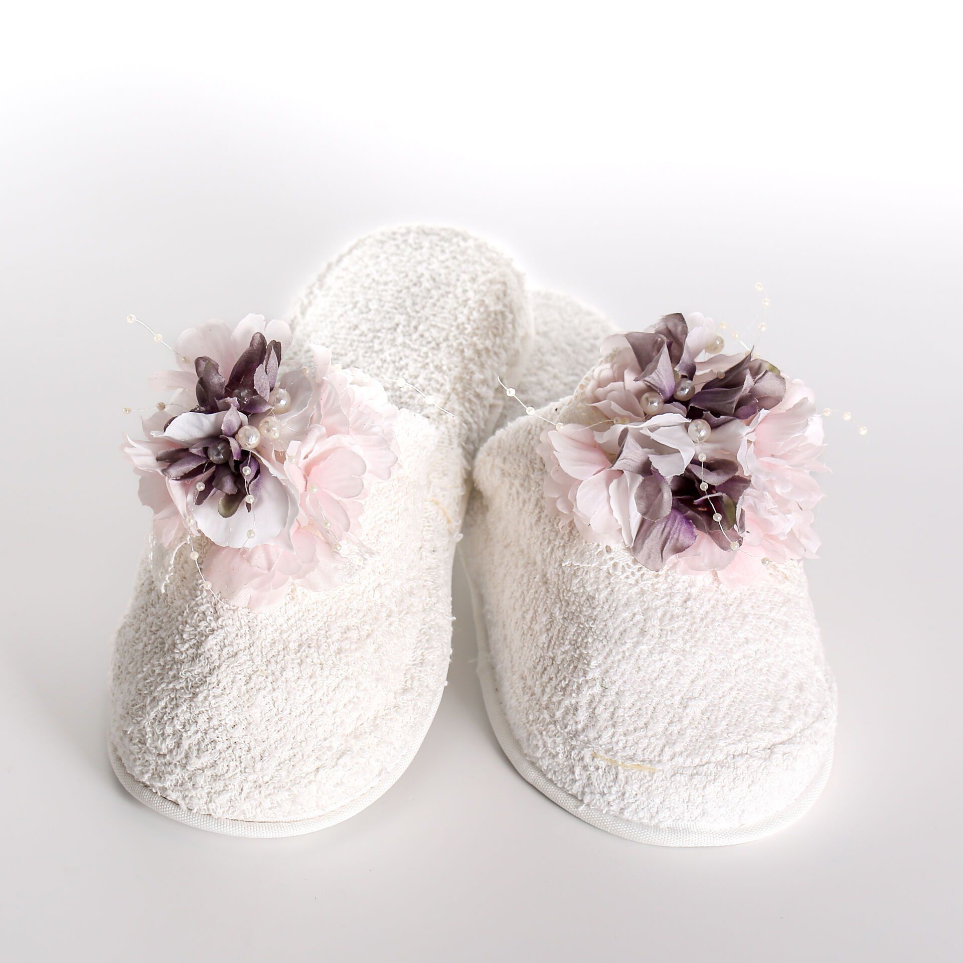 Çiçek ve inci detaylarıyla süslenen havlu terlik; bekarlığa veda, bride hazırlıkları, gelin sabahı, spa günü, anne-kız kombinleri ve ev kullanımına uygun şık ve konforlu bir üründür. Yumuşak havlu dokusu sayesinde rahat kullanım sunar, hem günlük kullanım hem de hediye alternatifi olarak tercih edilebilir.