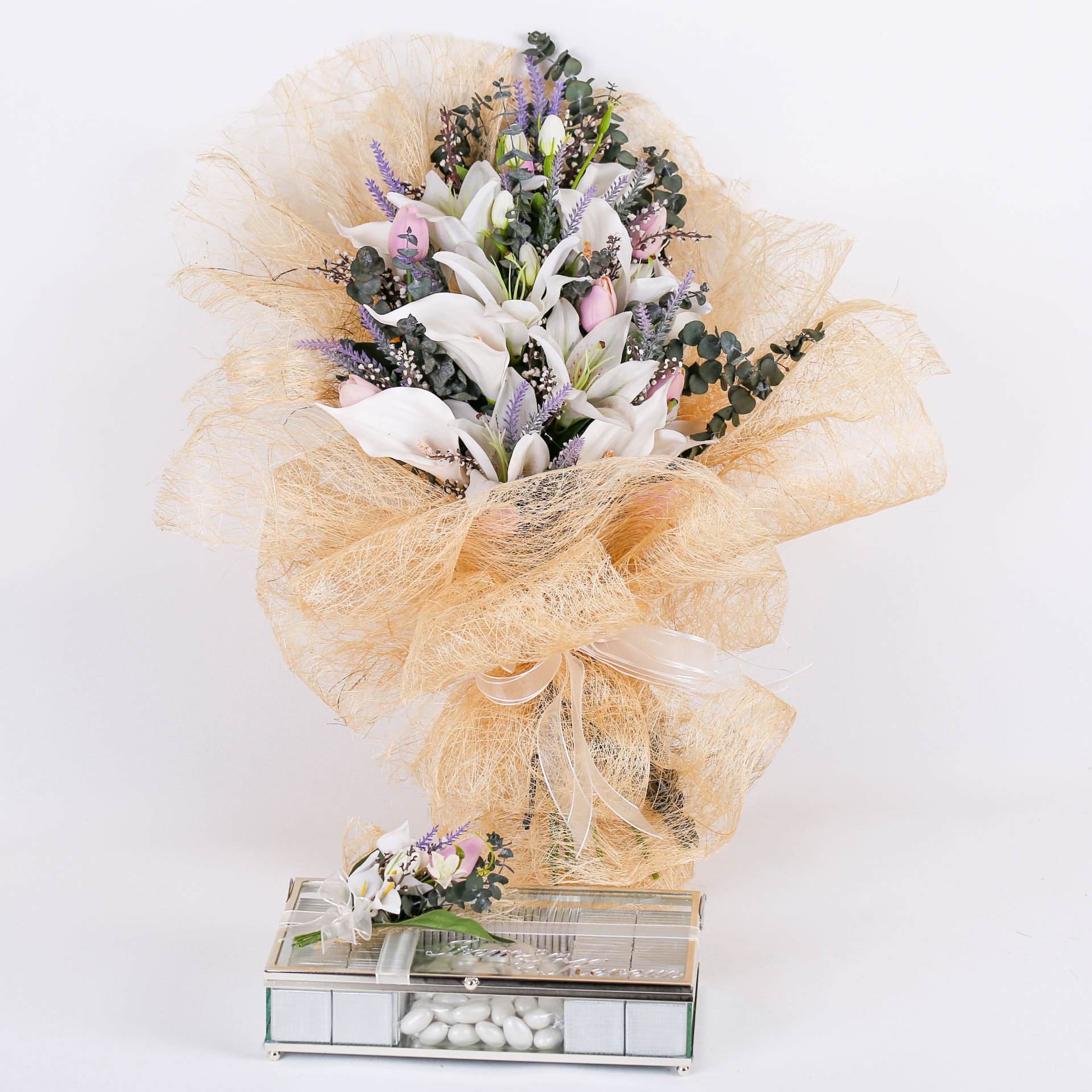 Romantik renk geçişleri ve zarif sunumuyla hazırlanan isteme çiçek – çikolata seti, söz ve nişan organizasyonlarınız için şık bir tercih sunar. Beyaz, mor ve lila tonlarında çiçek buketi, estetik görünümüyle dikkat çekerken, cam kutu içerisinde isteme çikolatası ve badem draje ile set tamamlanır. İsteme çiçeği, isteme çikolatası, söz nişan seti ve nişan organizasyon ürünleri arasında hem dekoratif hem de ikramlık olarak kullanılabilecek zarif bir alternatiftir. Özel günlerinizde şıklığı ve uyumu bir arada sunar.
