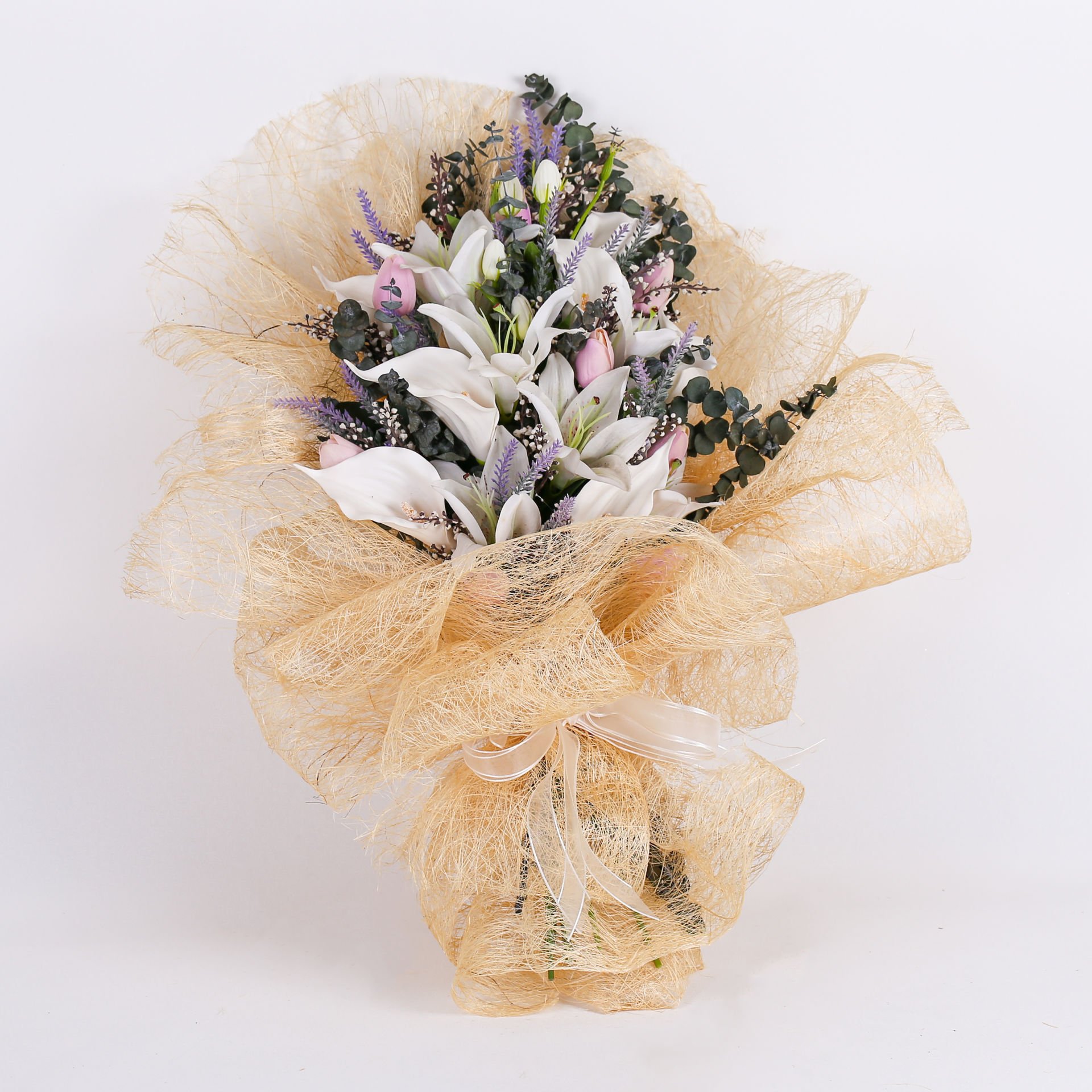 Beyaz, mor ve lila tonlarında çiçek buketi
