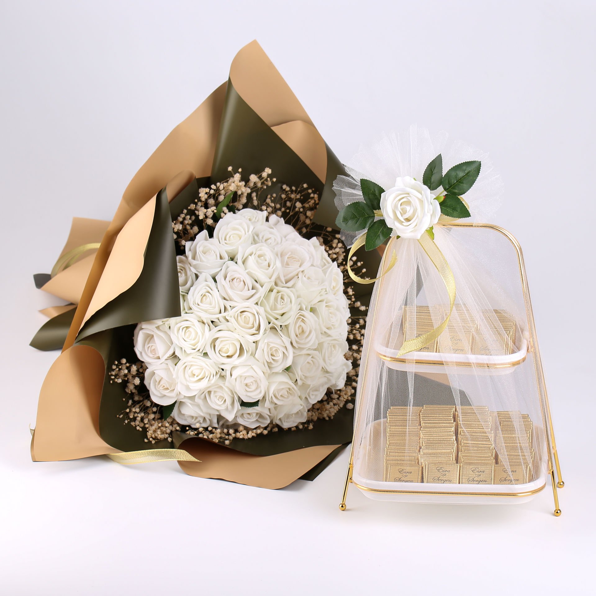 Bu şık set, isteme törenlerinizi zarif bir şekilde taçlandırır. Beyaz kadife güllü çiçek buketi ve etiketli çikolatalar, misafirlere sunulabilecek hem estetik hem de lezzetli bir ikram sunar. Gold ve gümüş renk seçenekleriyle konseptinize uyum sağlar.