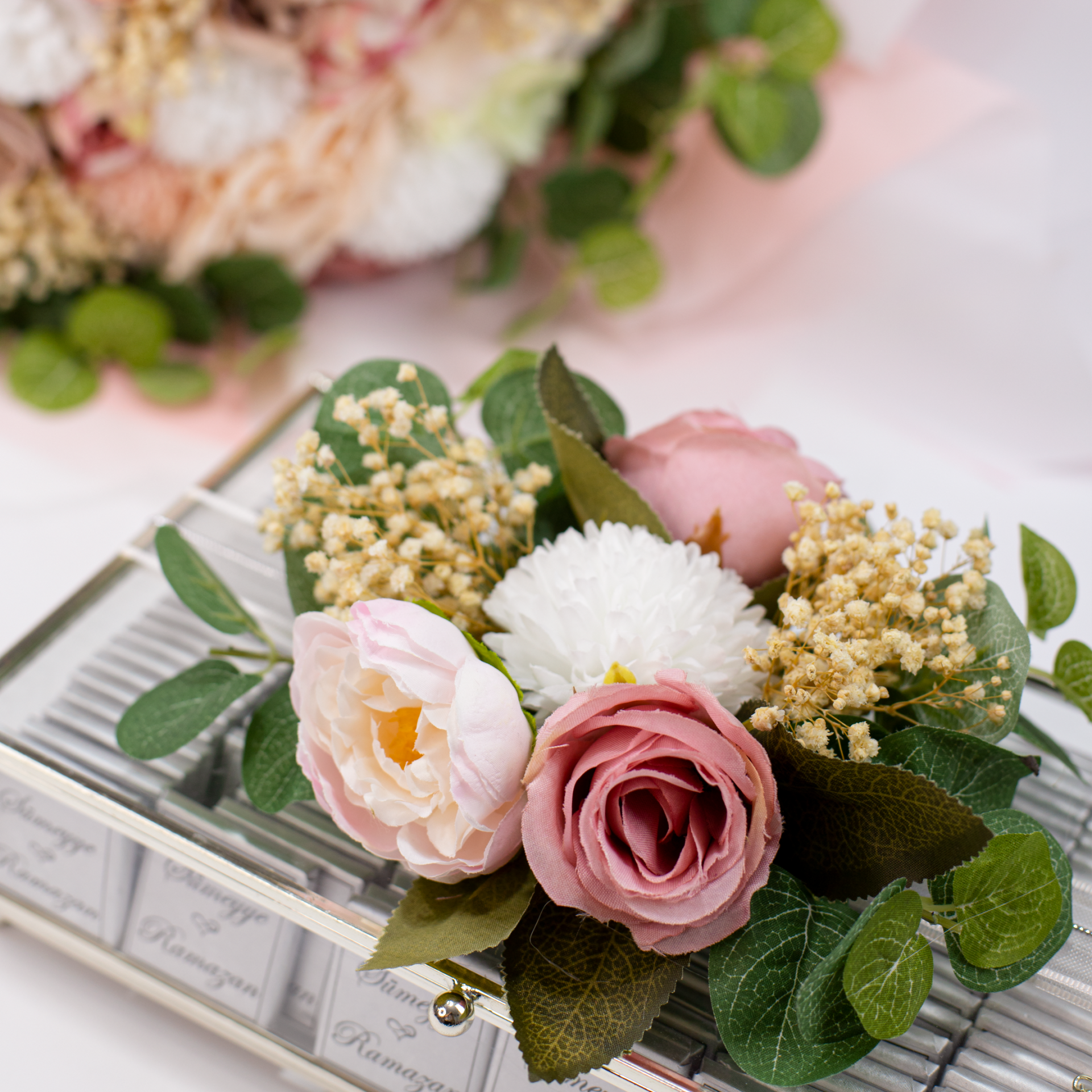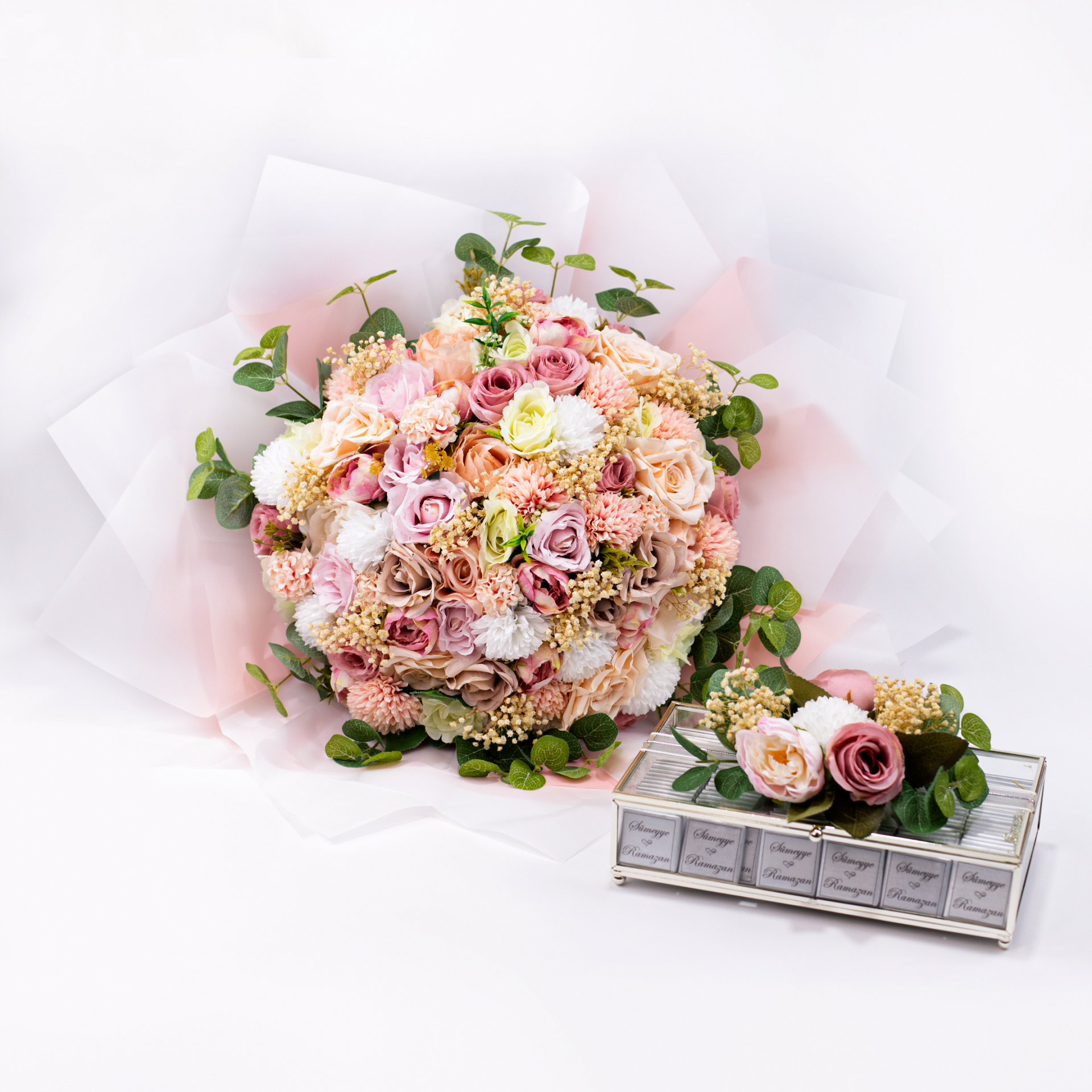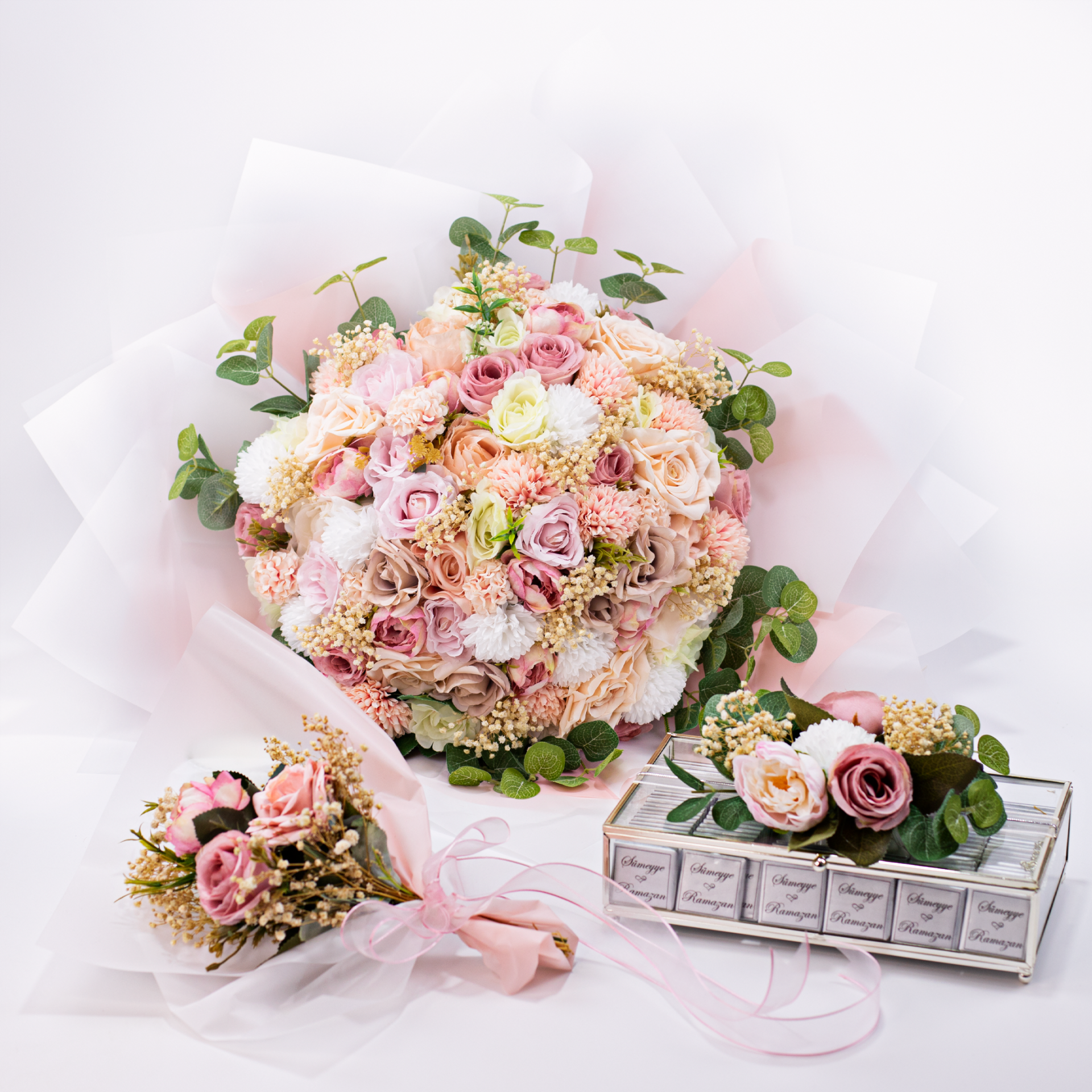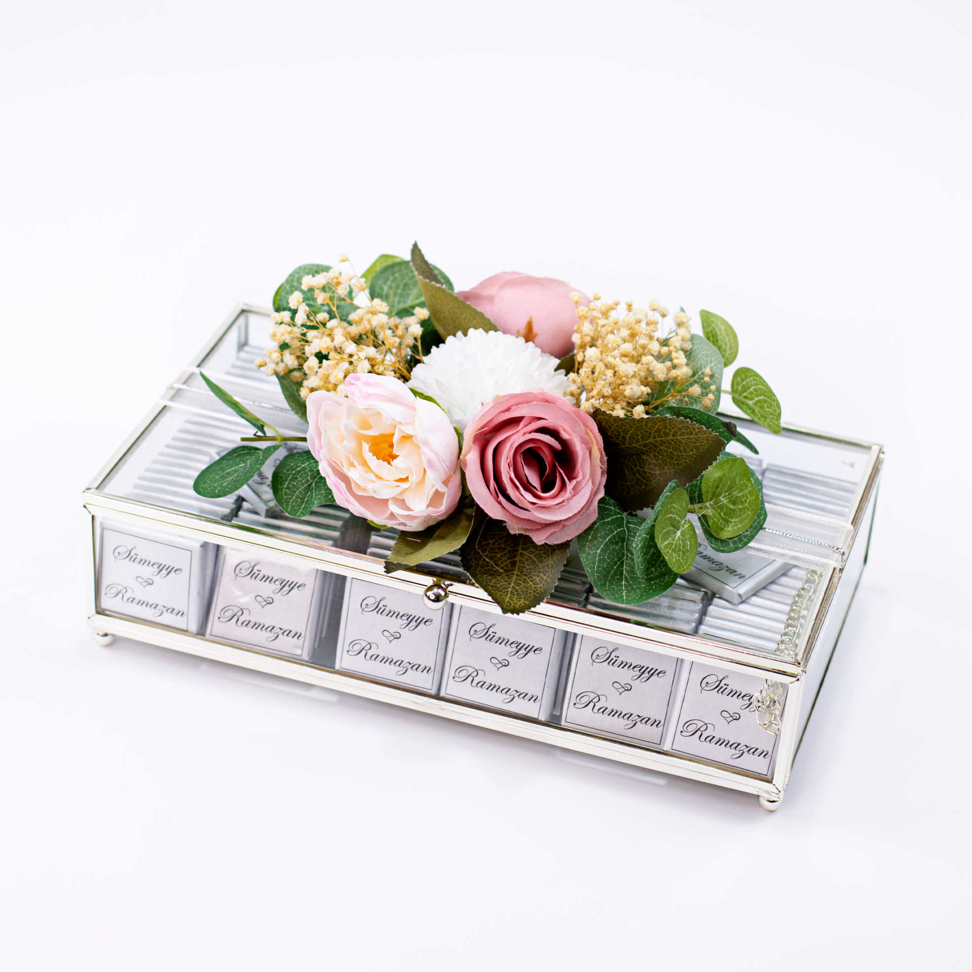 Özel günler için uyumlu şekilde hazırlanan isteme seti; kız isteme, söz ve nişan organizasyonlarında şık bir sunum oluşturur. İçeriğinde yer alan çikolata ve çiçek detayları sayesinde hem aile tanışmalarında hem de özel ziyaretlerde hediye olarak da tercih edilebilecek zarif bir settir. Konsept bütünlüğü sağlayan parçalarıyla unutulmaz bir hatıra sunar.