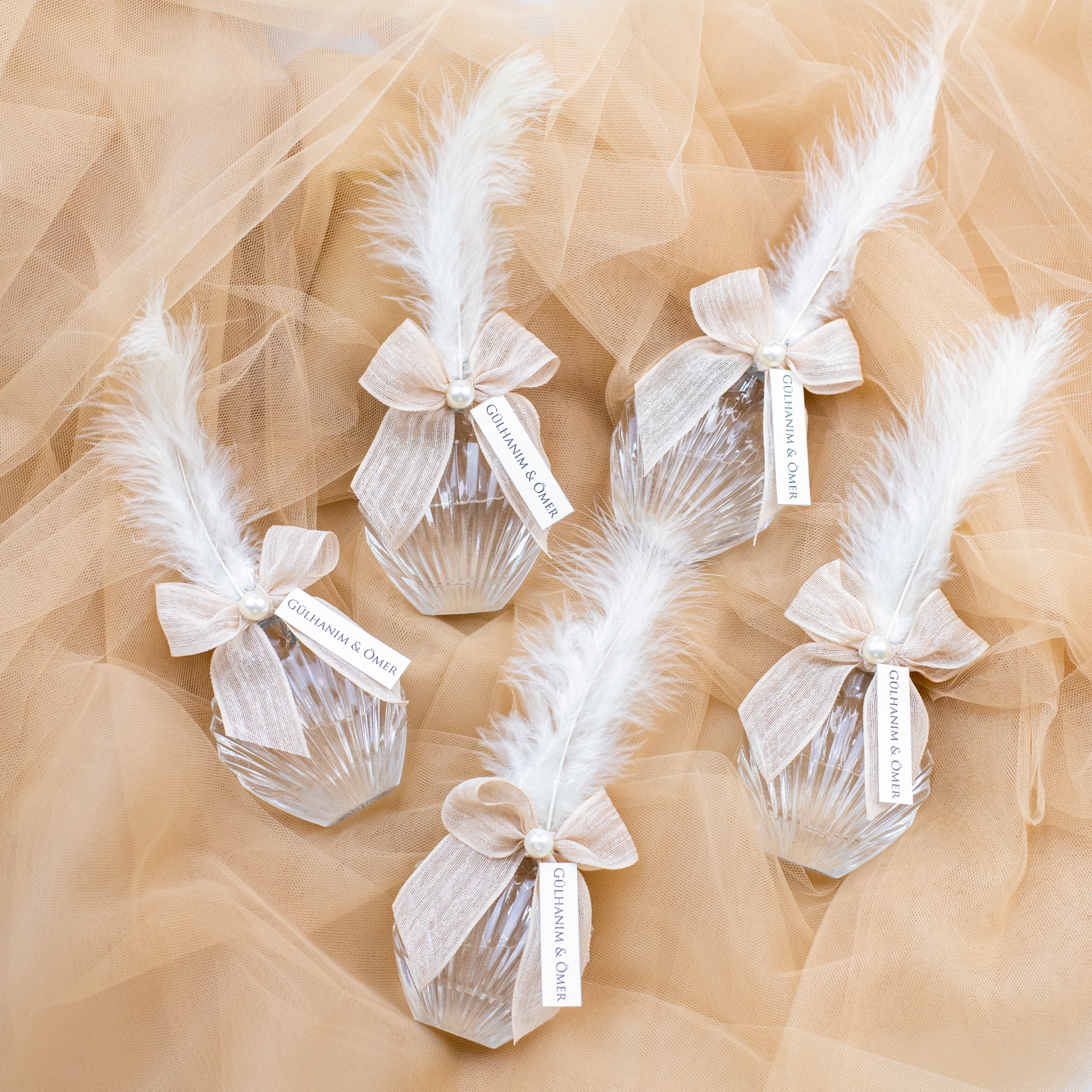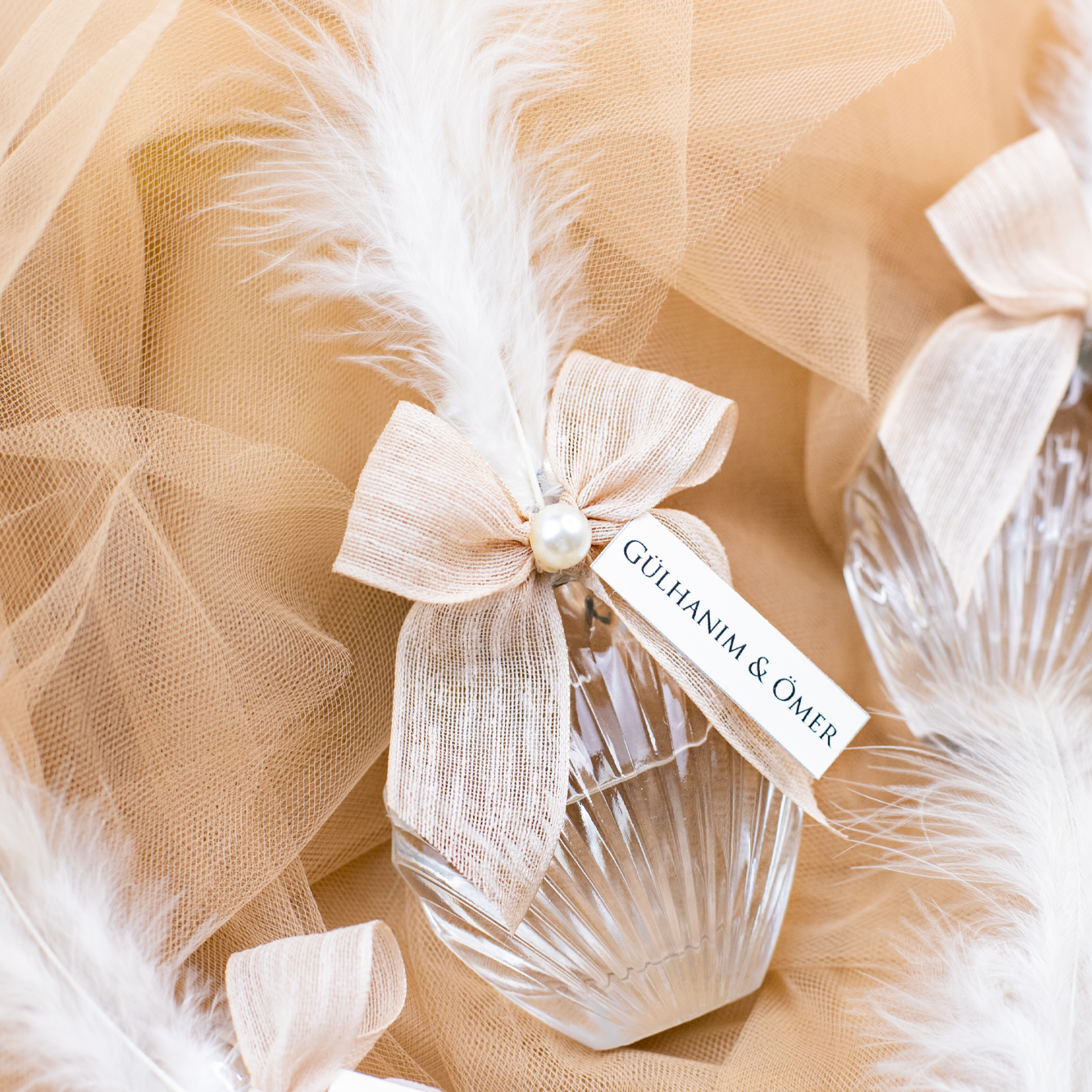 İncili ve tüylü süslemelerle hazırlanan istiridye form cam şişede kolonya, zarif tasarımıyla söz, nişan, kına, nikah, düğün, mevlit ve özel davetlerde şık bir hediyelik olarak tercih edilebilir. Dekoratif görünümü sayesinde misafirlerinize anlamlı bir hatıra sunarken, isteğe bağlı kişiselleştirme seçeneği ile isim, tarih veya özel not eklenerek daha özel hale getirilebilir. Özel günler için hediye alternatifi olarak da değerlendirilebilir.