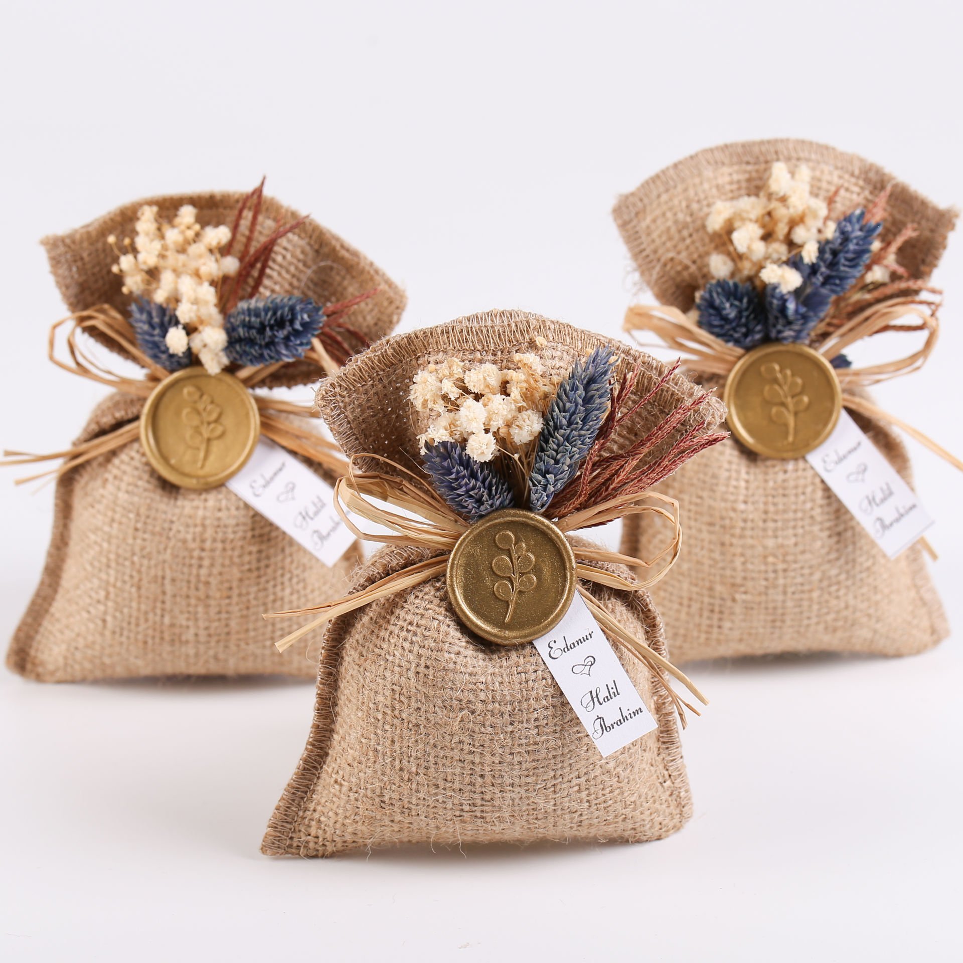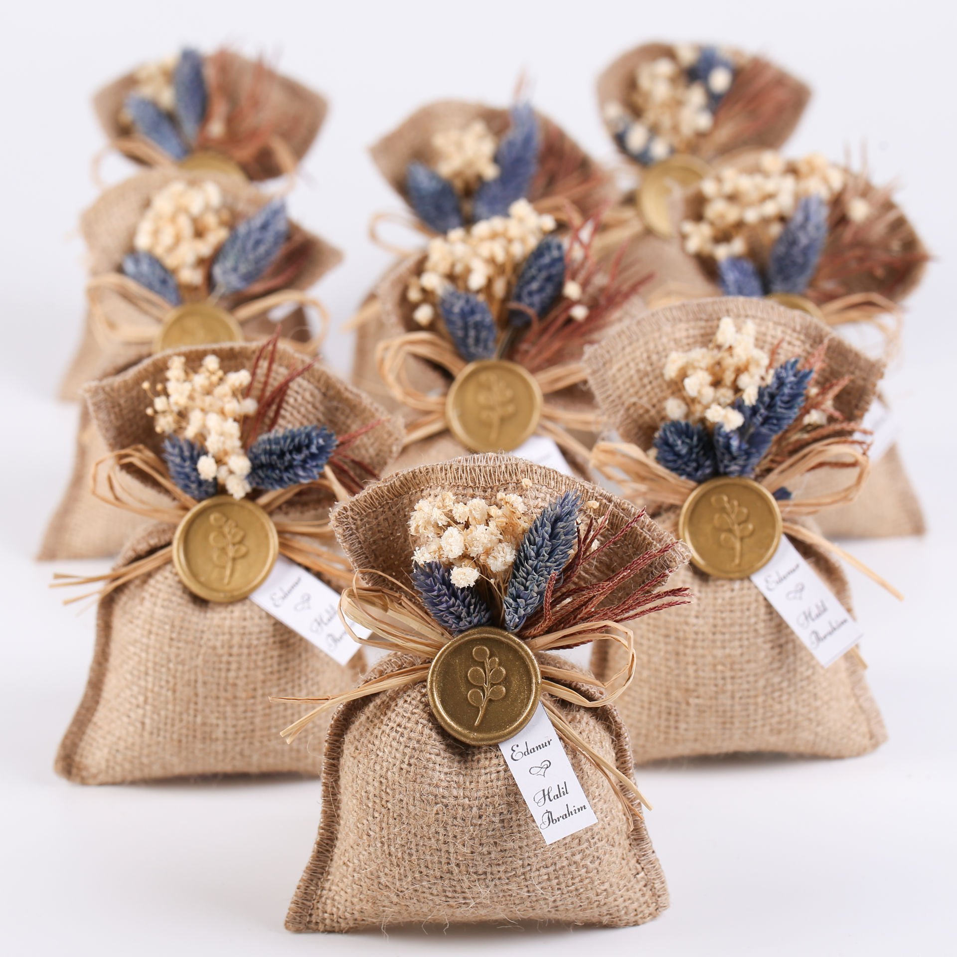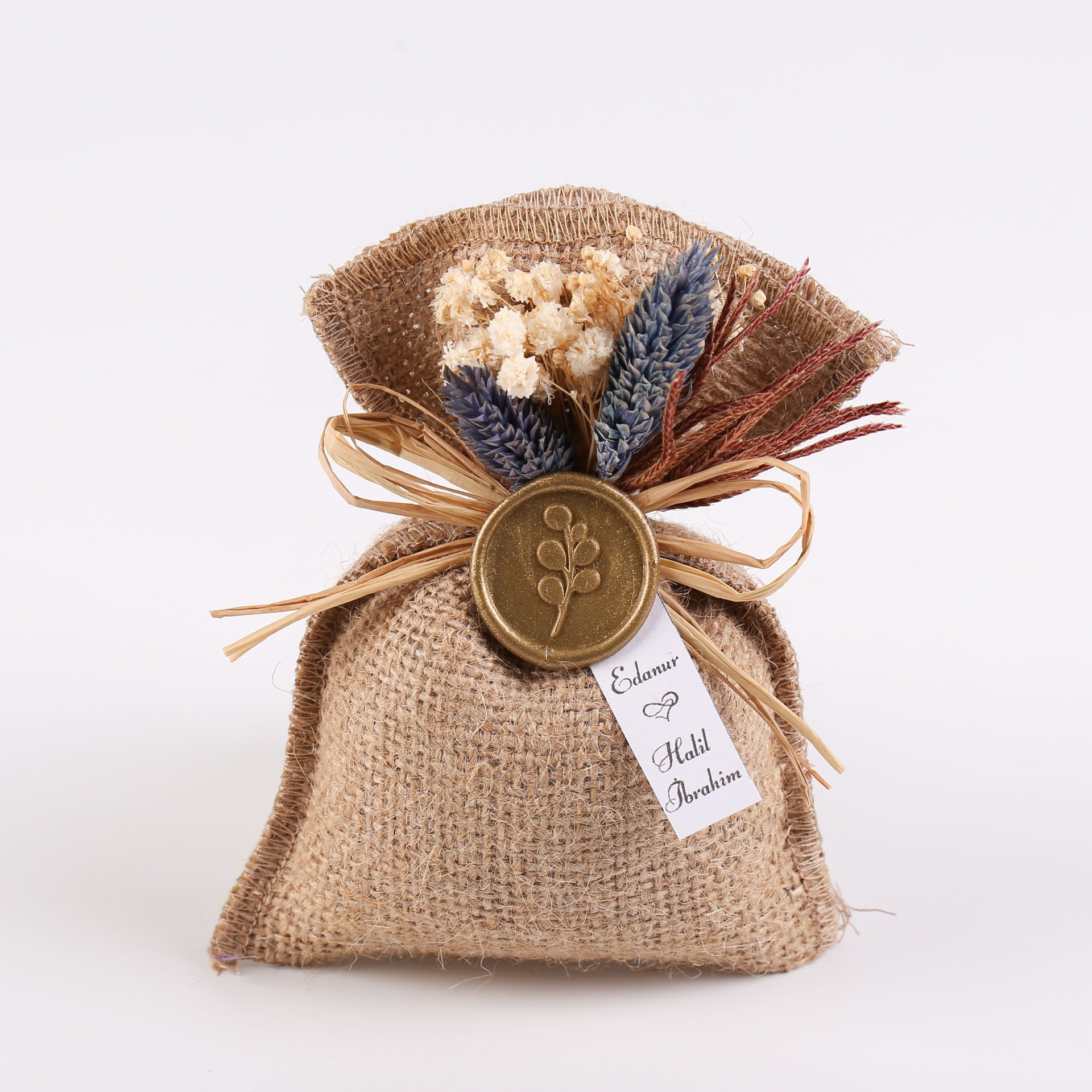 Çiçek süslemeleri, gold mühür detayı ve beyaz karton etiketiyle hazırlanan jüt lavanta kesesi; doğal ve zarif görünümüyle söz, nişan, düğün, kına gecesi, nikah, mevlit, baby shower, doğum günü ve özel gün organizasyonlarında misafirlere sunulabilecek şık bir hediyelik alternatiftir. Hoş kokusu ve dekoratif tasarımı sayesinde hem hatıra olarak saklanabilir hem de bulunduğu ortama estetik bir dokunuş katar. Mavi ve krem çiçek renk seçenekleriyle konseptinize uyum sağlar.