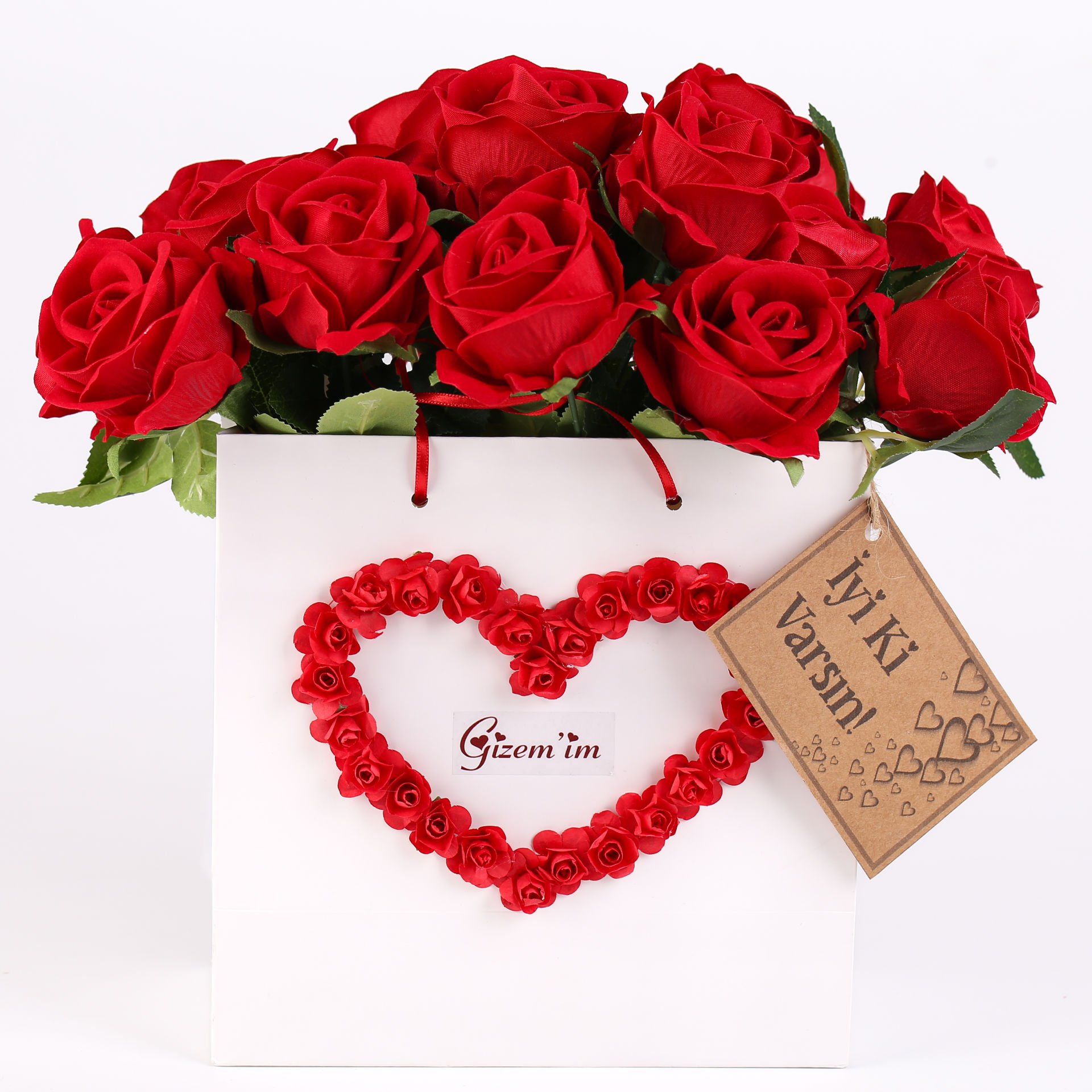 Kırmızı güllerle doldurulmuş kalp formdaki çanta, duygusal ve şık bir görünüm sunar. Mesajınızla özelleştirilebilir olması sayesinde kişiye özel hediye alternatifi olarak hazırlanabilir. Özel günlerde hem dekoratif hem anlamlı bir sunum sağlar.