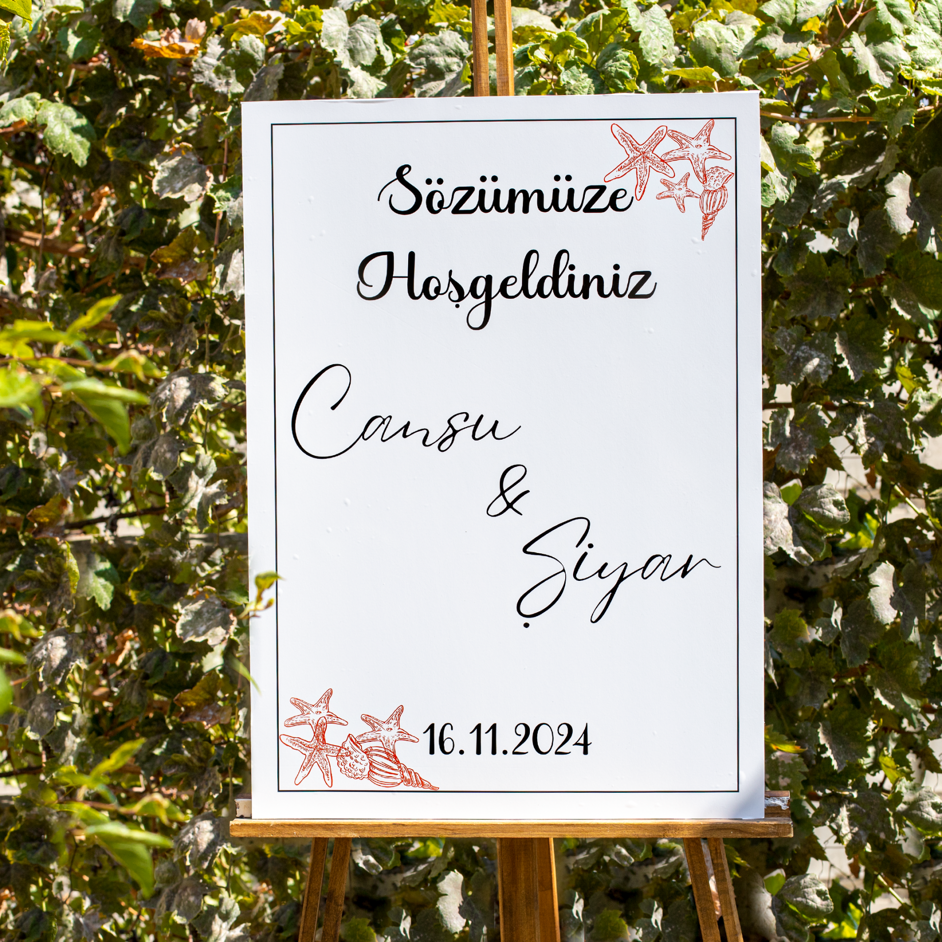 Deniz konseptiyle hazırlanan karşılama panosu, kız isteme, söz, nişan, kına, düğün ve nikah organizasyonlarında misafirlerinizi şık bir şekilde karşılamak için kişiye özel olarak tasarlanır. İsim, tarih ve konsept detaylarının uygulanabildiği tasarımı sayesinde organizasyonlarınıza özel bir atmosfer katar. Aynı zamanda davetler, özel etkinlikler ve kurumsal organizasyonlar için de konsept tamamlayıcı dekoratif bir seçenektir.