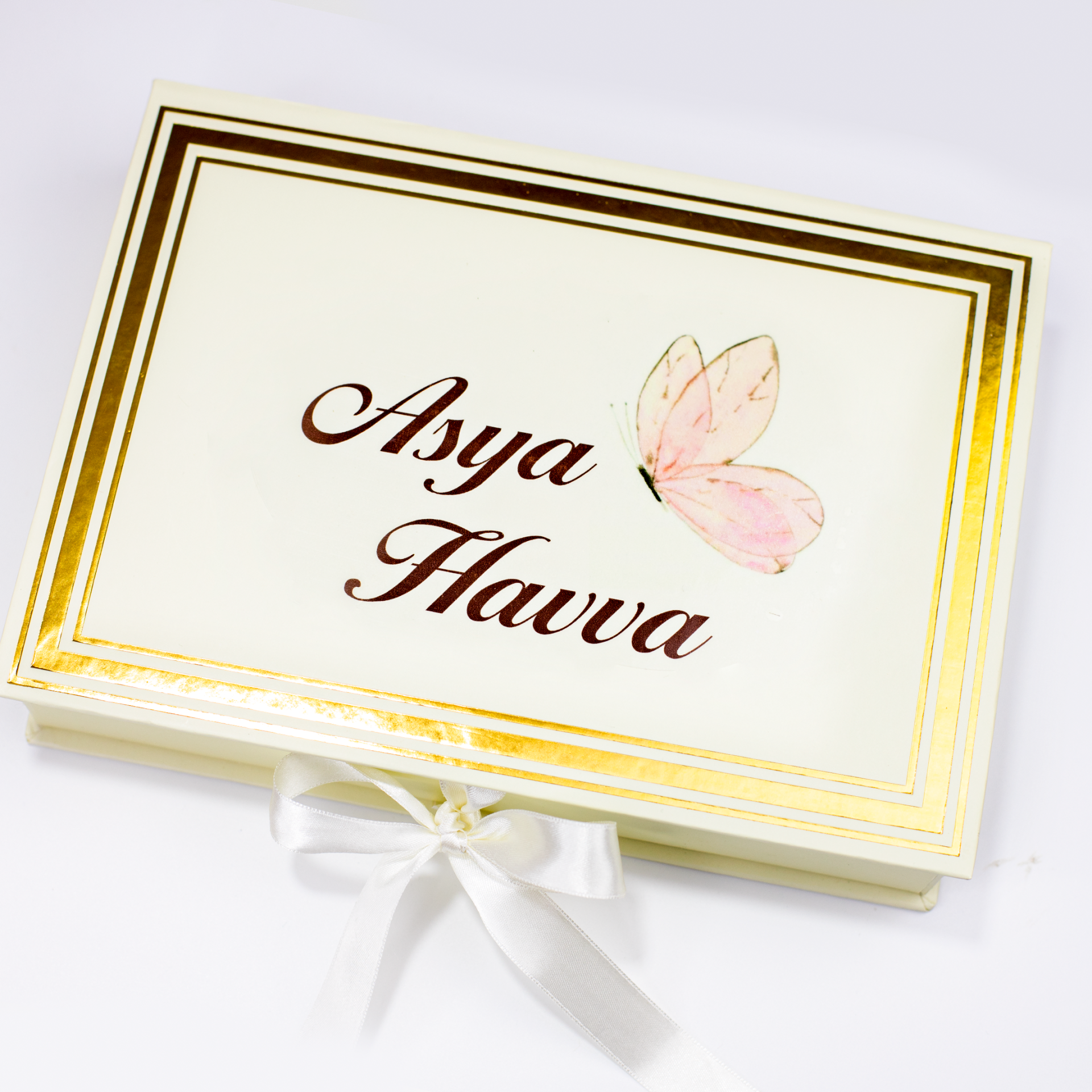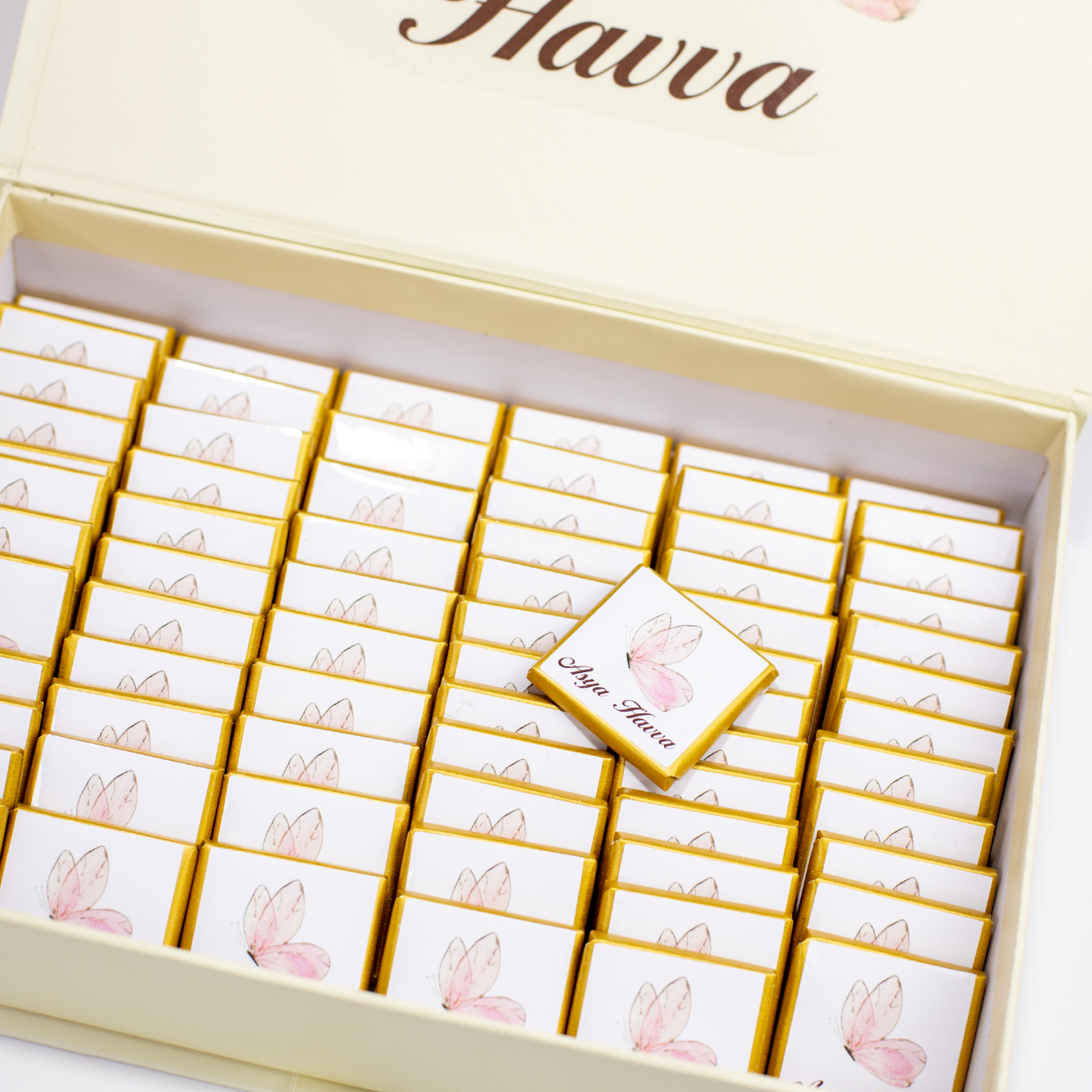 · İsme özel etiketli karton kutu içerisinde 80 adet bebek çikolatası (kişiselleştirilebilir)