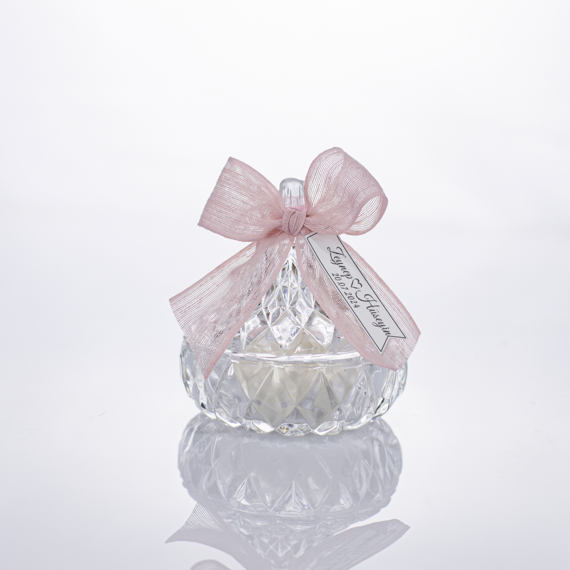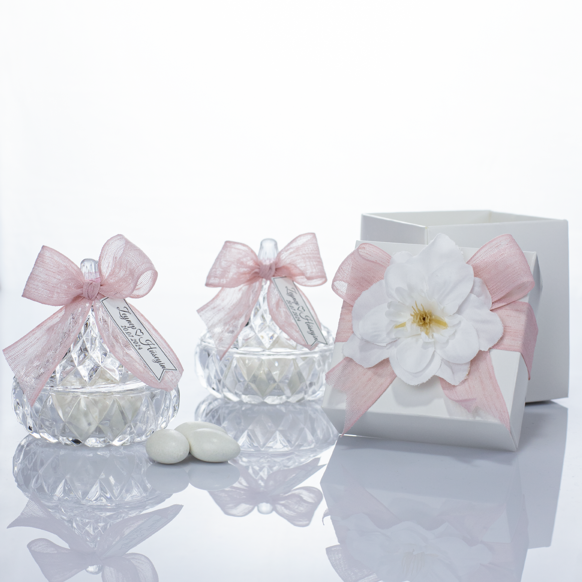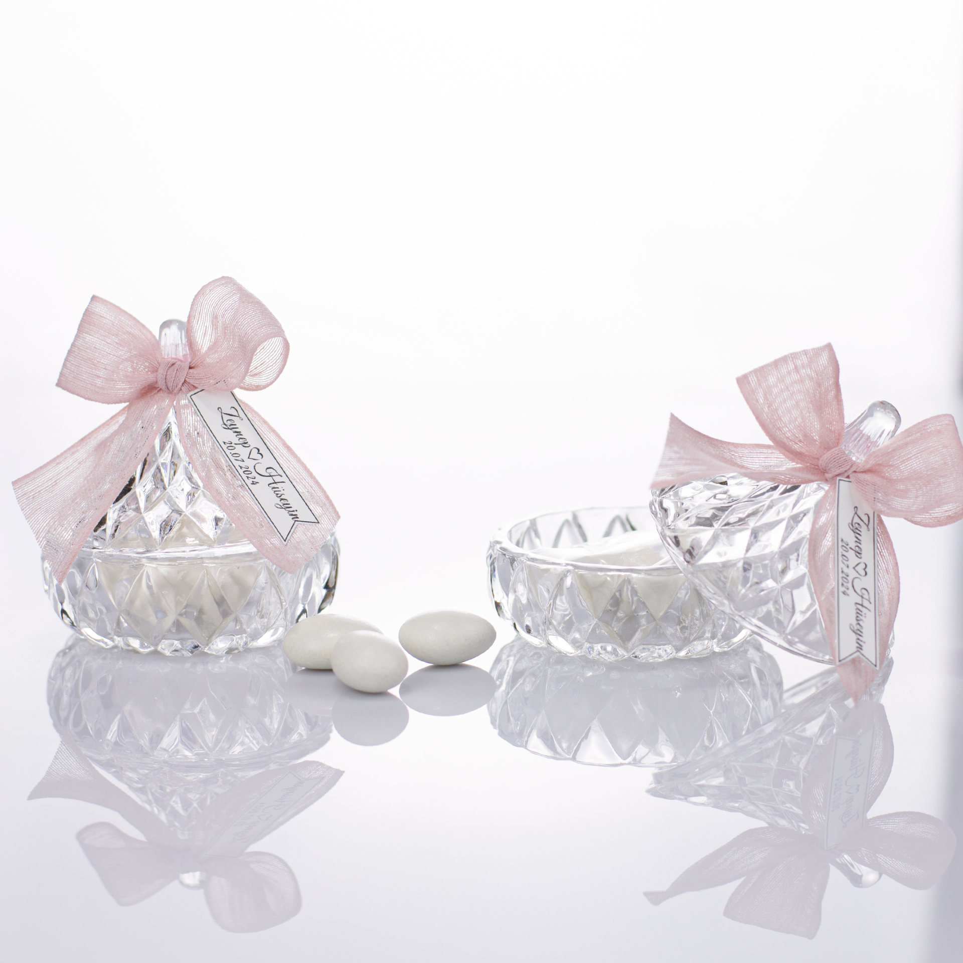 Kesme cam tasarımı ve incir model formu ile zarif ve dikkat çekici bir görünüm sunar. İçerisine badem draje, şekerleme veya küçük ikramlıklar yerleştirilebilir. Farklı keten kurdele renk seçenekleri sayesinde organizasyon konseptine uyum sağlar.