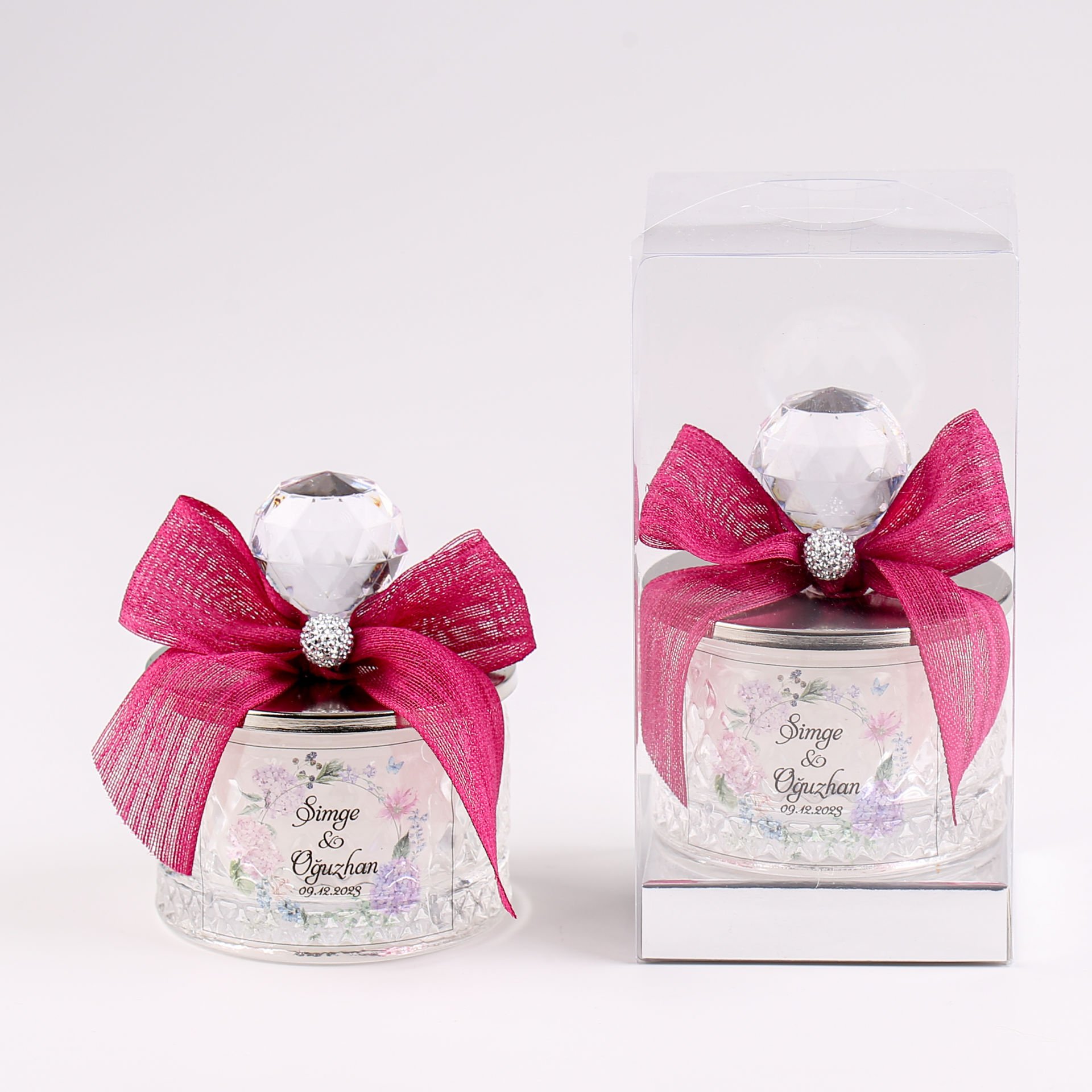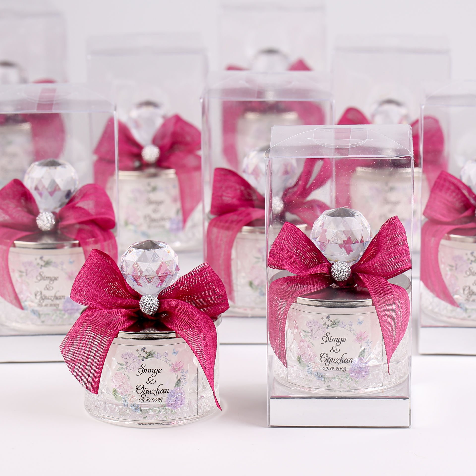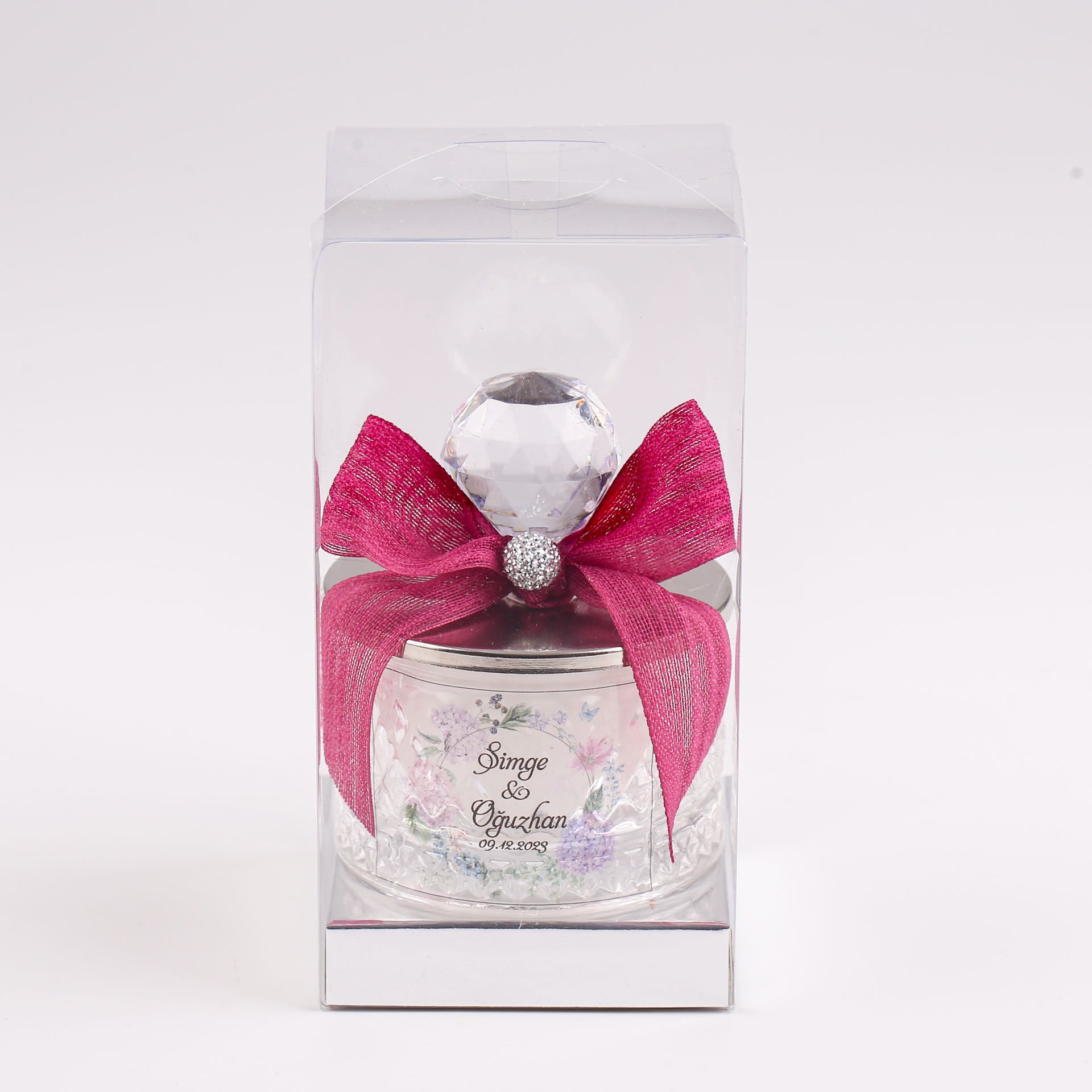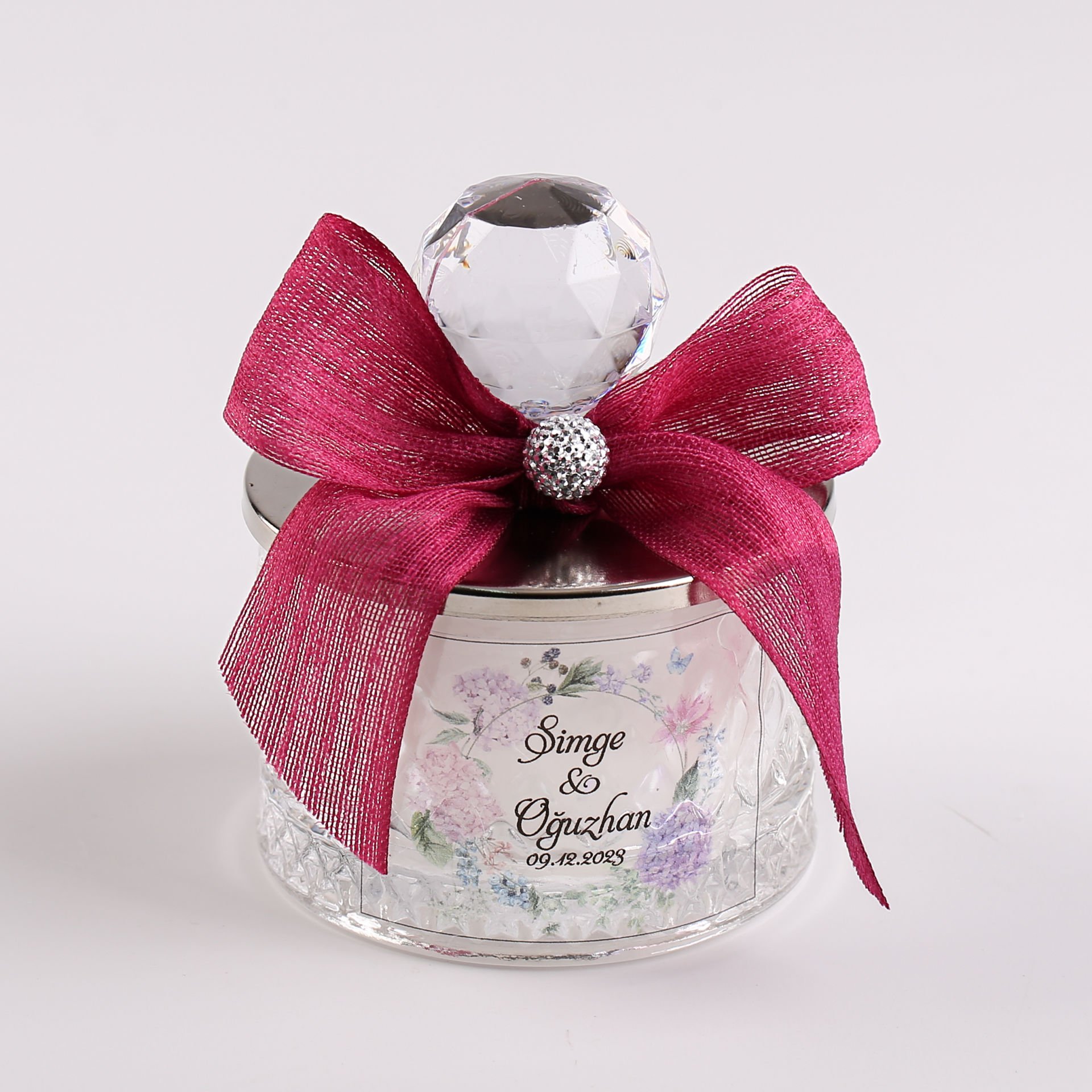 Kristal tepeli baklava desen cam şekerlik mum; zarif ve gösterişli tasarımıyla söz, nişan, düğün, kına gecesi, nikah, mevlit, baby shower ve özel gün organizasyonlarında misafirlere sunulabilecek şık bir hediyelik alternatiftir. Gold veya gümüş detay seçenekleriyle konseptinize uyum sağlar, dekoratif görünümü sayesinde hem hatıra olarak saklanabilir hem de bulunduğu ortama estetik bir dokunuş katar.