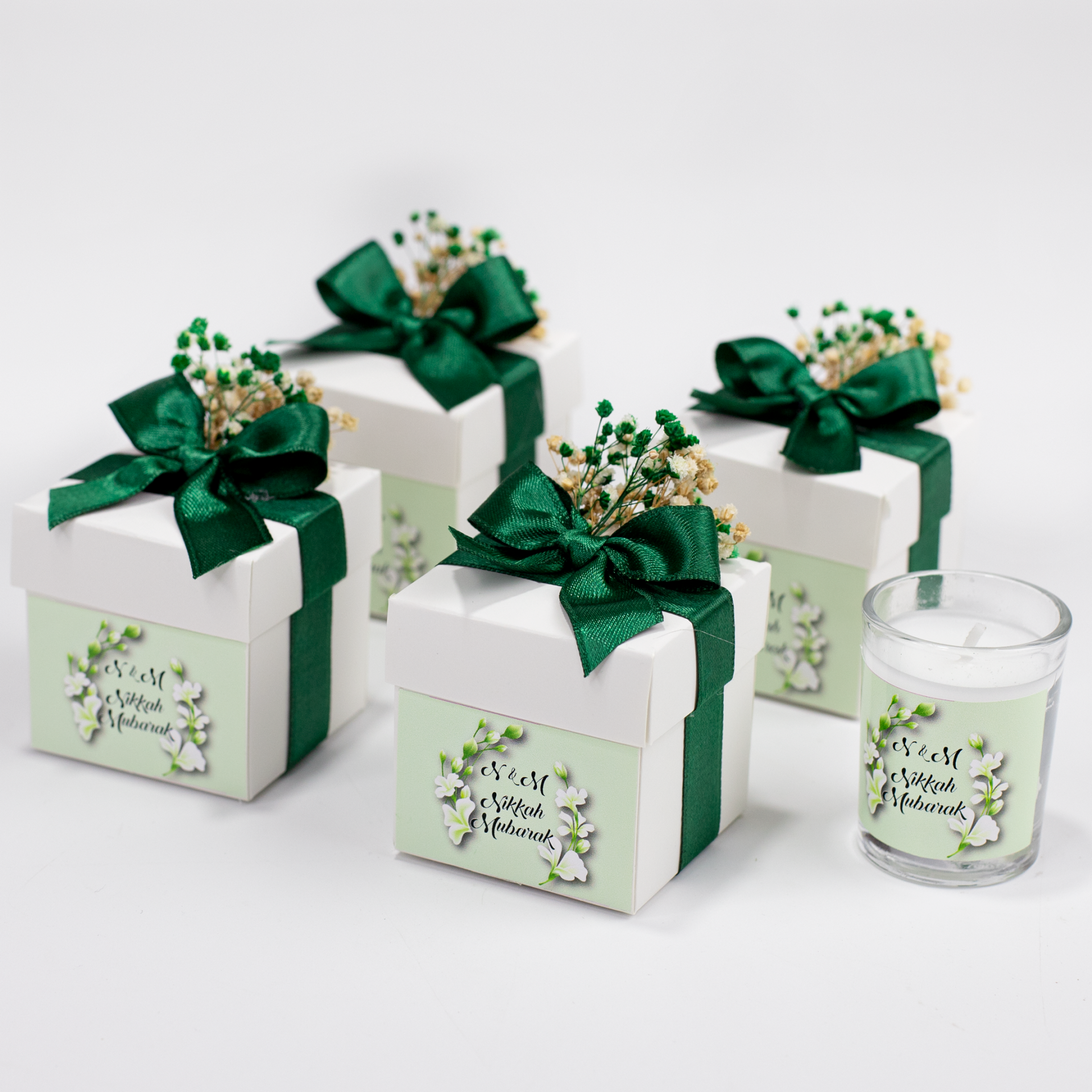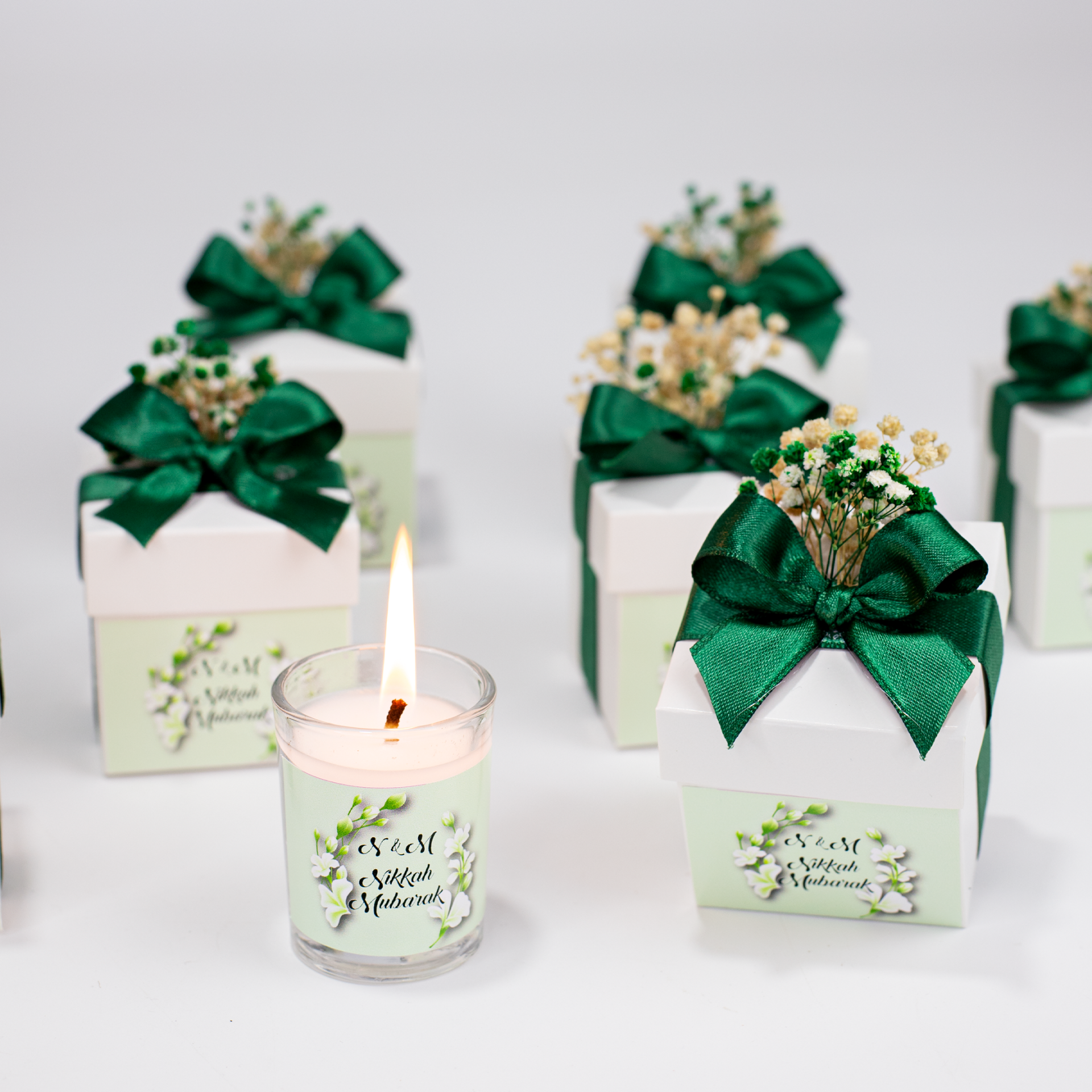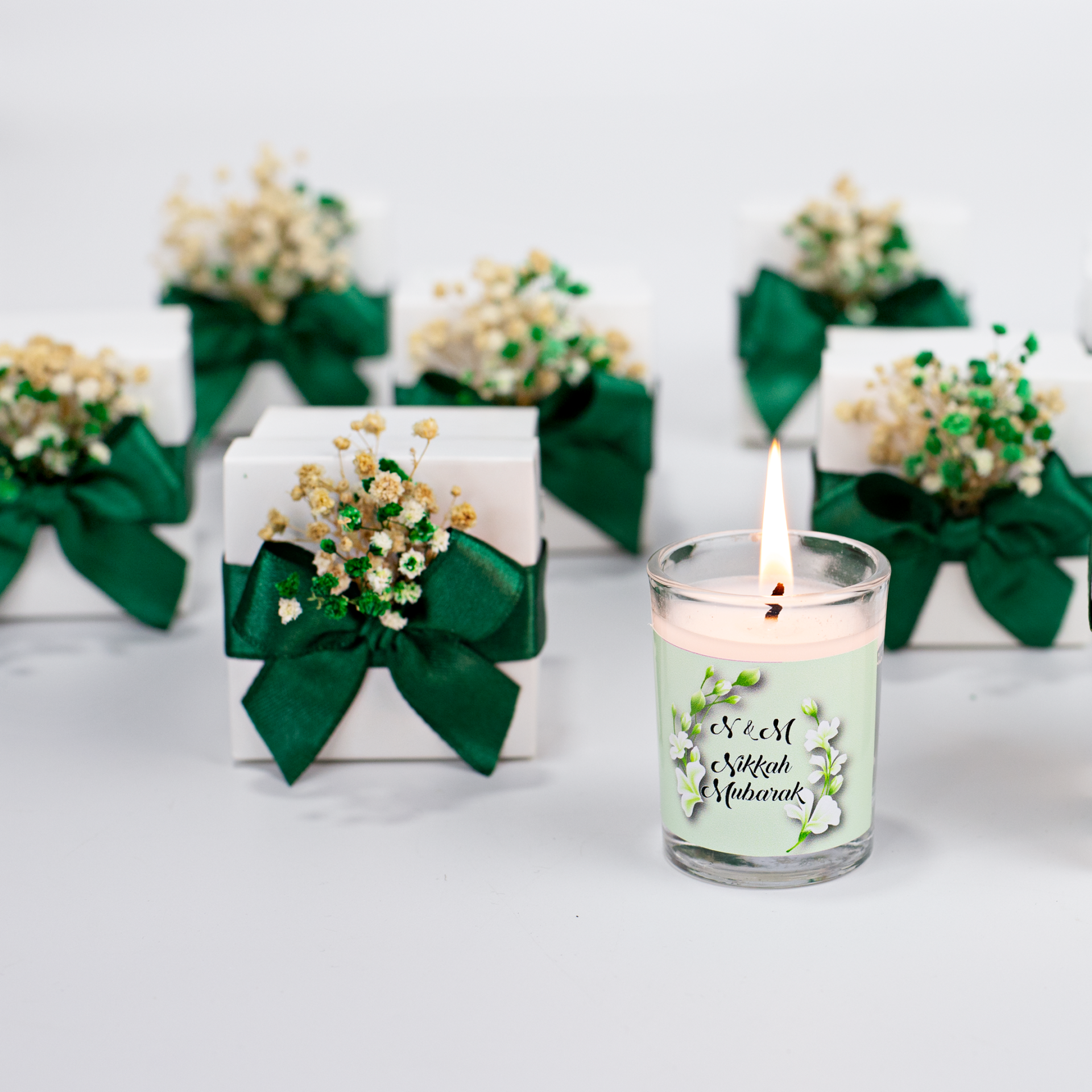 Karton kutu içerisinde sunulan cam bardak mum, saten kurdele ve cipso süslemesiyle zarif bir görünüme sahiptir. Şık tasarımı sayesinde hem hediye alternatifi hem de dekoratif kullanım için tercih edilebilir, sevdiklerinize anlamlı bir hatıra sunmanıza yardımcı olur. Aynı zamanda kız isteme, söz, nişan, kına, düğün ve nikah organizasyonlarında hediyelik olarak kullanıma uygun estetik bir seçenektir.