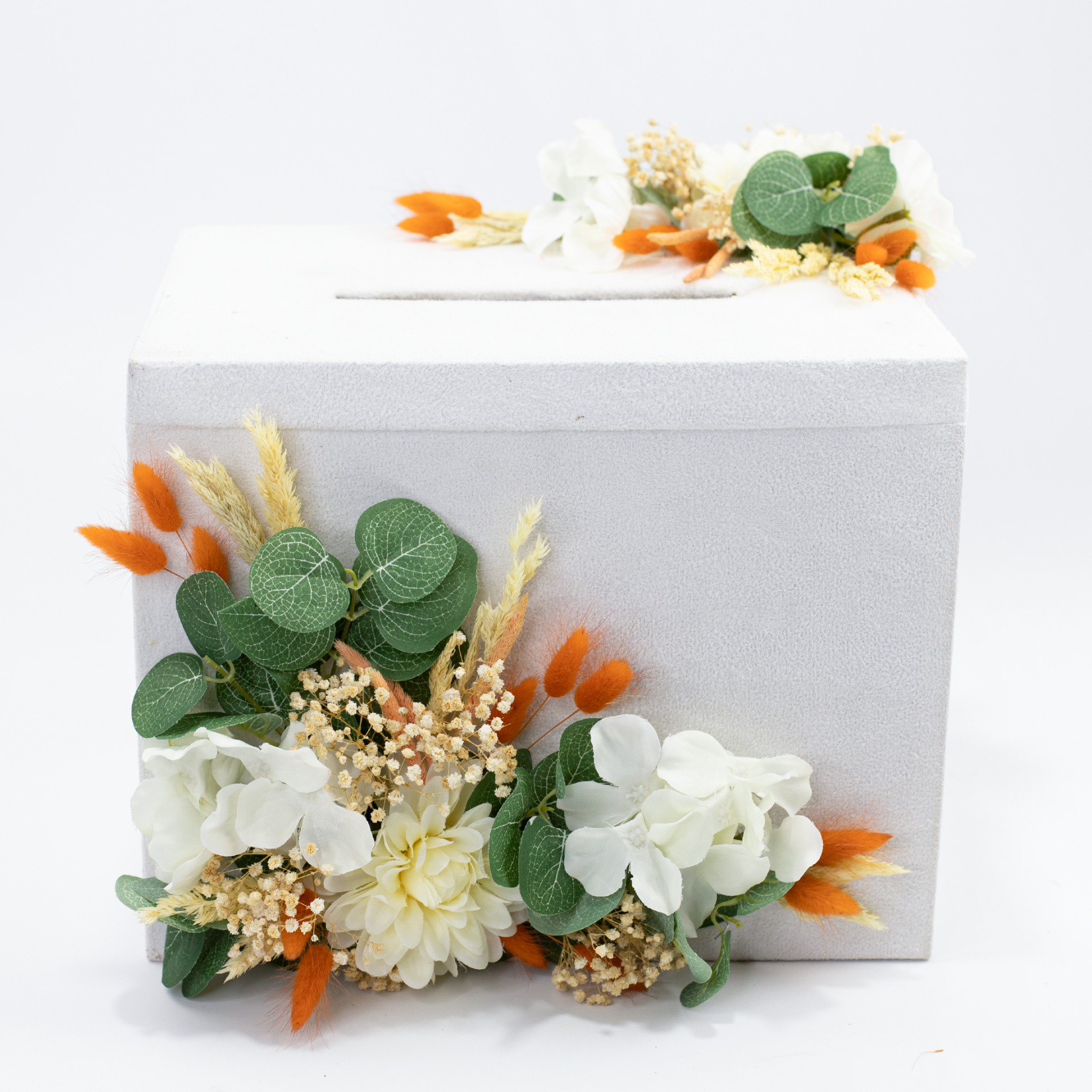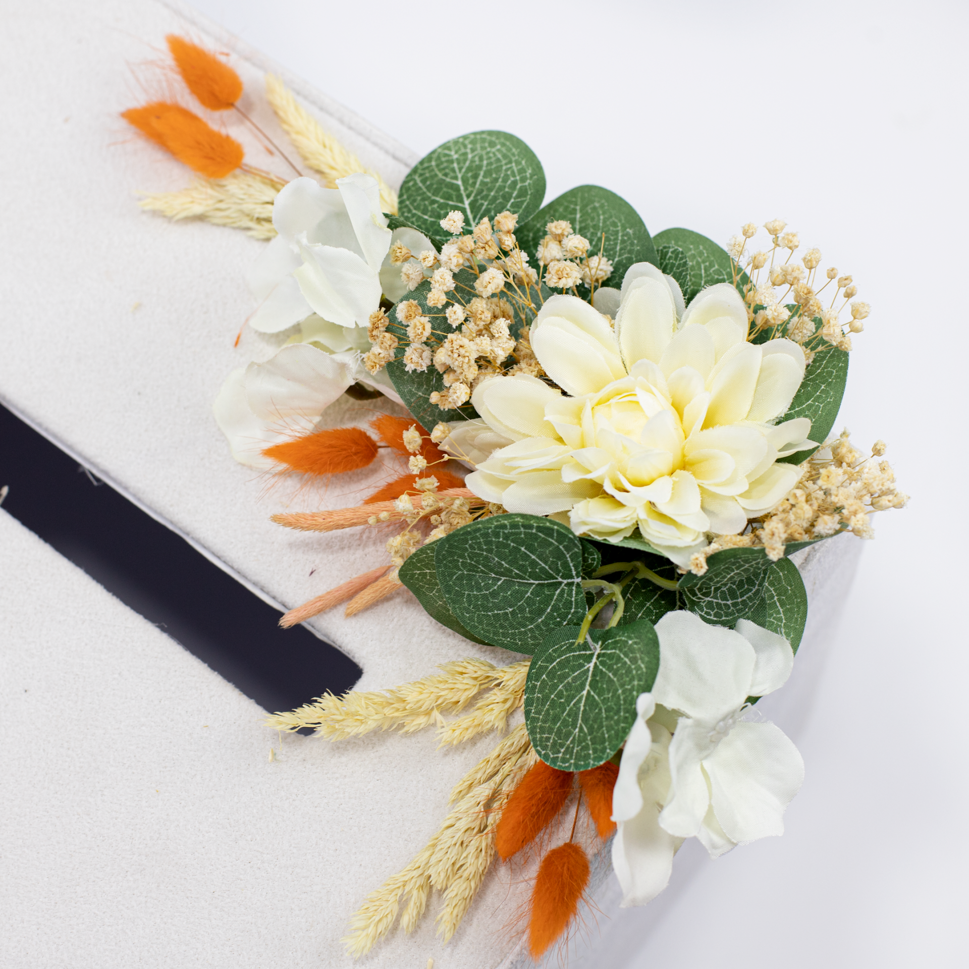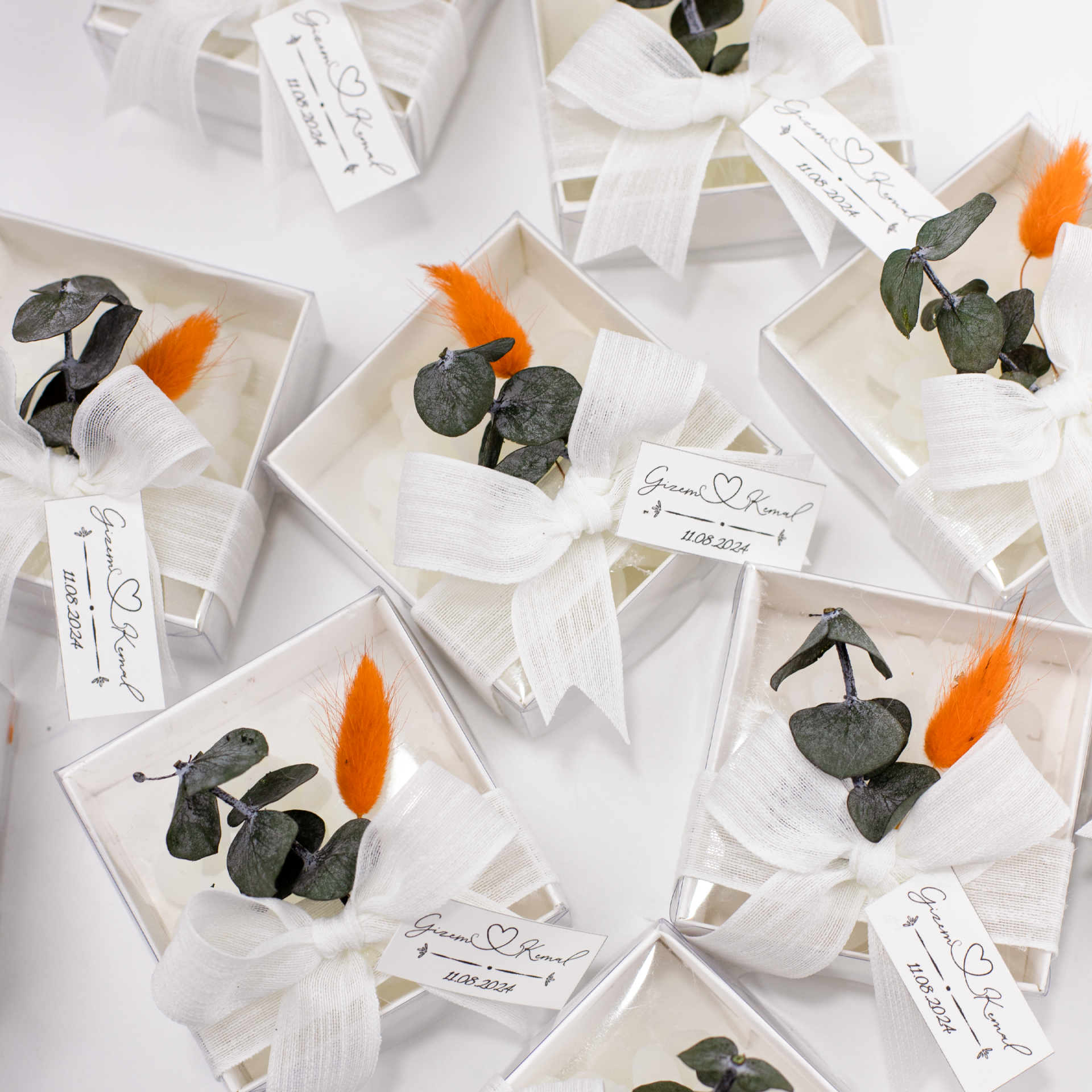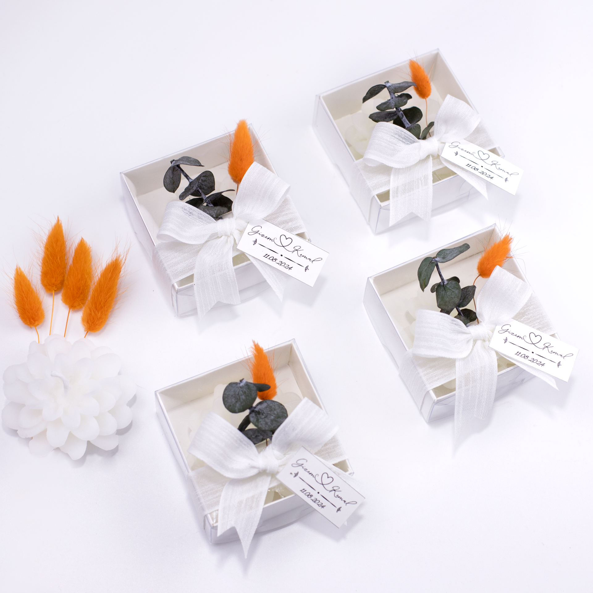 Turuncu pamuk otu ve okaliptus detaylarıyla süslenen kutulu mum, doğal ve şık tasarımıyla söz, nişan, kına, nikah, düğün, mevlit, baby shower ve özel davetlerde zarif bir hediyelik olarak tercih edilebilir. Dekoratif görünümü sayesinde evlerde hoş bir atmosfer oluştururken, isteğe bağlı kişiselleştirme seçeneği ile isim, tarih veya özel not eklenerek organizasyonunuza özel hale getirilebilir. Özel günler için anlamlı bir hediye alternatifi olarak da değerlendirilebilir.