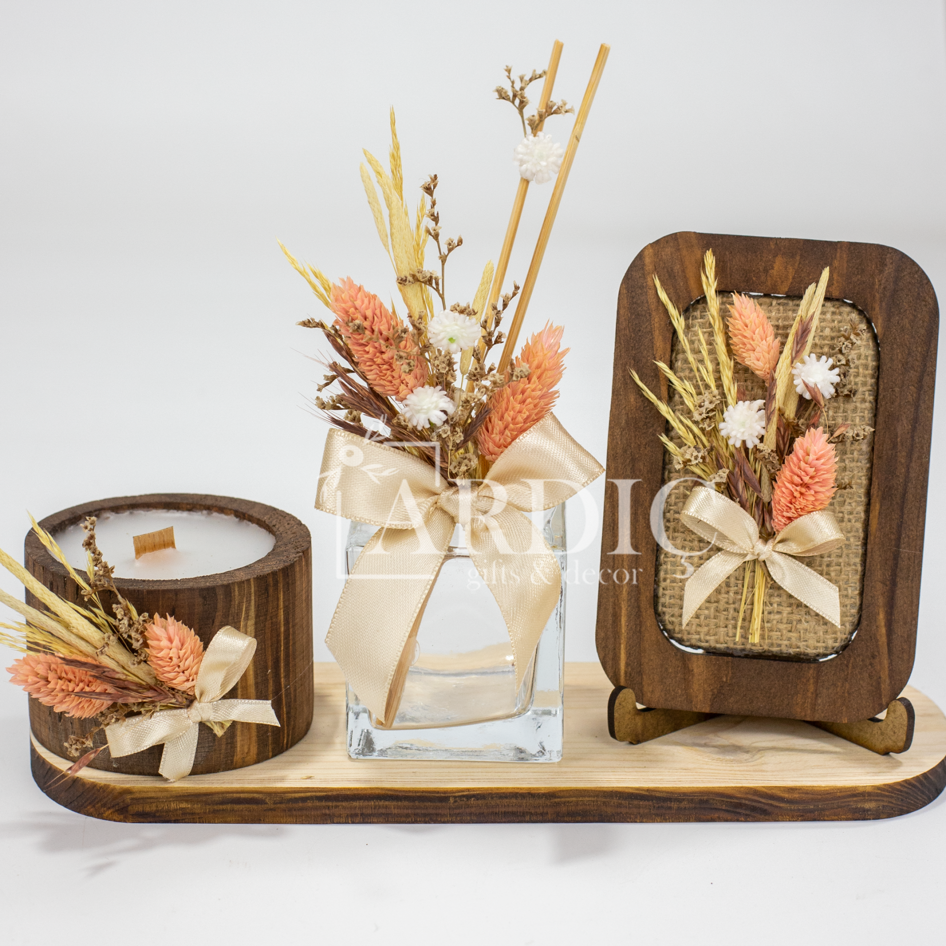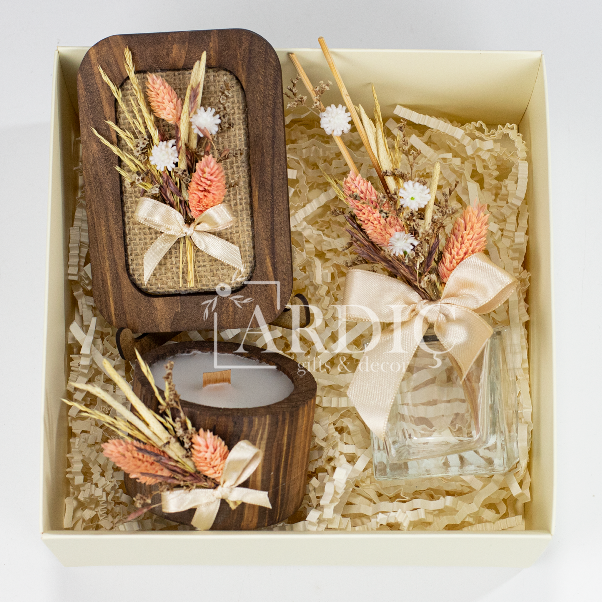 Zarif sunumu ve doğal tasarımıyla hazırlanan bu özel set, anlamlı bir Kadınlar Günü hediyesi arayanlar için özenle oluşturulmuştur. Şık hediye kutusu içerisinde dekoratif mum, cam şişe oda kokusu ve ahşap zeminli kuru çiçek pano yer alır. Hem estetik hem de kullanışlı parçaları bir araya getiren bu set, kalıcı ve şık bir Kadınlar Günü hediyesi seçeneği sunar. Özel günlerde annenize, eşinize ya da sevdiklerinize verebileceğiniz unutulmaz bir Kadınlar Günü hediyesi olarak tercih edebilirsiniz.