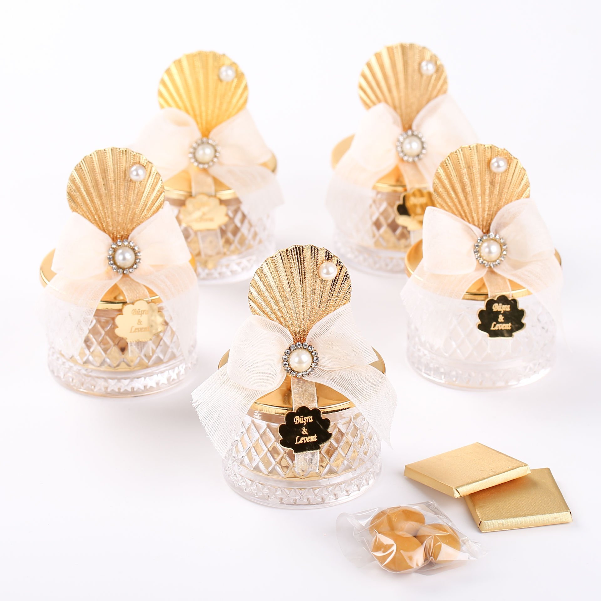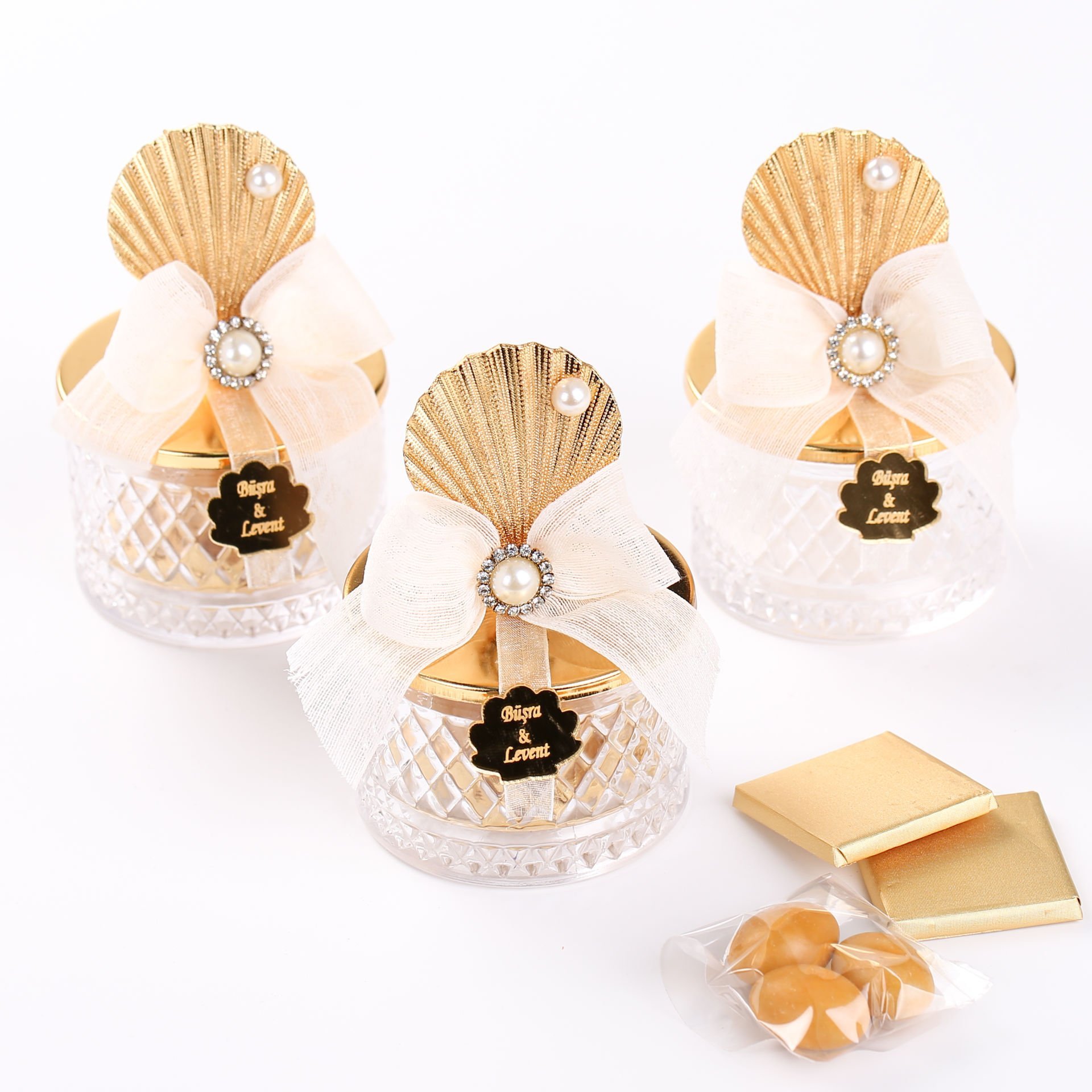 Zarif metal istiridye tepeli kristal drajelik, özel günlerinizde misafirlere şık ve lezzetli bir ikramlık sunmak için mükemmel bir tercihtir. İçeriğindeki 2 adet çikolata ve 3 adet badem draje, düğün, nişan, söz ve diğer özel günlerde kullanılabilir. Kutulu ya da kutusuz seçenekleriyle, kişisel tercihlere göre sunulabilir ve estetik bir hediye alternatifi oluşturur.