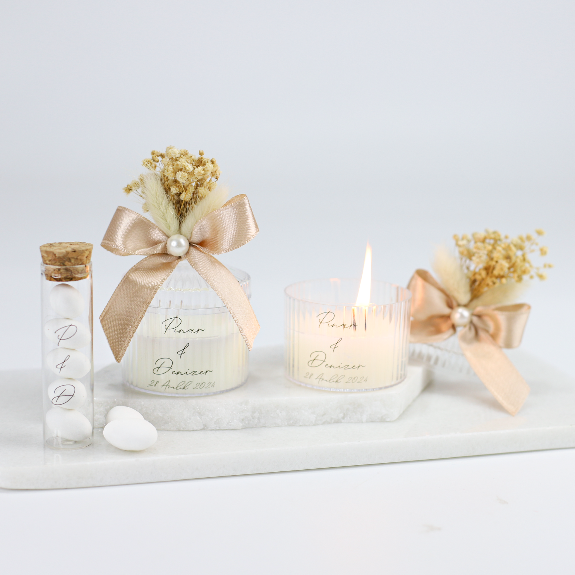 Şeffaf çanta içerisinde hazırlanan mika mum ve tüp draje seti, kız isteme, söz, nişan, düğün ve nikah organizasyonlarında zarif bir hediyelik alternatifi olarak tercih edilebilir. Şık ve düzenli sunumuyla farklı konseptlere uyum sağlar ve misafirlerinize özel gününüzü hatırlatacak anlamlı bir hatıra sunmanıza yardımcı olur. Özel davetler ve çeşitli organizasyonlar için de kullanıma uygundur.