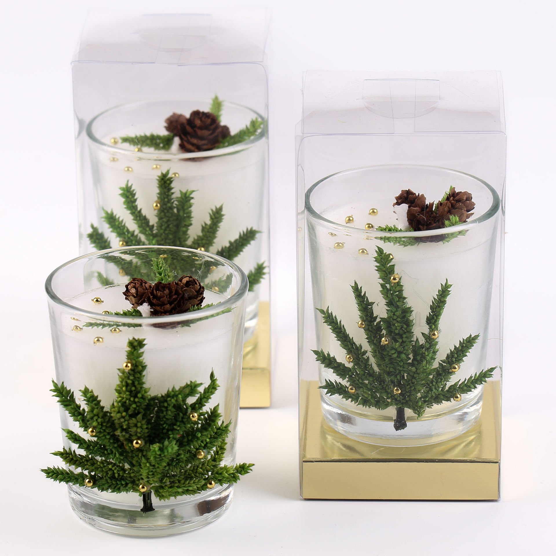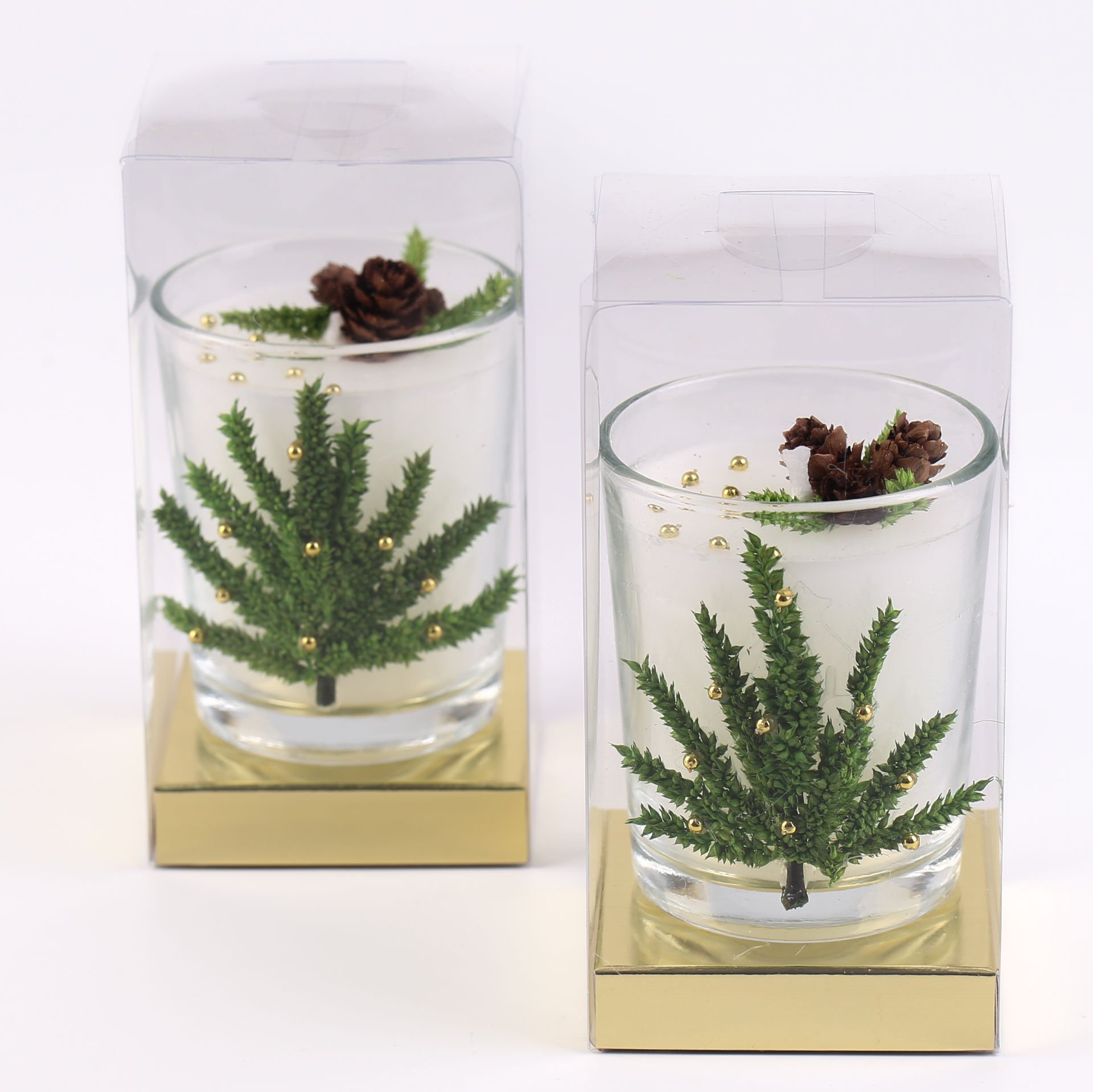 Mini kozalak ve çam ağacı süslemeleri sayesinde yılbaşı konseptine uyum sağlar. Büyük cam bardak formu ile hem dekoratif hem kullanışlı bir mum alternatifi sunar. Yükselticili gold asetat kutu içinde sunulması sayesinde şık bir hediye görünümü sağlar.