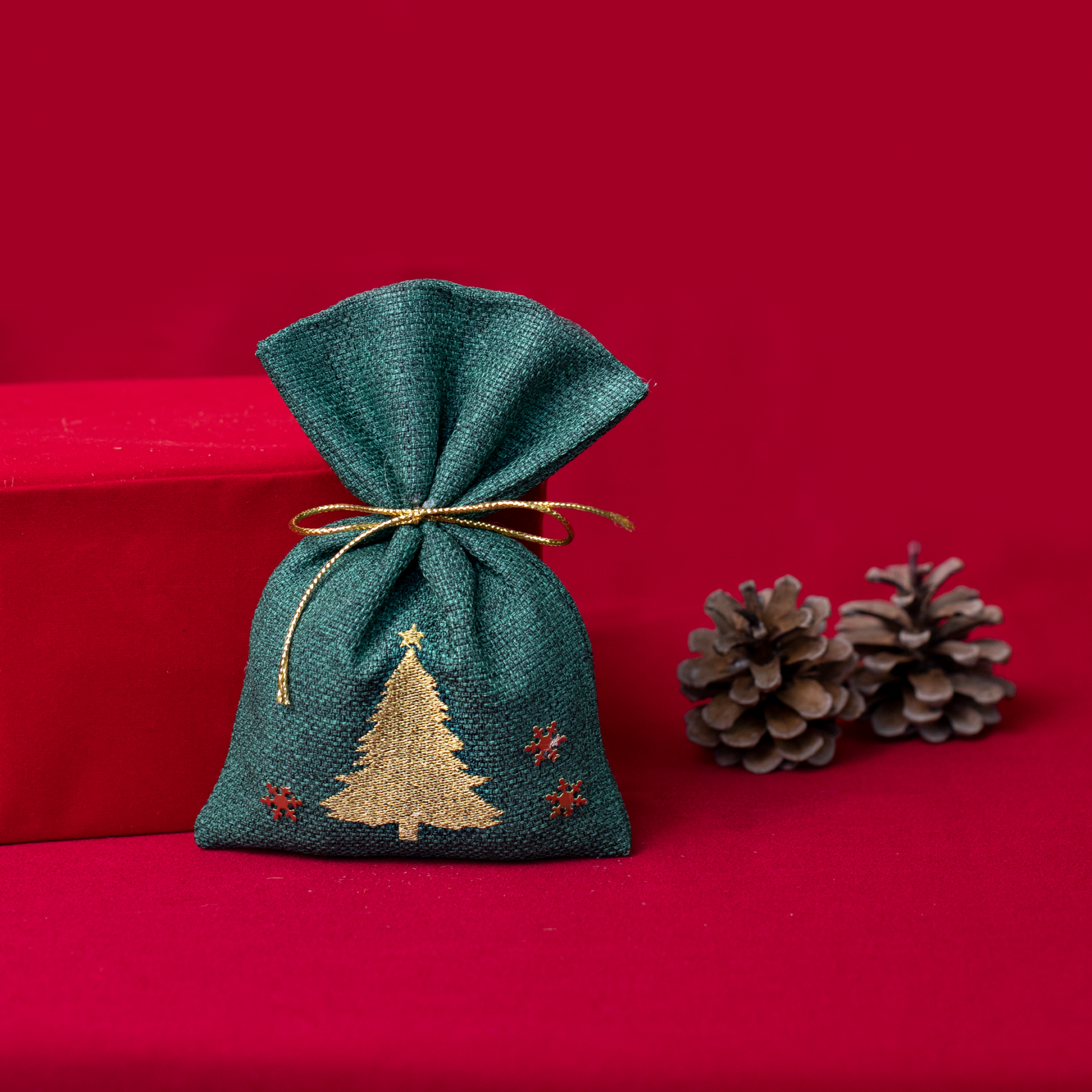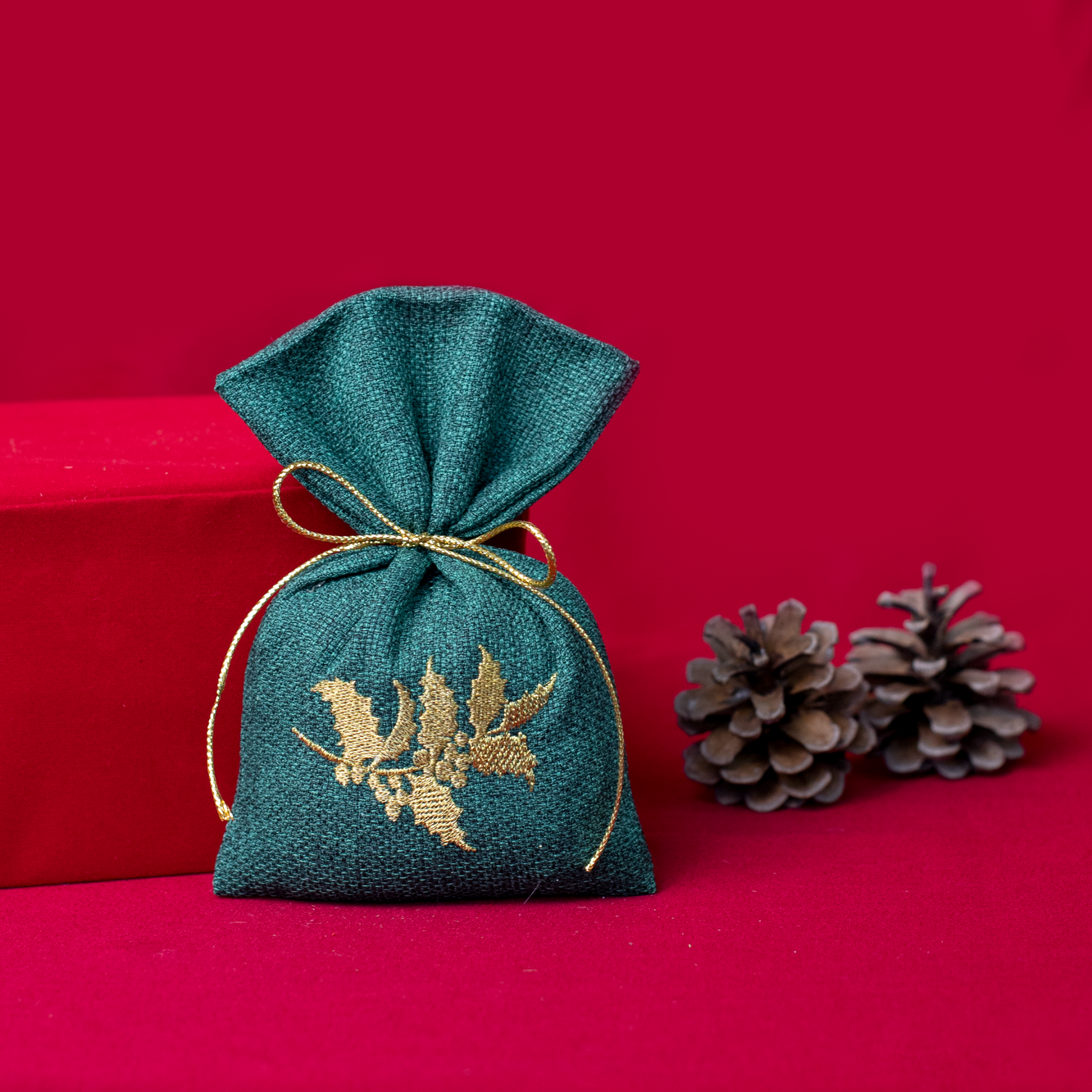 Nakışlı Kese – Yeşil Keten Yılbaşı modeli, yılbaşı hediyelikleri, yeni yıl organizasyonları, ofis yılbaşı partileri ve kurumsal yıl sonu etkinlikleri için tercih edilebilecek dekoratif bir hediye kesesidir. Yılbaşı davetleri, butik yeni yıl etkinlikleri ve kurumsal hediye dağıtımlarında içerisine çikolata, mum, sabun veya küçük promosyon ürünleri konularak sunum amaçlı kullanılabilir.