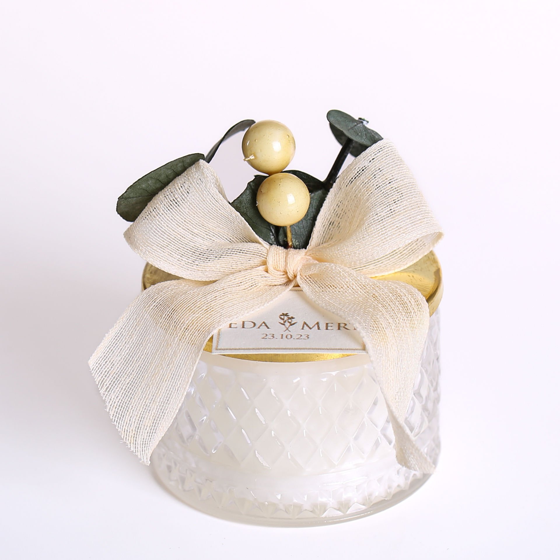 Okaliptus süslemeli baklava desenli kesme cam mum, özel günlerinizde zarif bir atmosfer yaratmak için mükemmel bir tercihtir. Şık baklava desenleri ve okaliptus süslemeleriyle hem dekoratif hem de estetik bir görünüme sahip olan bu mum, düğün, nişan, kına gecesi ve diğer özel günlerde kullanılabilir. Mum çapı 7 cm ve yüksekliği 9 cm ile zarif bir sunum sağlar.