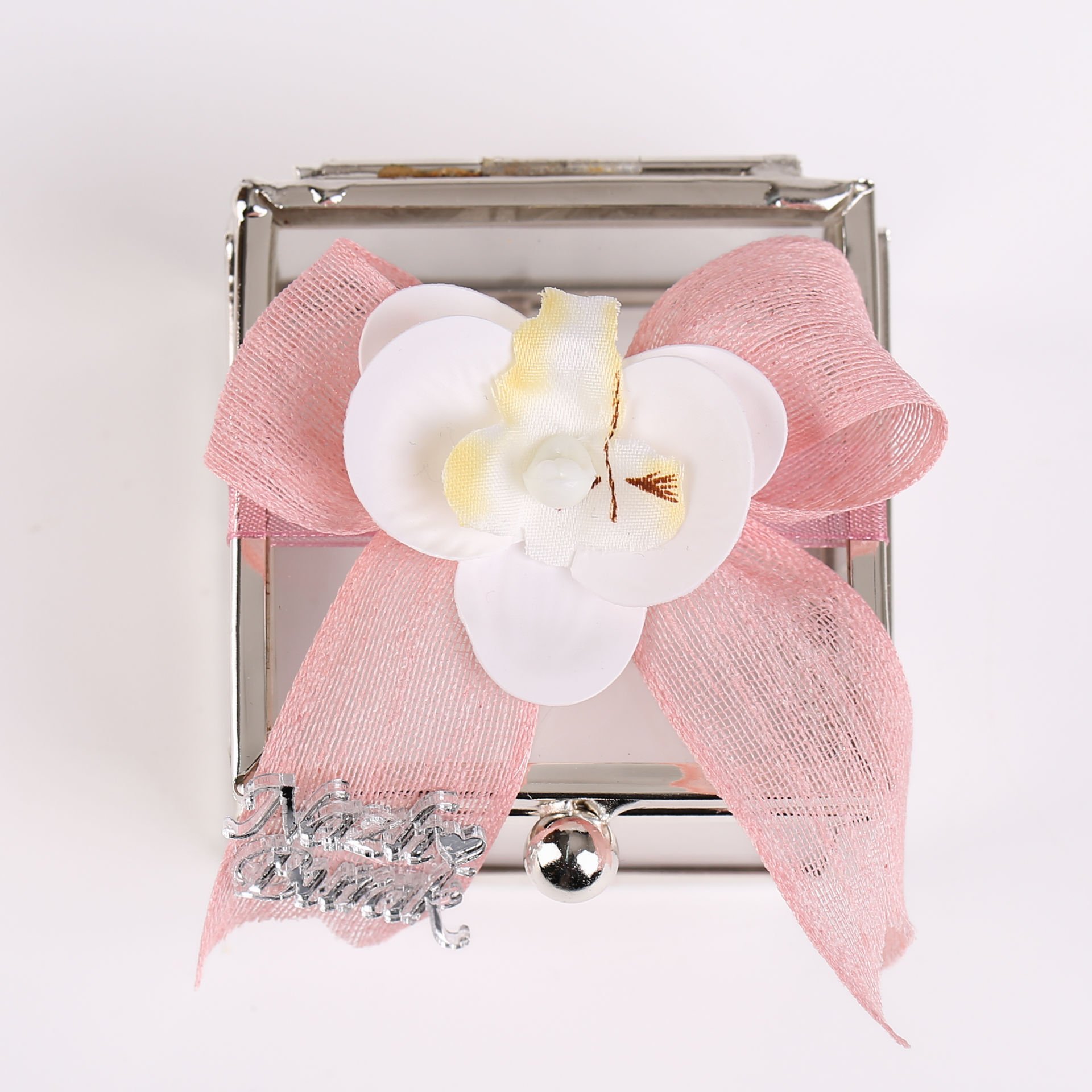 Orkide Süslü Kare Cam Kutu - Pembe Kurdele