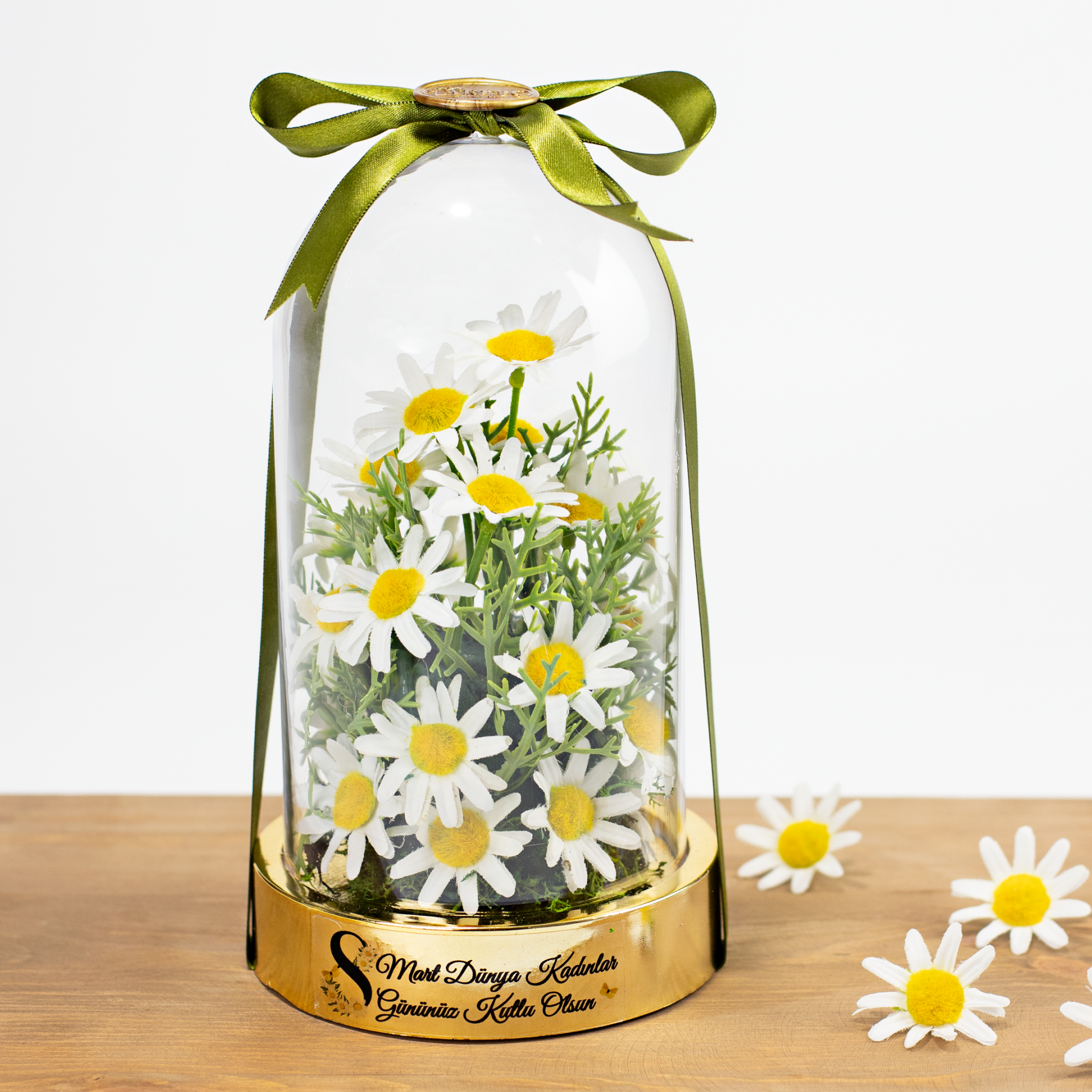 Kadınlar Gününe özel süslenmiş bu cam fanus içindeki papatya aranjmanı, sevdiklerinize kendilerini özel hissettirecek anlamlı bir Kadınlar Günü hediyesidir. Zarif tasarımı ve özenle yerleştirilmiş çiçekleri sayesinde masa veya raf üzerinde dekoratif bir dokunuş yaratır. Hem estetik hem de anlam dolu bir hediye arayanlar için unutulmaz bir alternatif olarak öne çıkar.