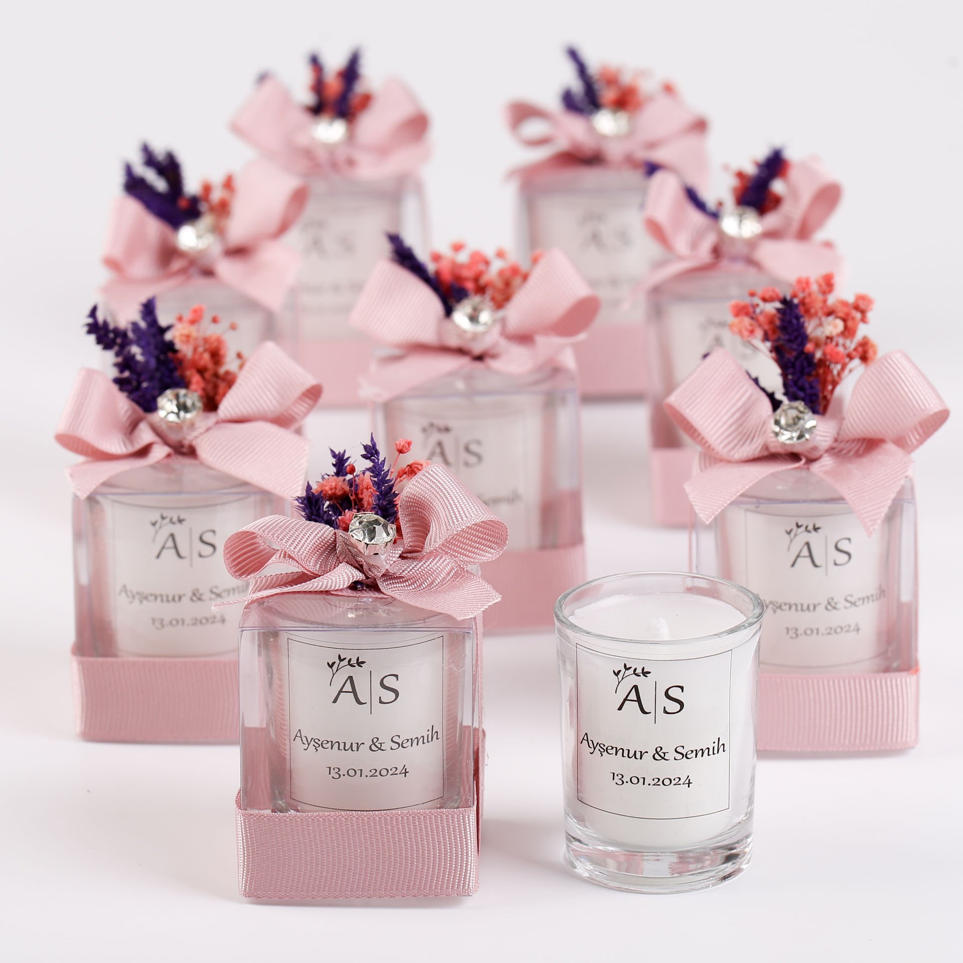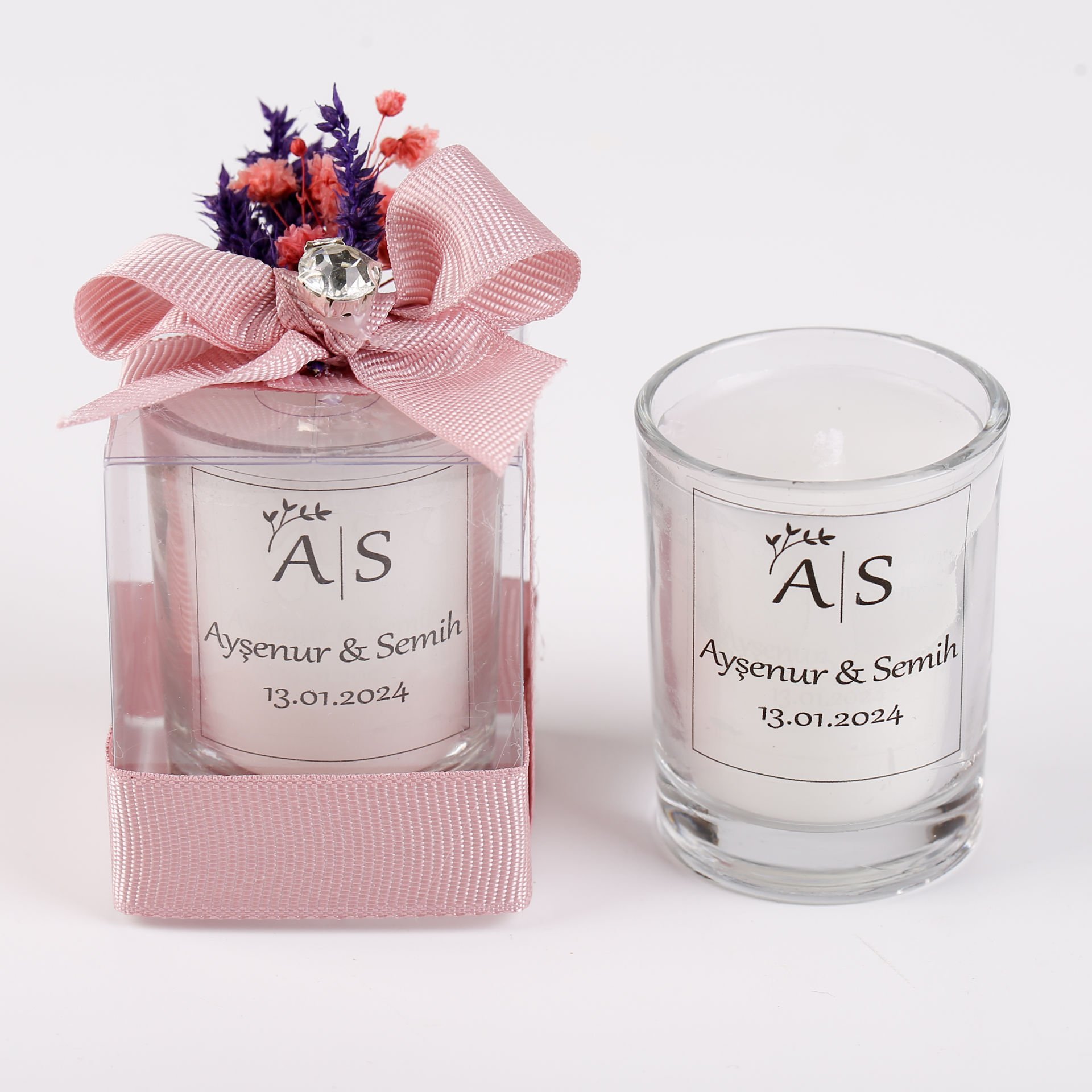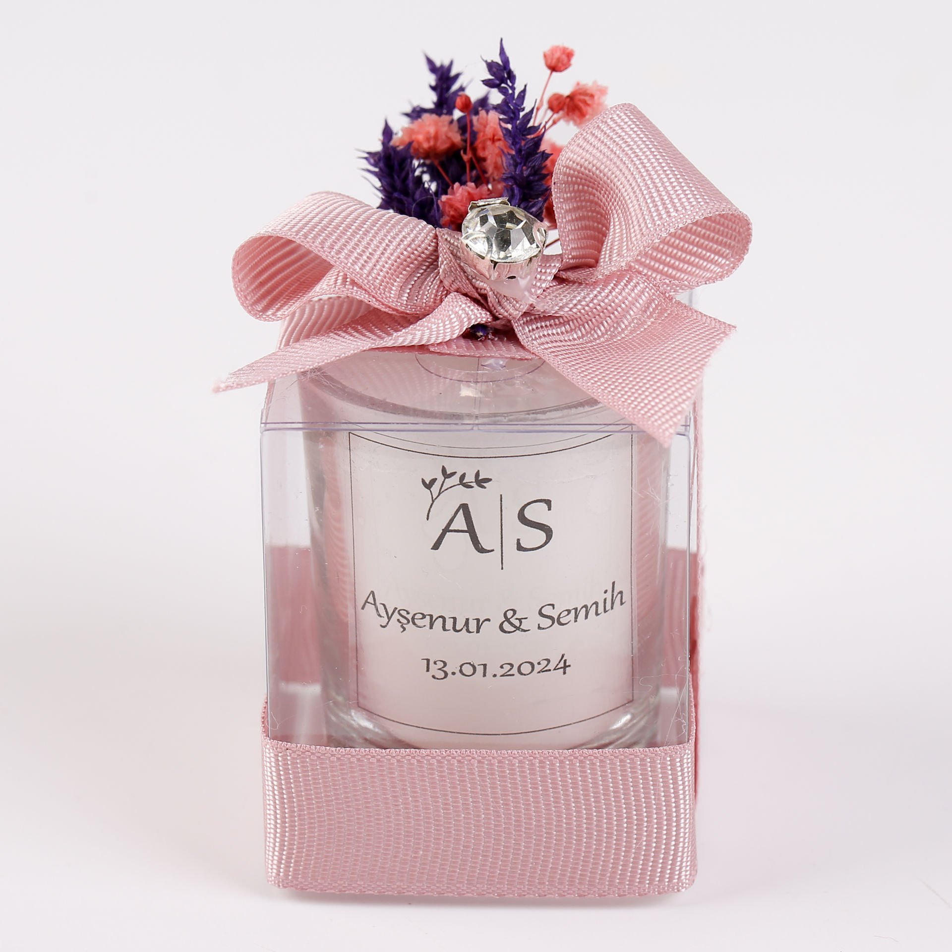 Pembe ve mavi çiçek süslemeleriyle hazırlanan cam bardak mum; zarif ve renkli görünümüyle söz, nişan, düğün, kına gecesi, nikah, baby shower, doğum, mevlit ve özel gün organizasyonlarında misafirlere sunulabilecek şık bir hediyelik alternatiftir. Kurdele ve taş detaylı asetat kutu sunumu sayesinde dekoratif bir bütünlük sağlar ve özel günlerden hatıra olarak saklanabilir.